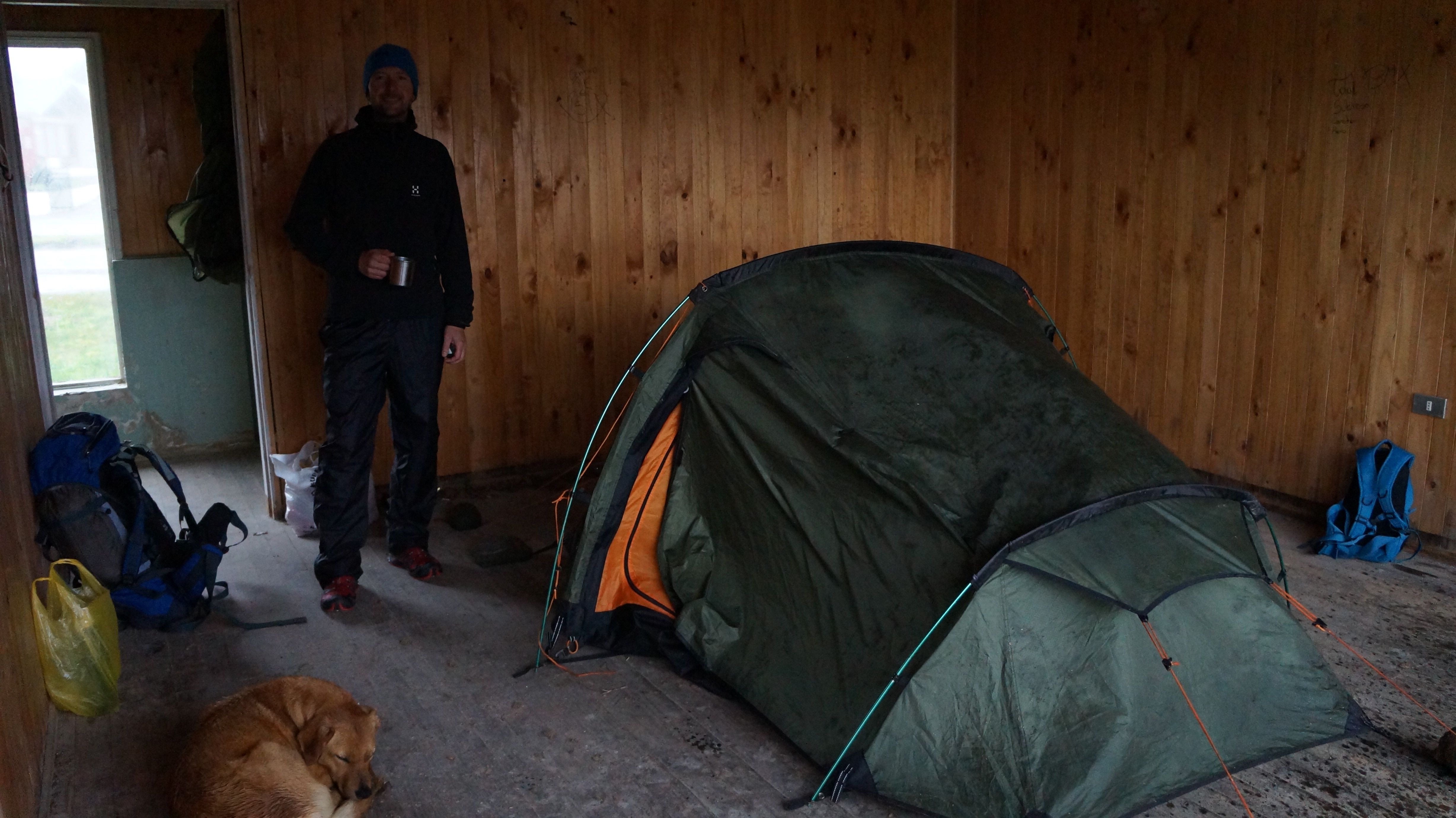 Our first stop in the village was with a tourist agency called Chaitur which is run by a very knowledgable Canadian called Nicholas Penner. As we were keen to keep our costs down, Nicholas suggested that we could camp for free in an abandoned craft market just along the beach front and which would offer us some shelter in ‘rainy Chaiten’. So this became our home for the next few days. Our plan was to use the free days, before taking the ferry, to visit Pumalin Park which is covered in pristine rainforest and filled with hiking opportunities to lakes and stunning views over active volcanos however, the persistent heavy rain meant the road leading up to the park was virtually inaccessable and all views were obscured by low-lying cloud. Our ‘home’ for the next few days was certainly ‘unique’ and something we will probably never experience again.