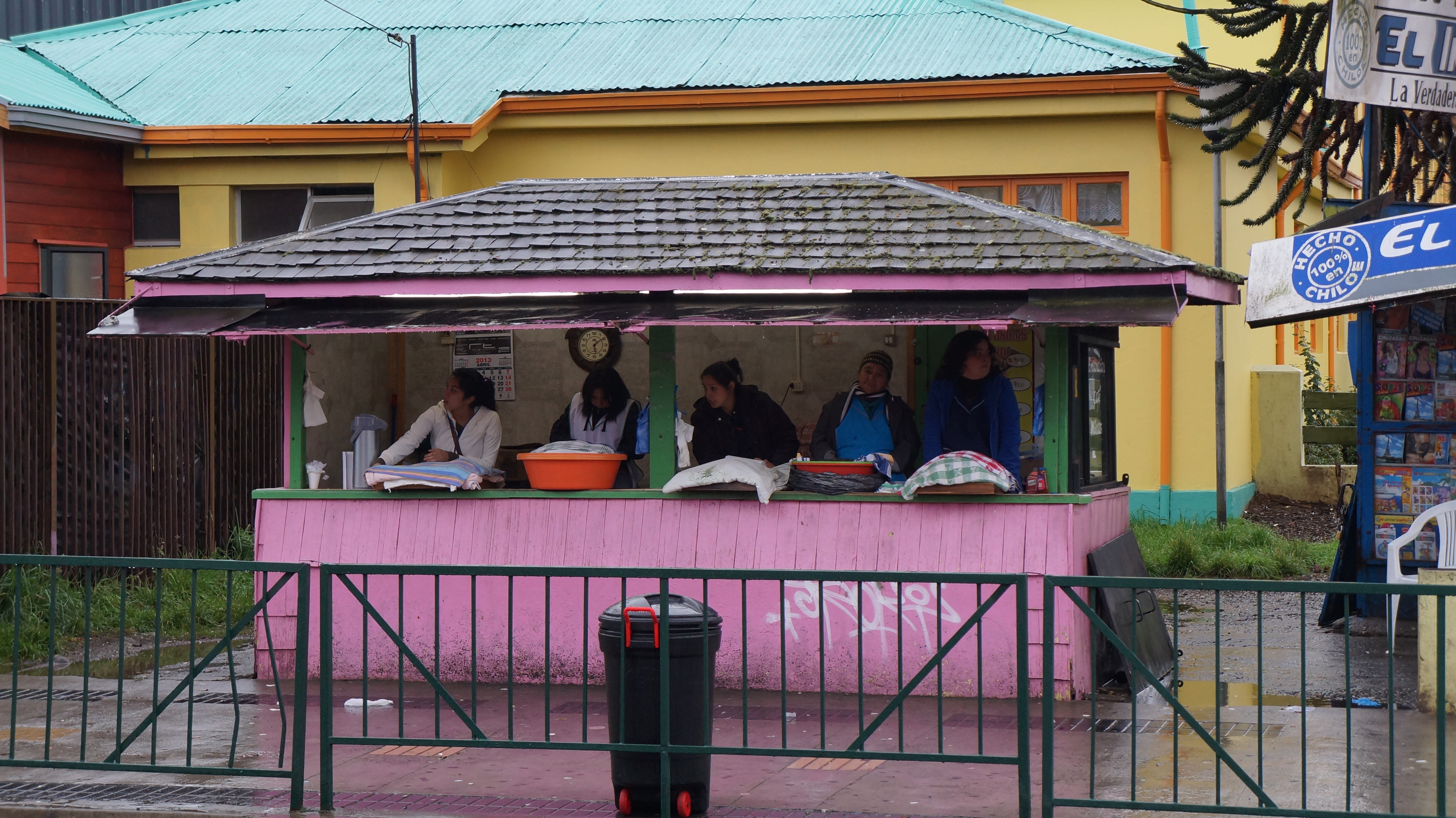The outside of the buildings have been shingled and painted in bright colours. Several of the Palafitos have had balconies added to extend the living space and wood burning stoves pump out smoke from tiny chimneys. Not an attraction set up for the tourists, we observed people living in the Palafitos and going about their daily business – wives hanging out the washing and children playing by the water.