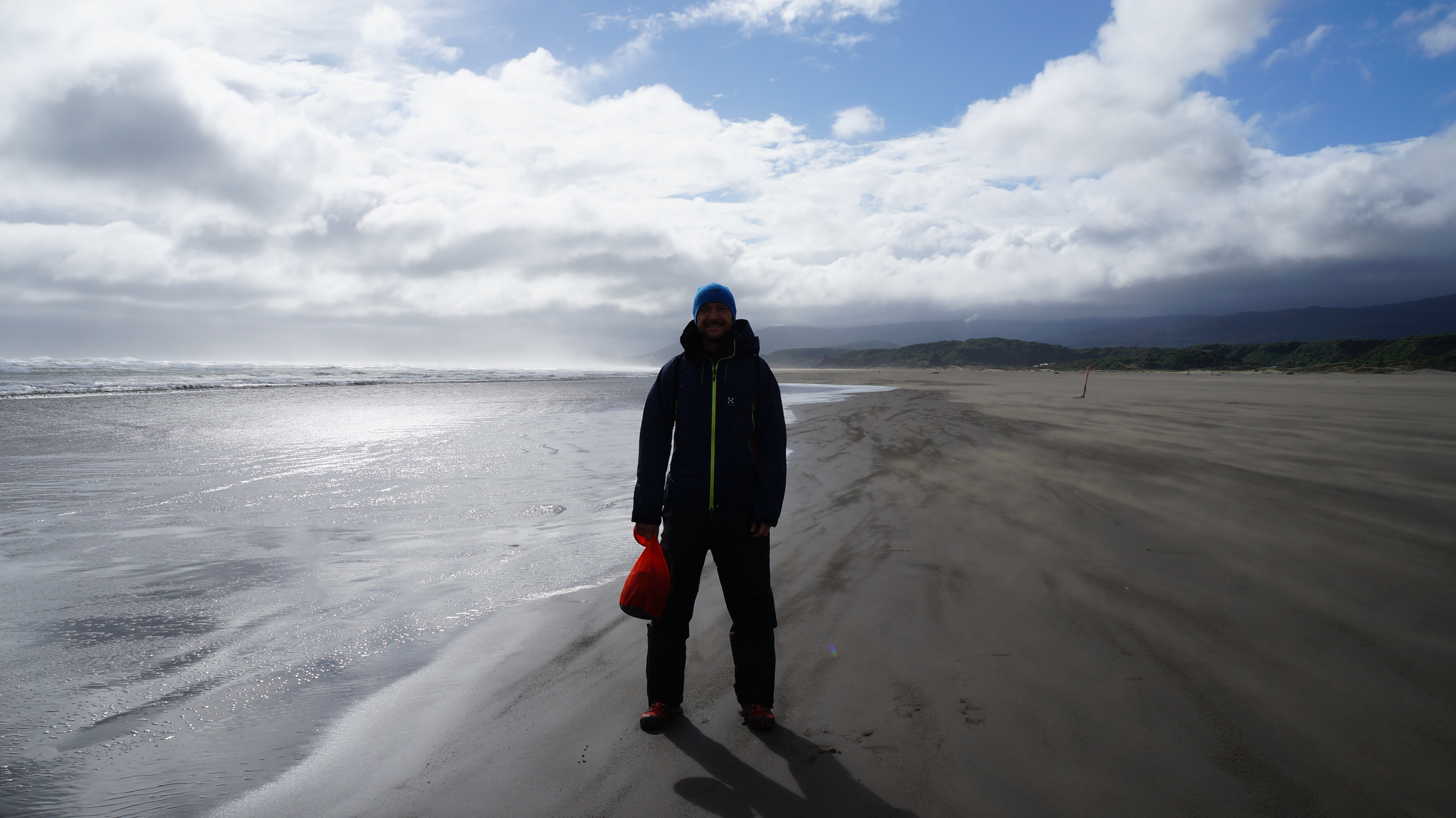 The Pacific waves crashed on the shore and strong winds sent a conveyor belt of sand blasting into the distance. The wind was so strong at times, it was almost possible to stand at a 45 degree angle and not fall over!