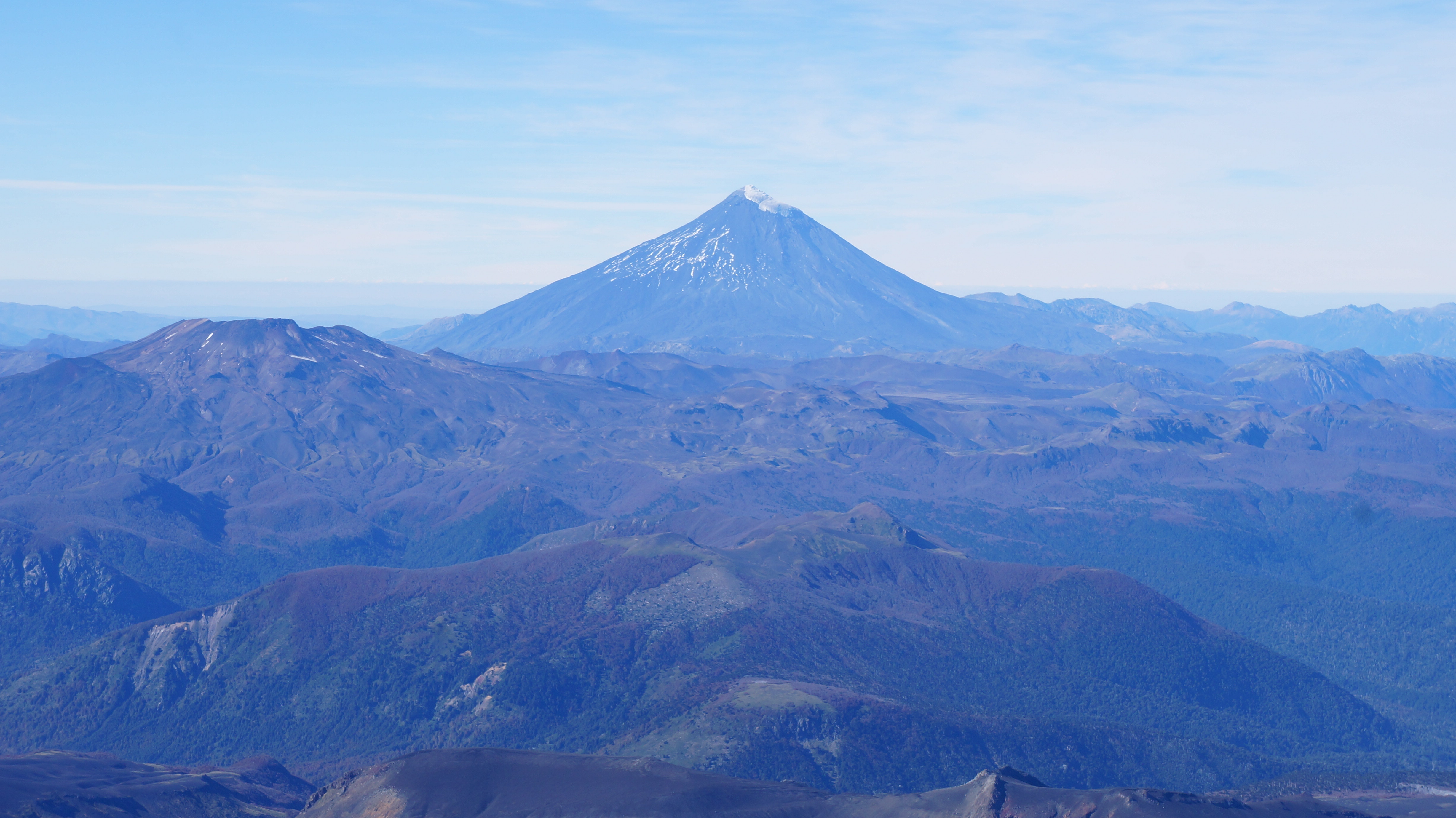 A line of volcanos filled the horizon like giant snow-covered teepees.