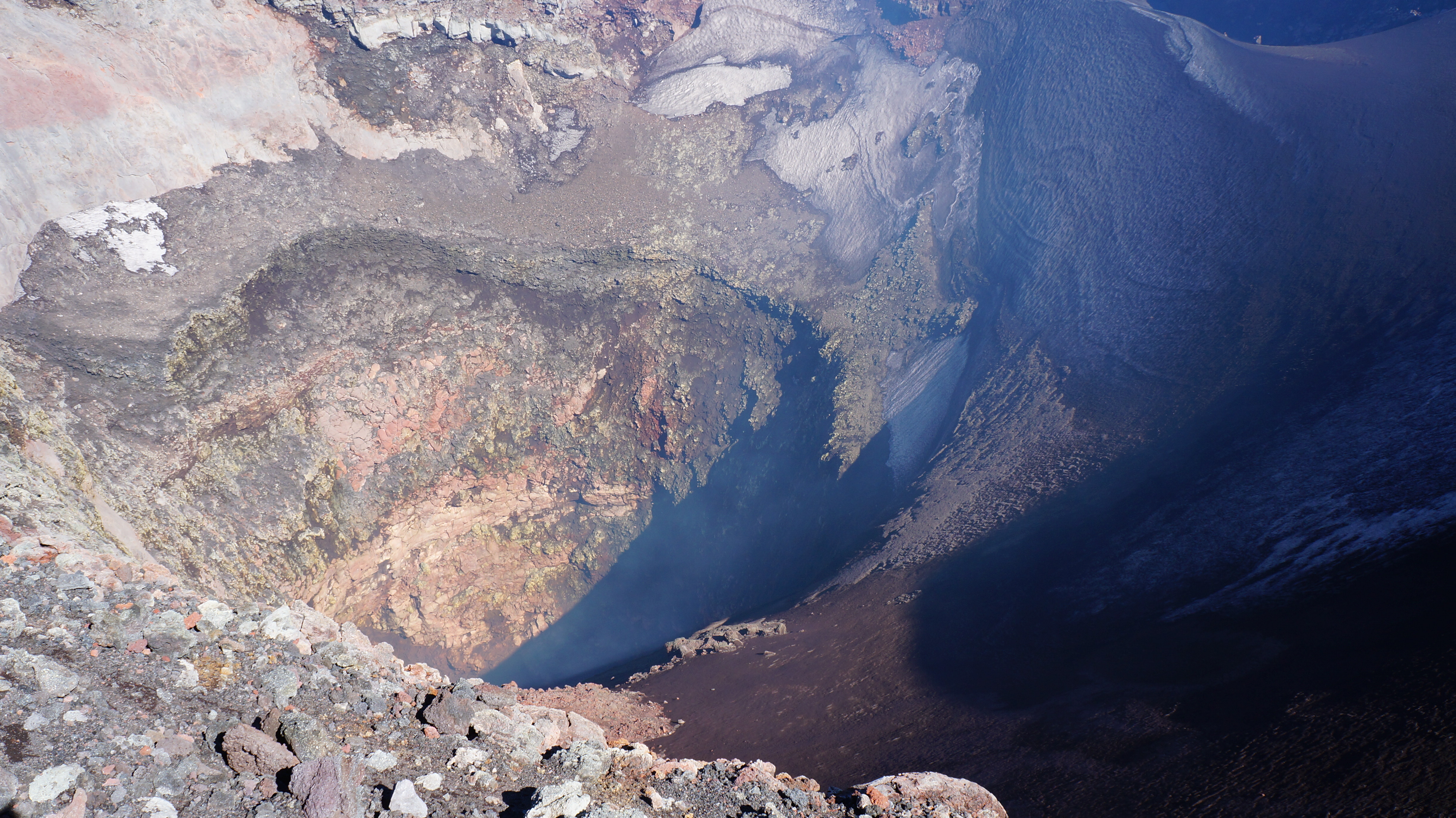 We took a few minutes to catch our breath and then to take in what our eyes were seeing. In front of us lay a huge, oval-shaped crater with sulphuric steam drifting out. Around the crater there was a layer of ice and once past the crater lip, the walls slid down steeply into a smaller, dark cavernous hole.