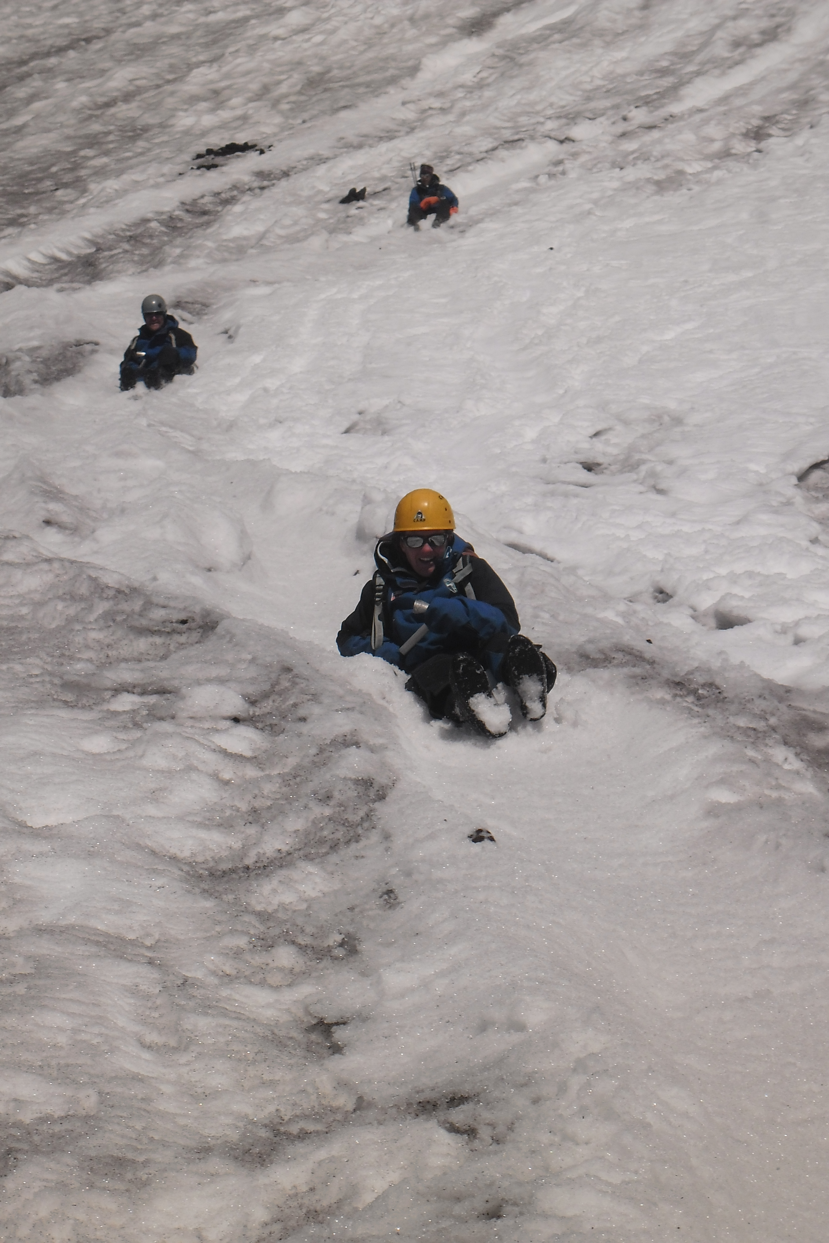 Before heading back down we kitted up with our waterproof gear and put on what our guide called ‘the diapers’ which were indeed like giant waterproof nappies. To add a huge amount of excitement to the climb down and to speed up the return leg, the mountain guides have created toboggan runs in the snow – wide enough to fit a person sitting down and high enough to prevent you from flying out of the run on the corners. Roughly 5 or 6 of these runs cut a 2 hour upwards climb down to a 25 minute downward slide. The runs are steep and without proper control the speeds can be break neck so sitting in a certain position and using the ice axe as a break is imperative. The guide gave everyone a demonstration and slid down the first run like a Winter Olympic athlete. “He’s done this before” someone joked! Then the first volunteer was called upon and a confident young Polish guy stepped forward. He sat in the snow and lowered himself into the steep gully – “One…Two…Three” WHOOSH! He was off on a rollercoaster ride down the slope. Another guide stood at the bottom of the chute just in case the brakes failed and he needed to step in and stop ‘the slider’ from taking off from the side of the mountain.