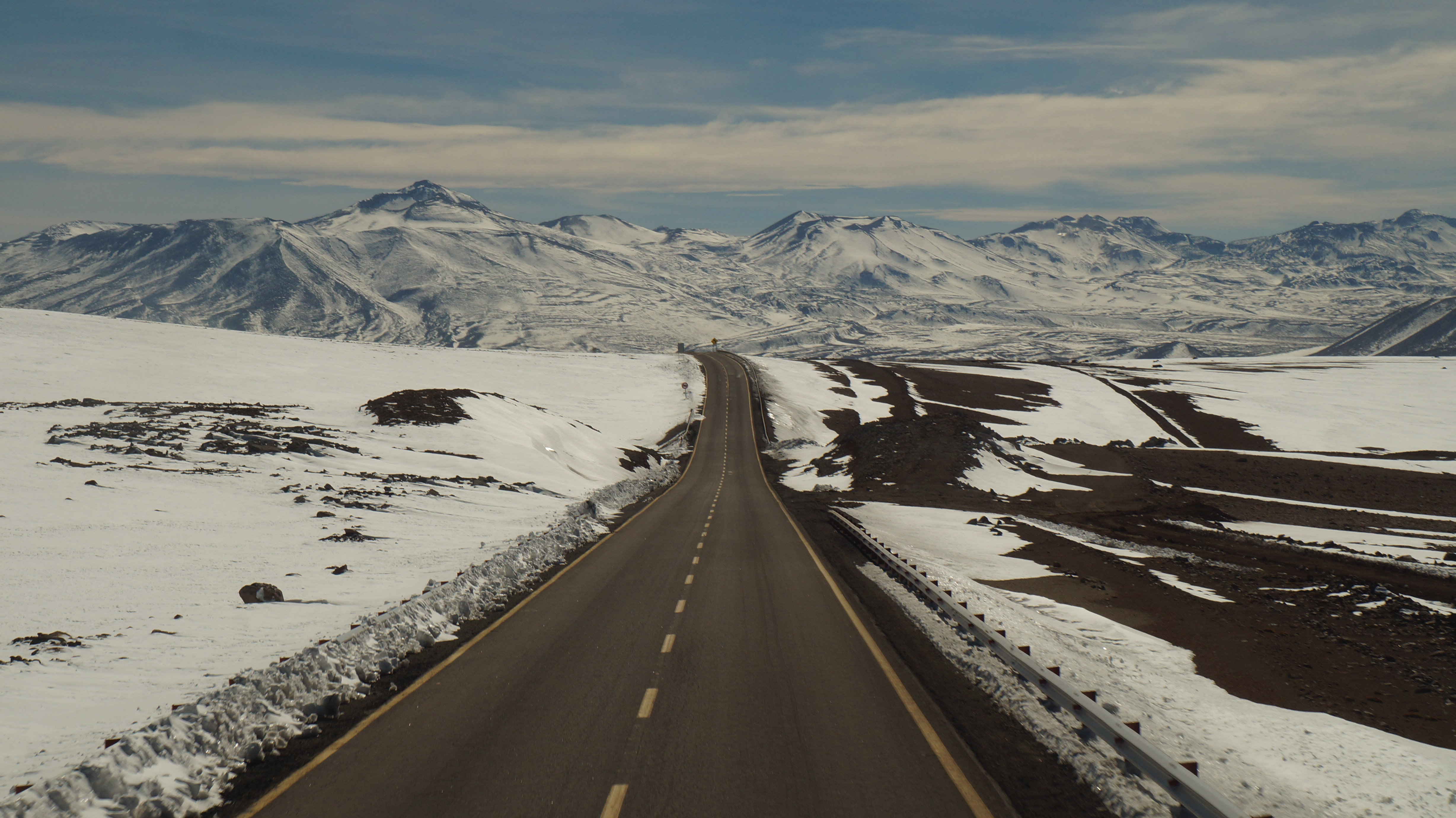 Not long after leaving the salt flat behind we started another small ascent along a slow and winding road. We started to see snow not just layering the mountain tops but also stacked up by the side of the road.