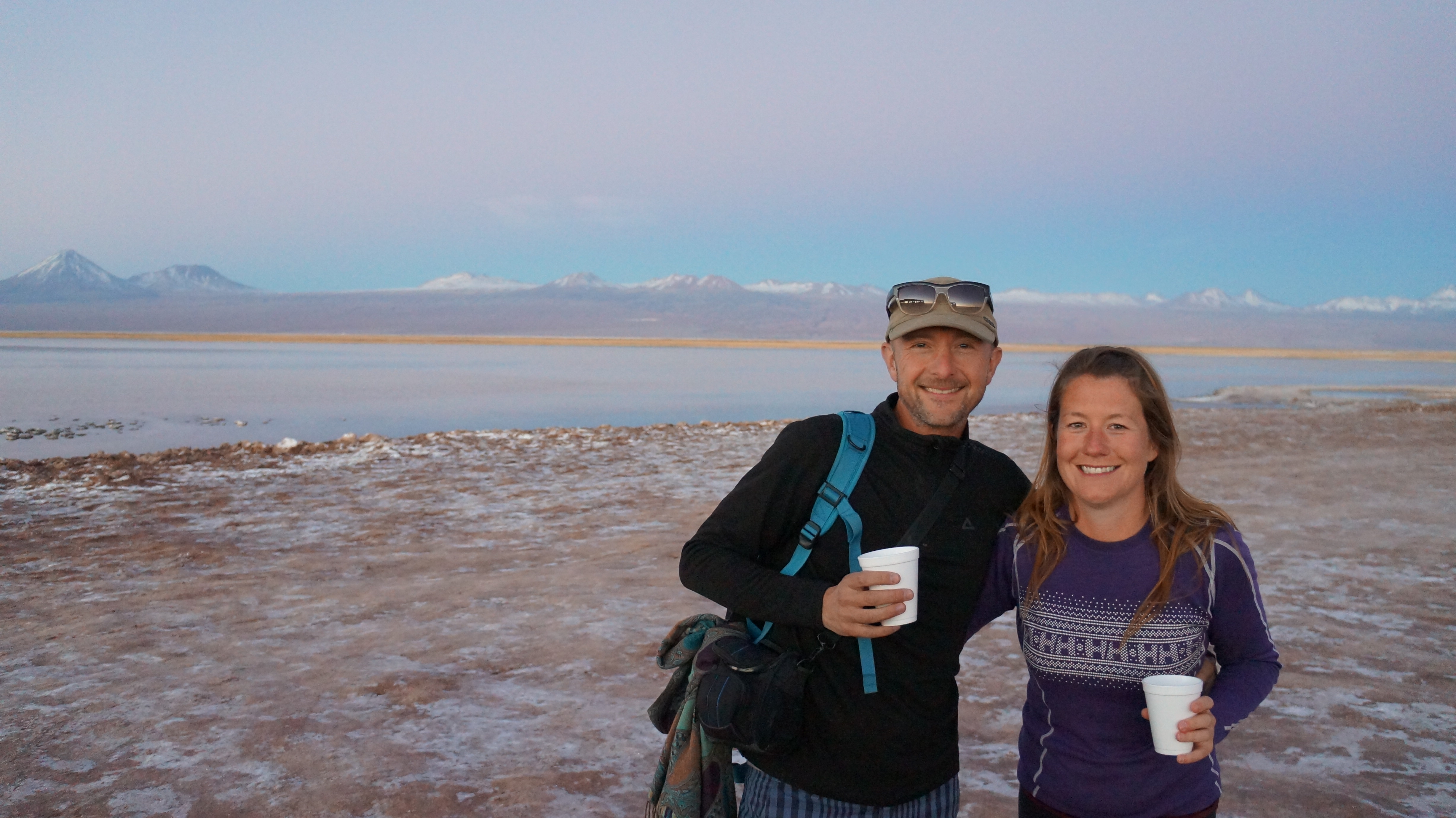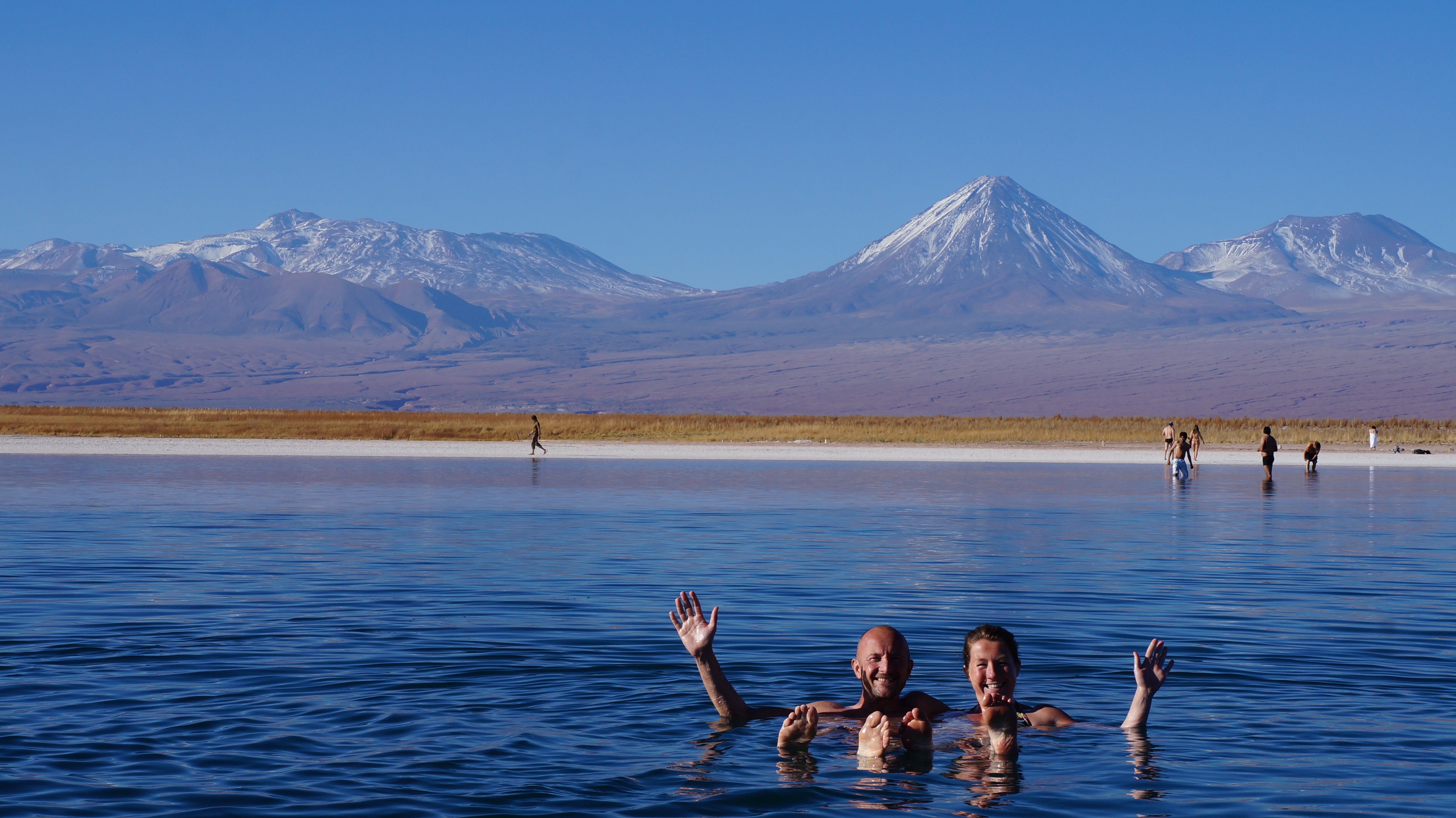 The scenery around us was painted in pale pastel colours, the air was fresh and the snow-capped mountains created beautiful reflections in the still water. Bright white patches of salt encircled the lakes and clung to our feet and legs as we walked barefoot.