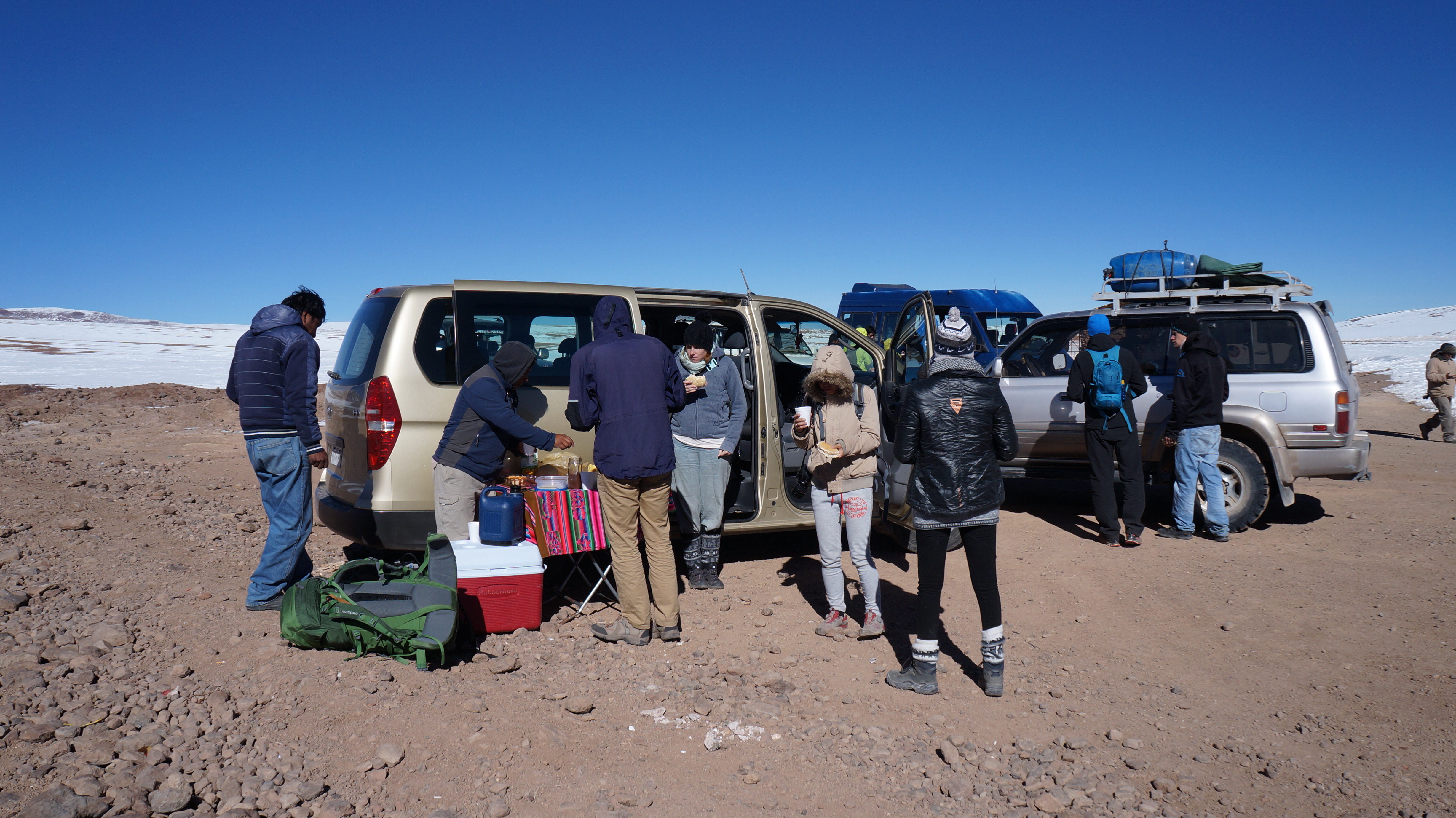 We joked that this had been the fate of the last tourists who tried to enter Bolivia without the correct paperwork! We entered the immigration office with a feeling of trepidation picturing the officials to be harsh and tough with us, however we were met with smiles and welcoming salutations and soon we had new stamps in our passports. We were shown to our jeep, which would become our home for the next few days, and introduced to our guide Alejandro, a firm but fair 40 something man who’d been guiding groups around Bolivia for most of his life. His presence in the group instantly commanded our attention and respect as he explained a little about the programme for the next few days and set out tea/coffee and breakfast on a small table next to the jeep.