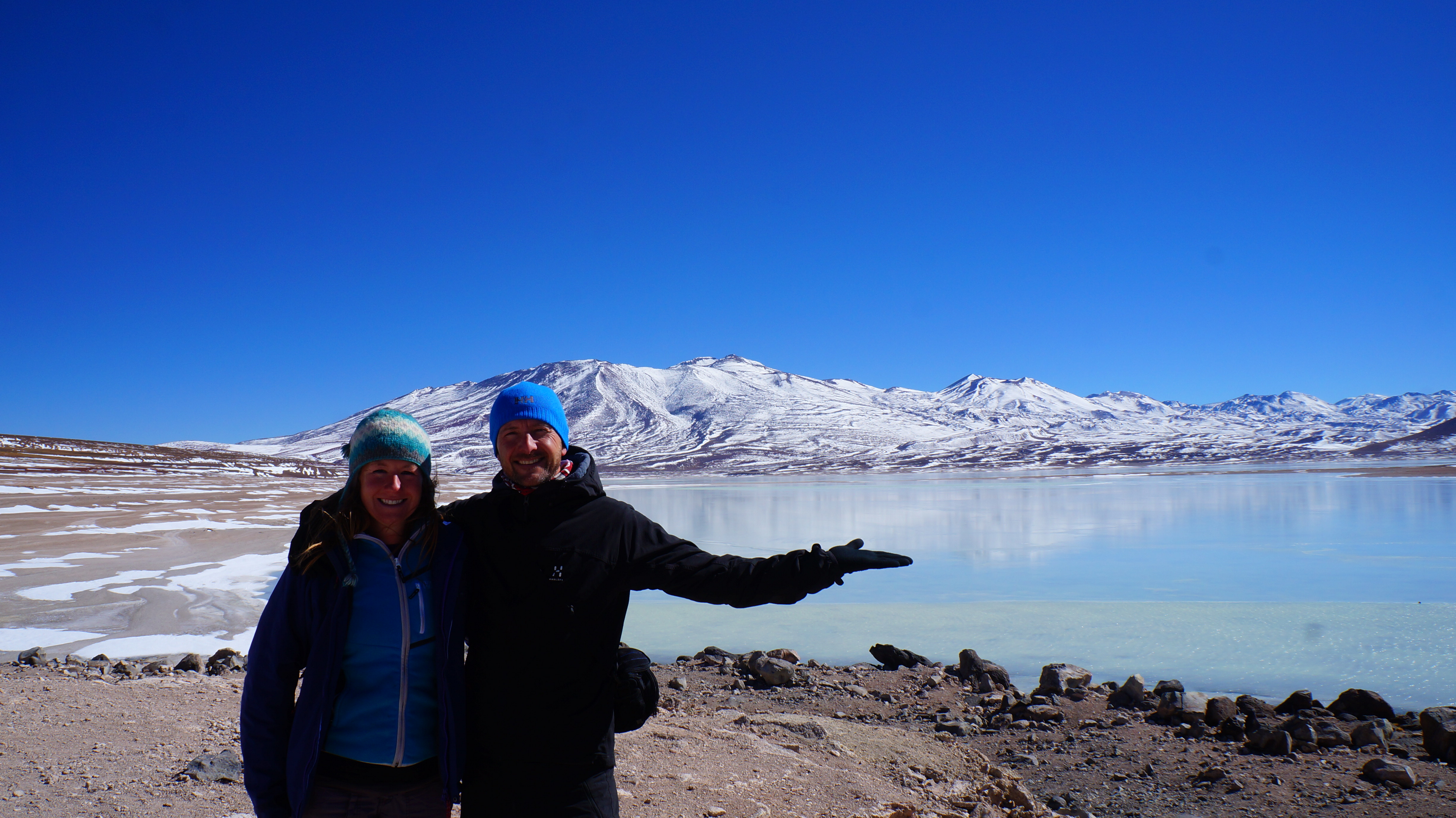 We all chatted excitedly to one another as we drove and every few seconds someone pointed out of the window at something new and interesting that had been spotted. We drove a further 40 minutes and arrived at the thermal pool of Polques. The small pool was set amidst stunning scenery – on the edge of a glistening lake, with yellow grass and wildflowers nearby and snowy mountains lining the horizon. Unfortunately, there were also other jeeps at the site so the pool was never destined to be ours alone but to bathe in 40 degree waters surrounded by out of this world scenery wasn’t something we were going to turn down…despite the fact that it felt like minus 5 with the wind chill.