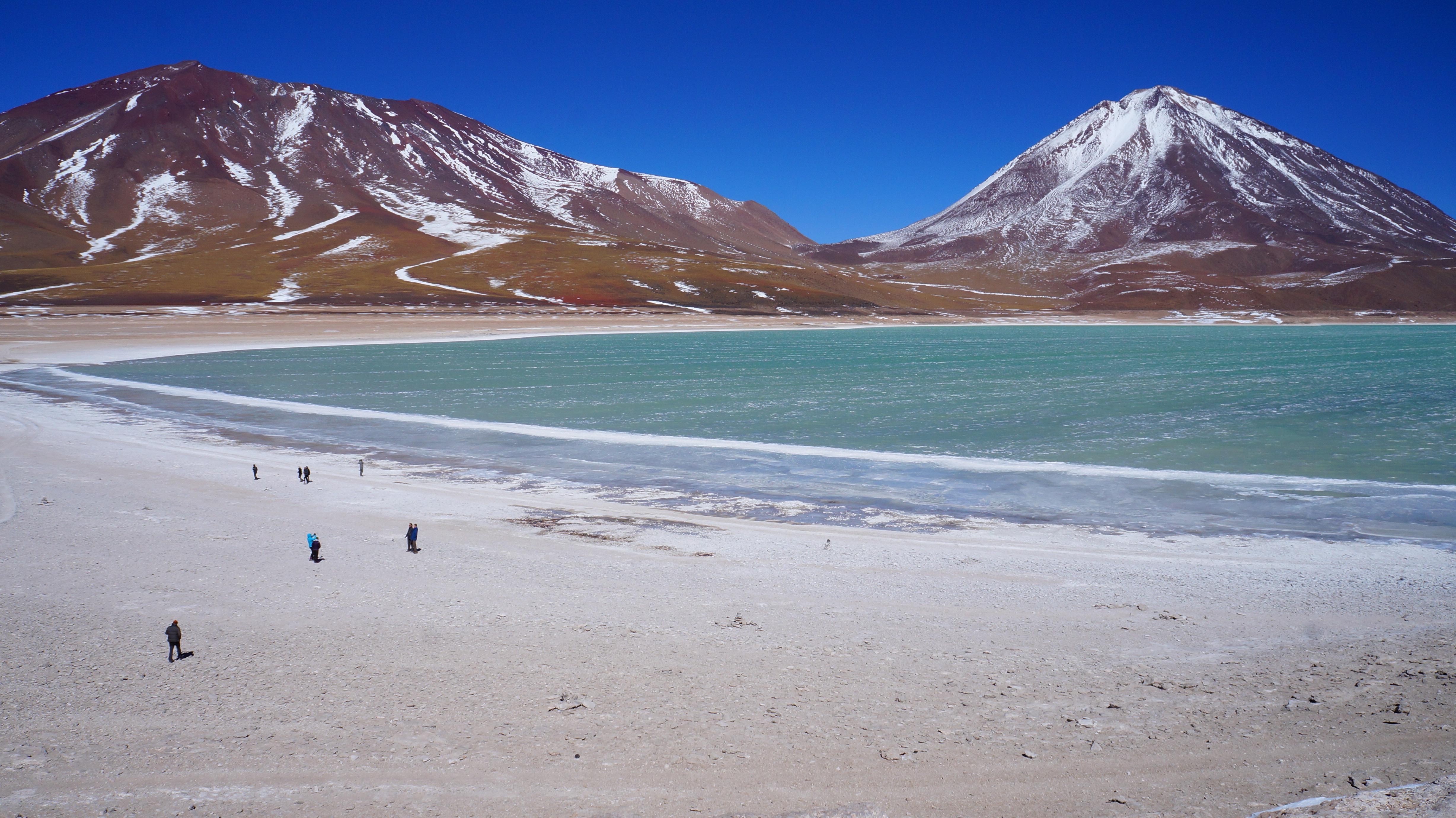 Just a narrow channel of water separates Laguna Blanca from smaller Laguna Verde which is green coloured because of sediments containing copper minerals.