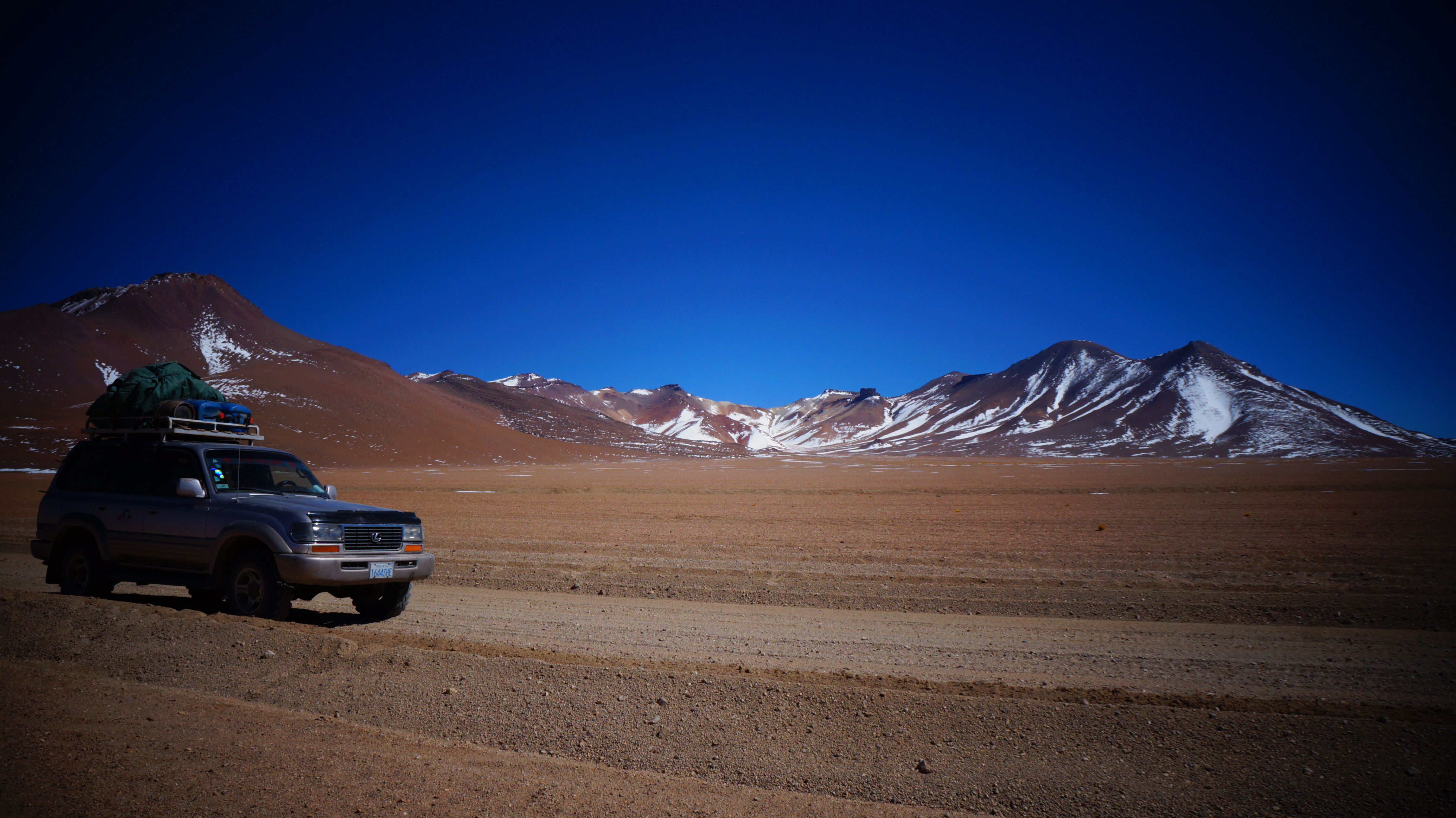 We sped up the sealed road leading towards the high Altiplano mountains and shortly after passing volcano Licancabur we moved off-road on a small track with snow lying all around us. The Bolivian border control stands close to 4,000 metres above sea level and was basically a small hut in the middle of the snowy wilderness.