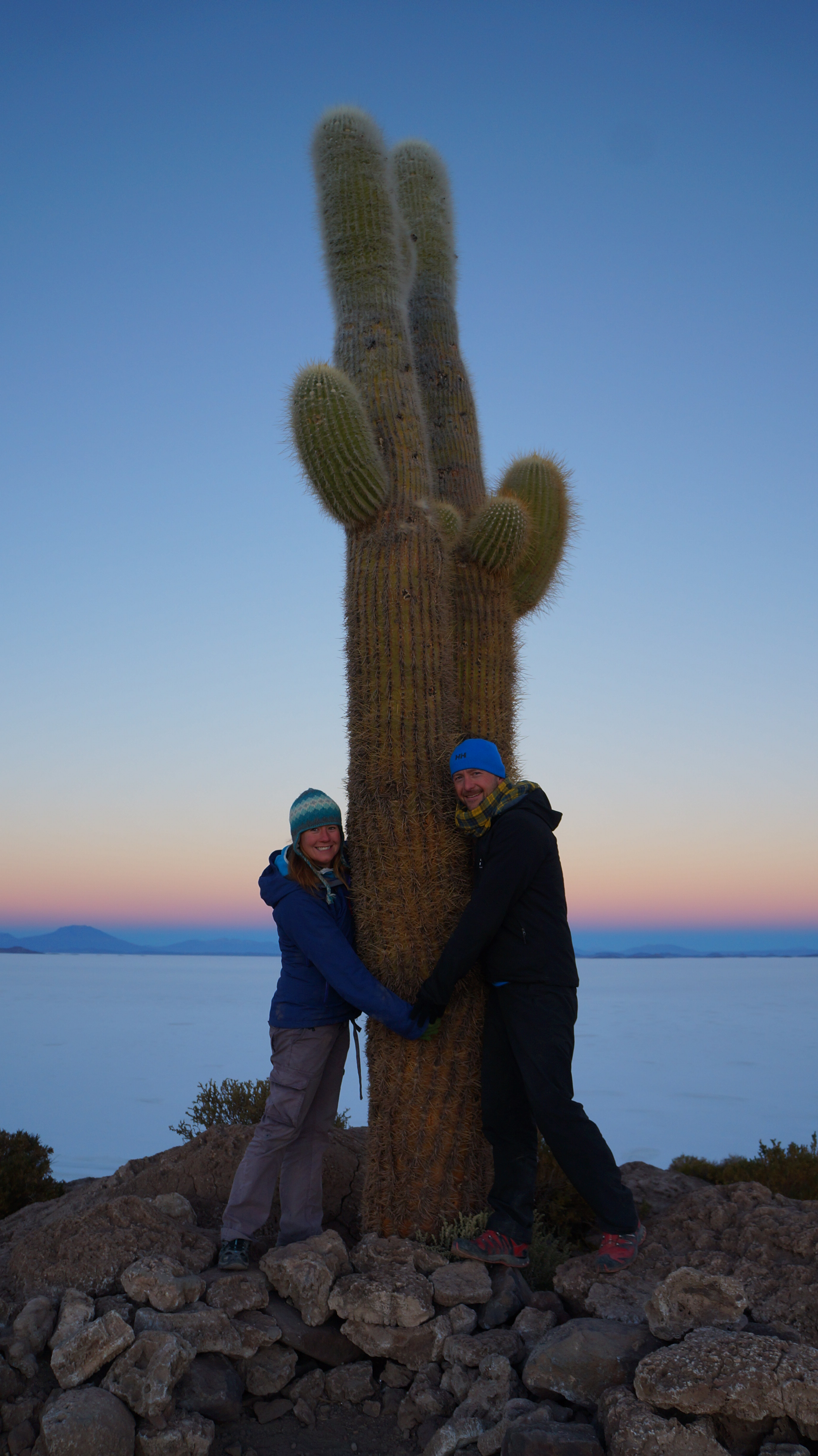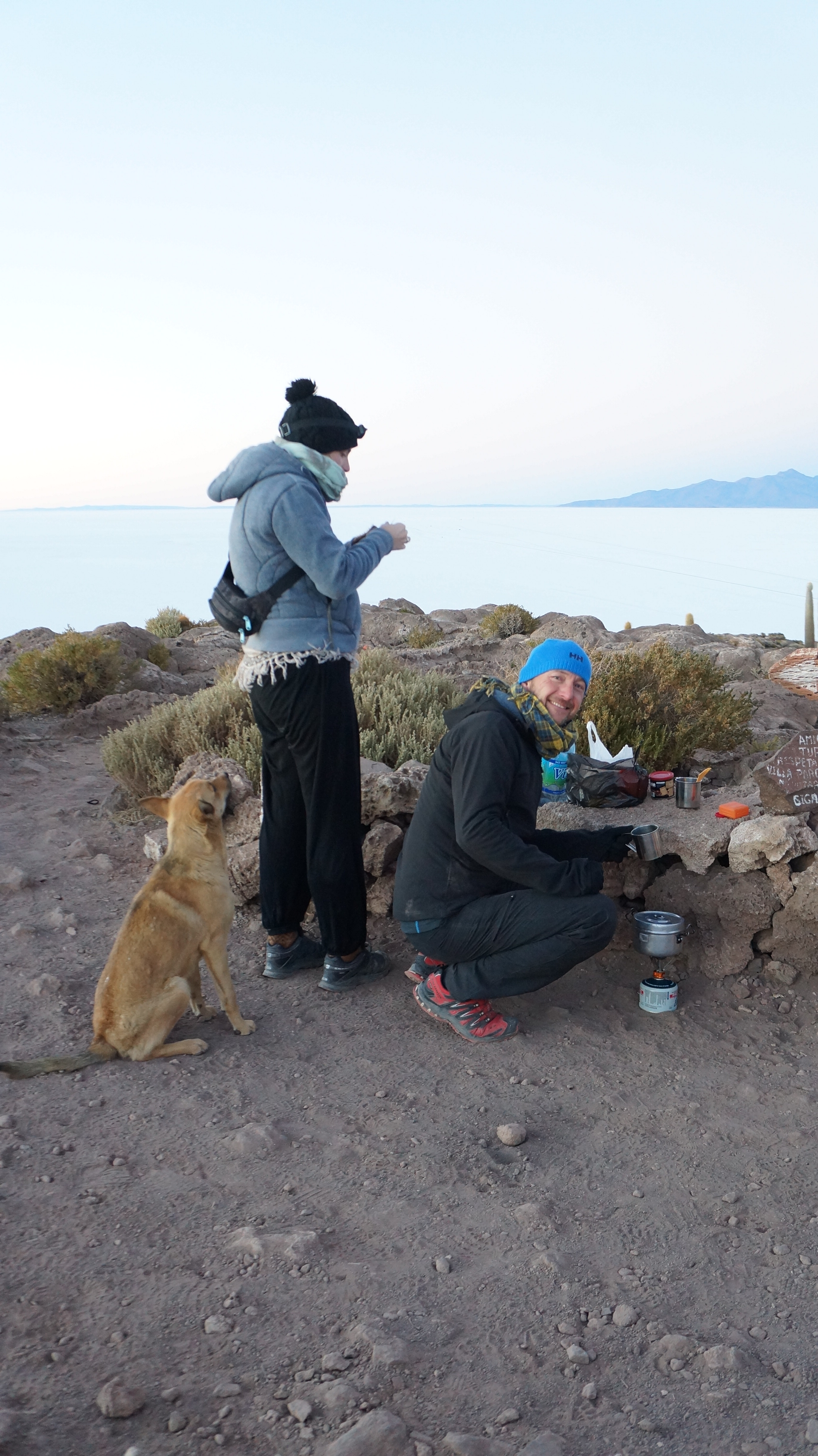 It was pitch black and freezing cold when we left the hotel in the back of the jeep. Many of the other groups were preparing themselves to leave but we were the first to depart. Even thought it was dark we knew that we’d entered a special realm when the jeep’s tyres first hit the salt flat and sped up across its immense open plain. Alejandro kept a steady speed of around 50km per hour and followed existing tyre tracks in the salt. He thrilled us by turning his headlights off completely for around 6-7 seconds which seemed like a very long time hurtling along and not being able to see if you’re about to crash into something. We went to ‘Isla Incahuasi’, a 24.62 hectare rocky outcrop in the middle of the salar, to watch the sunrise, and climbed on foot roughly 30 minutes to the highest point. In the dark we could make out hundreds of giant green cacti – some three or four times the size of us, with bright yellow needles as long as fingers. We wondered if we’d entered a parallel universe. We’d taken our stove, a pot and some water so we made our group tea and coffee as we waited for the sunrise.