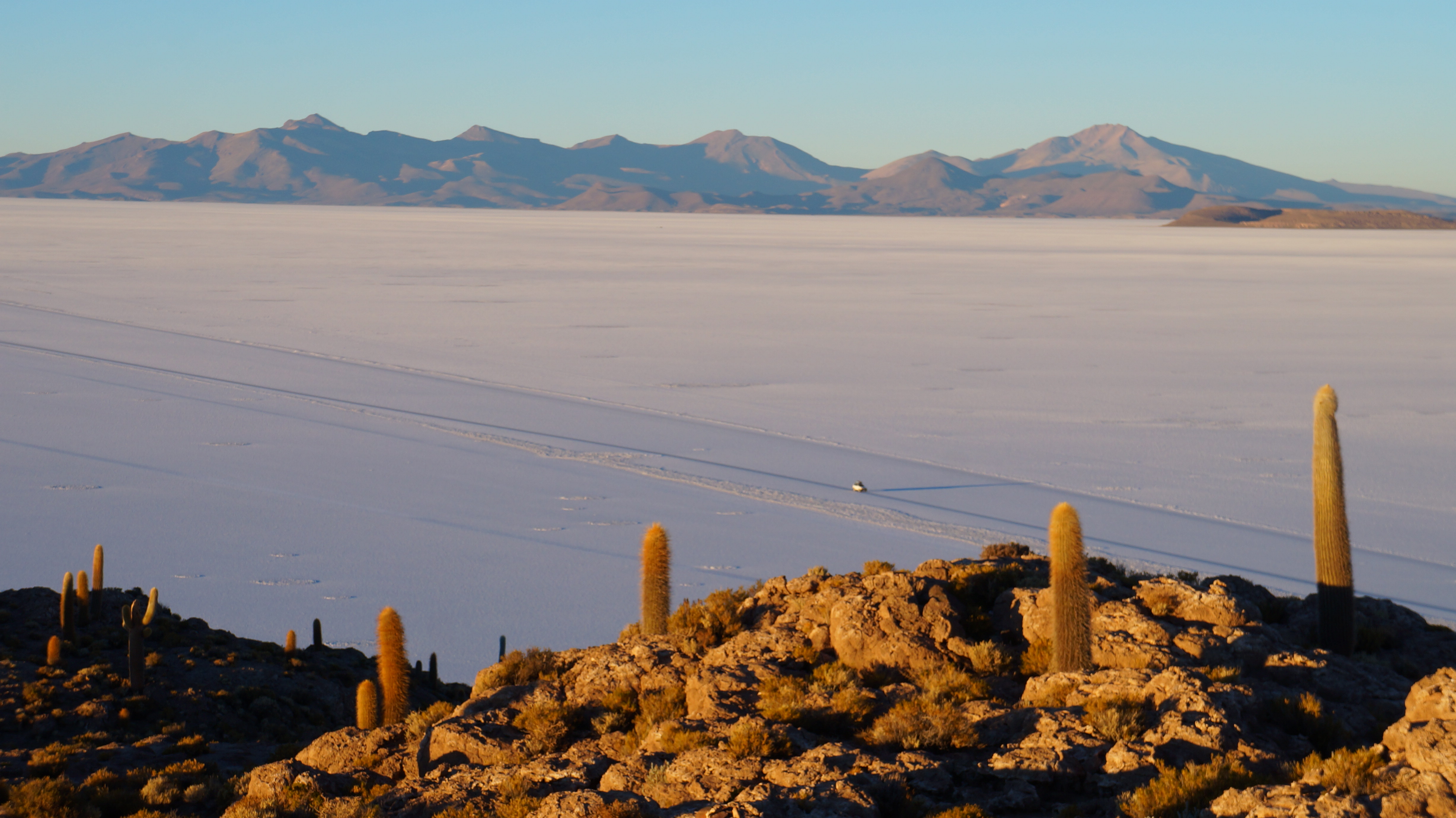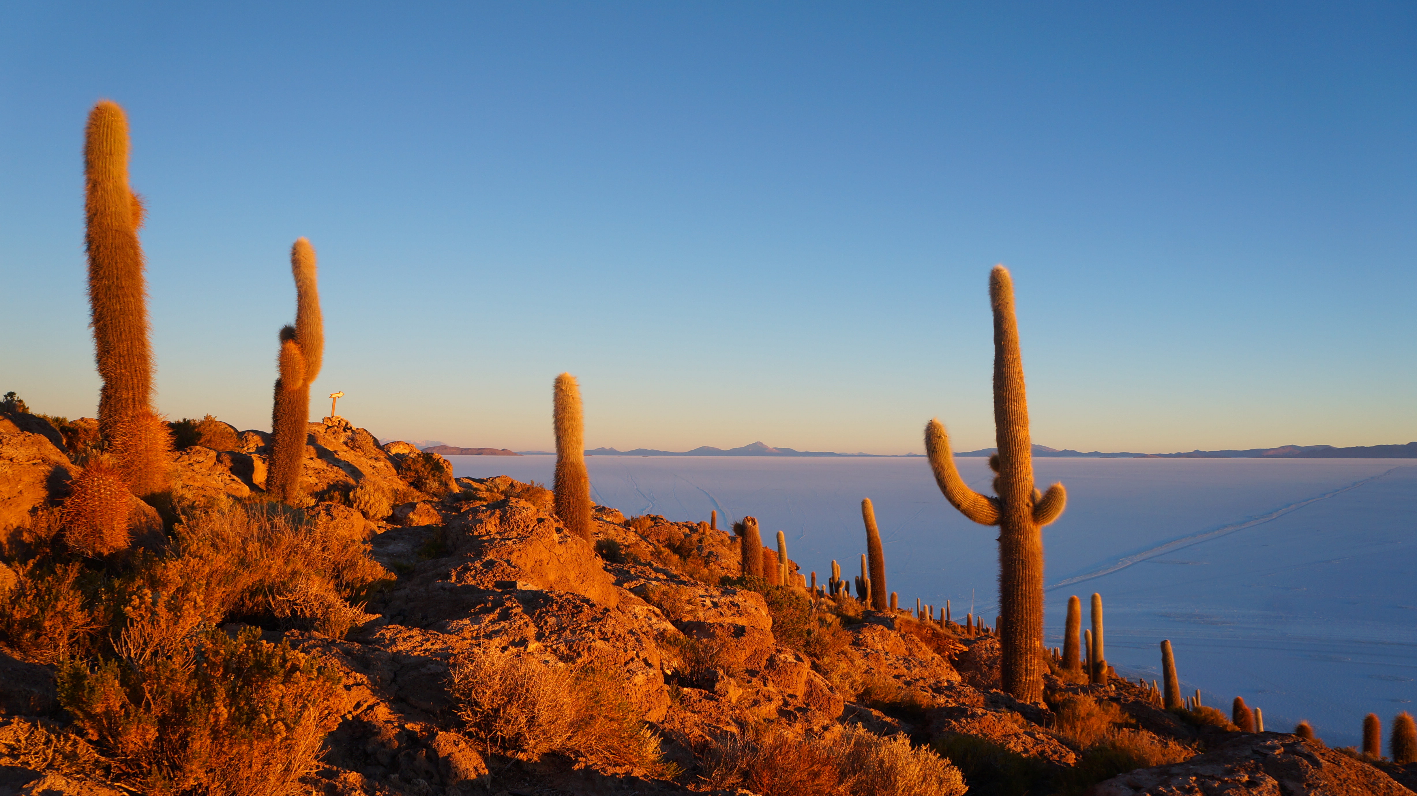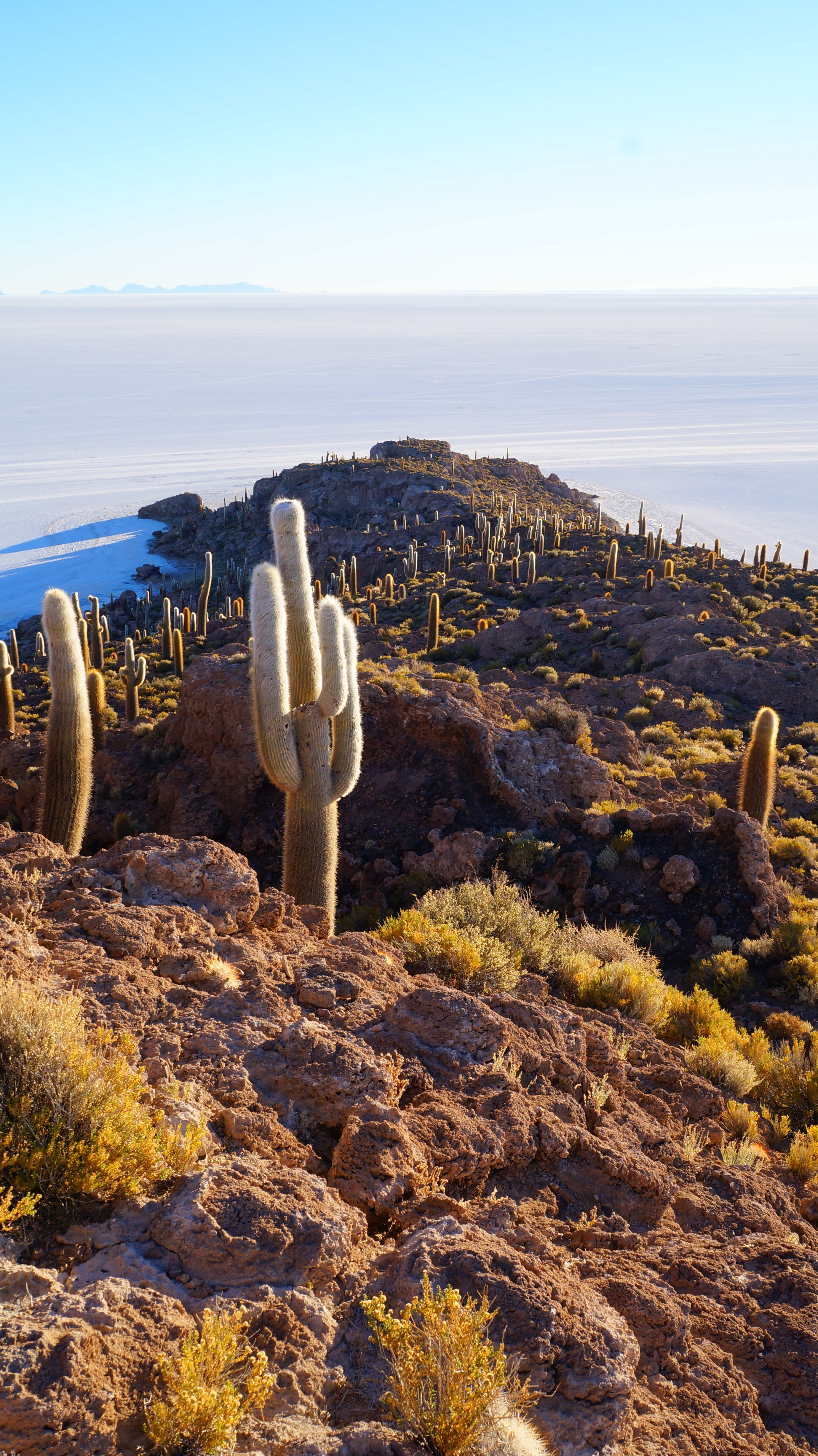 The island was actually the top of the remains of an ancient volcano which was submerged when this area was part of a giant prehistoric lake some 40,000 years ago and today it has an unusual and coral-like structure which often consists of deposits of fossils and algae. The island rises out of the sea of white and cultivates gigantic cacti – some so thick that you can’t reach your arms around them and some so tall that you can’t touch the top.