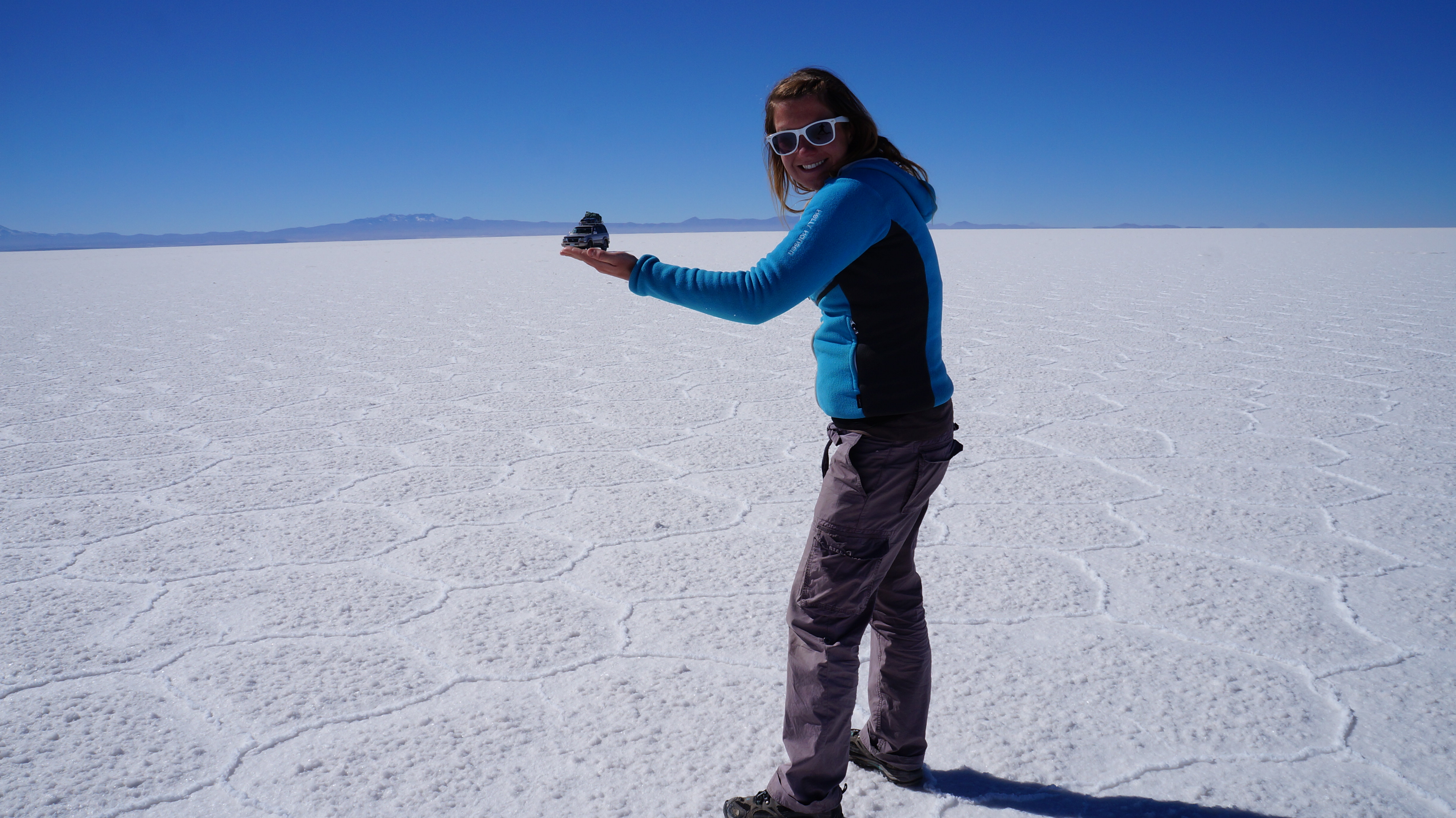 On some sections of the horizon we could see islands and distant mountains and due to a trick of the eye it looked like those far away objects were hovering just above the line of the salt. Our driver explained that in this world of salt, perceptions can become completely distorted and, like magic, many things we thought were impossible, can become possible. We knew exactly what Alejandro had in mind as we’d all seen photographs of other tourists exploiting depth perception on the Salar – for example, a tiny toy dinosaur in the foreground of a picture, with a person several metres behind, will reverse the size of the two objects, making it look like an enormous dinosaur was about to eat a Lilliputian sized person.