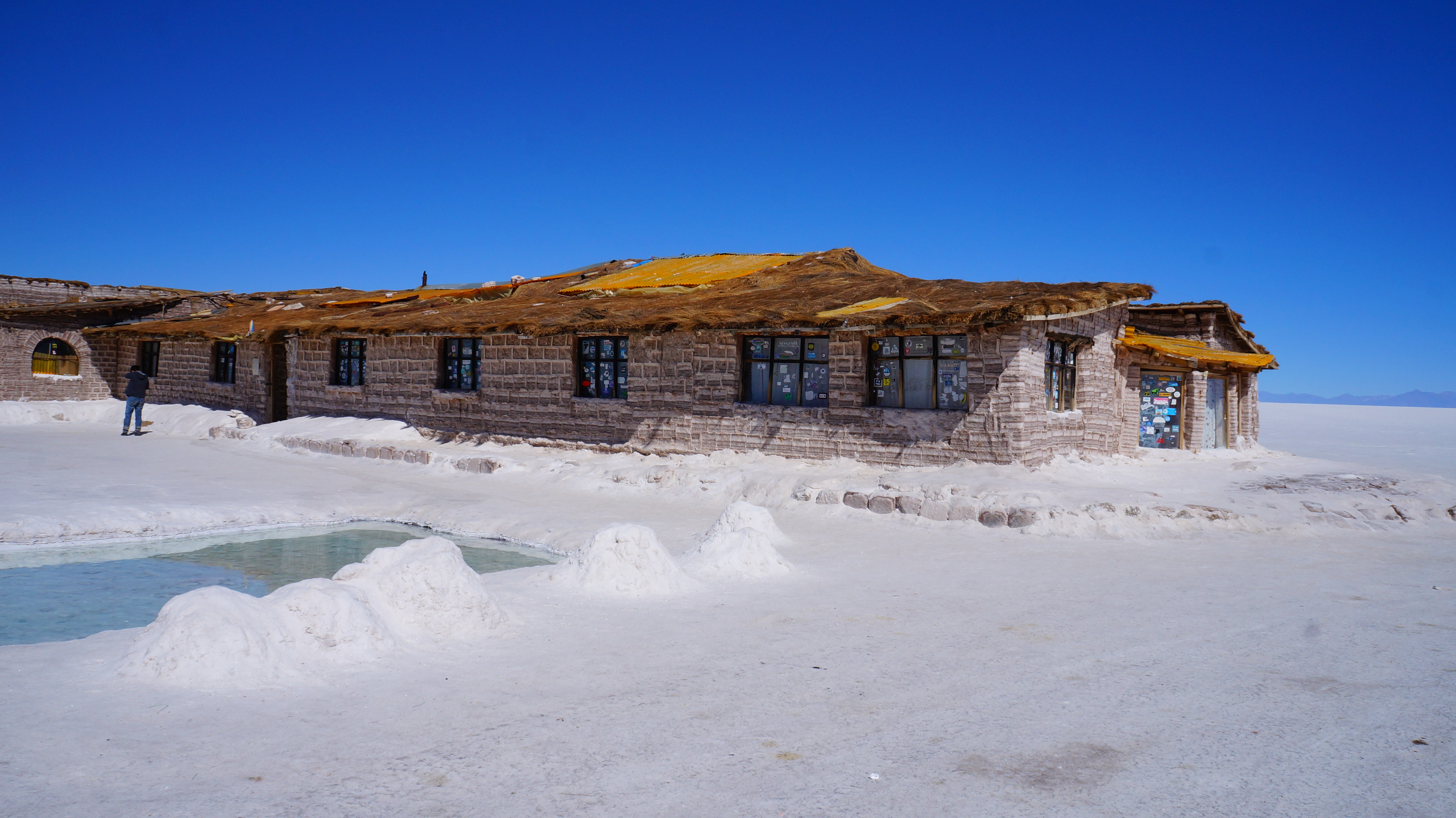 Our destination was the salt hotel where we would spend the night. Alejandro mentioned that the hotel had several double and twin rooms which would be offered on a first come first served basis and after that it would be dorm room accommodation so when we saw in the distance the tiny outline of jeeps followed by a dust storm we urged him to drive faster. As Bolivians are never shy at speeding, Alejandro promptly obliged hitting 80km per hour at one stage and thumping the air when he knew he’d taken the lead securing us the desired rooms!