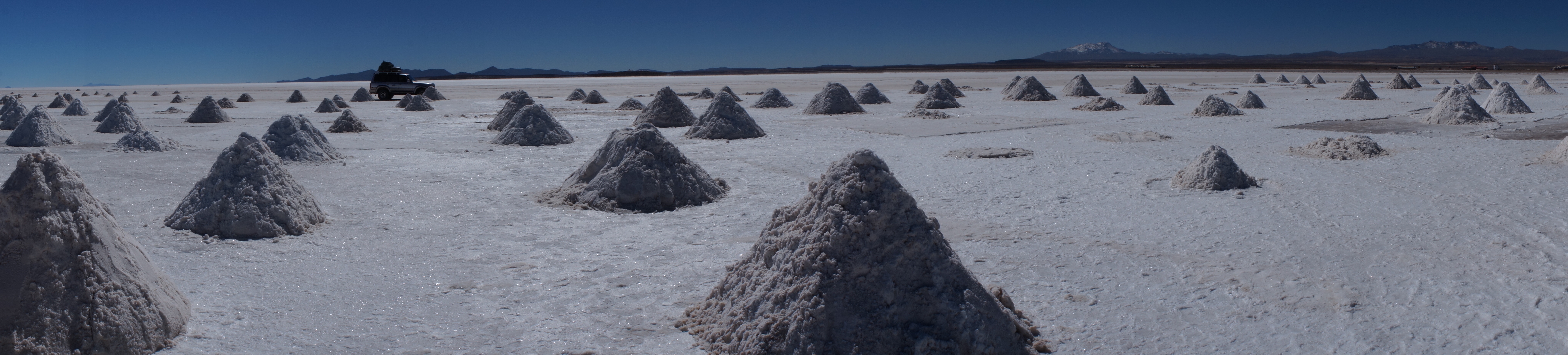 As we headed towards the edge of the salar we came across piles of salt drying in the sun. It was Sunday so there were only a few die-hard farmers working hard but we could instantly tell that this was a back-breaking job…and all to fill those tiny salt shakers that grace our dining room tables. We said to ourselves that it looked strangely like the smooth expanse of salt had broken out in hives!