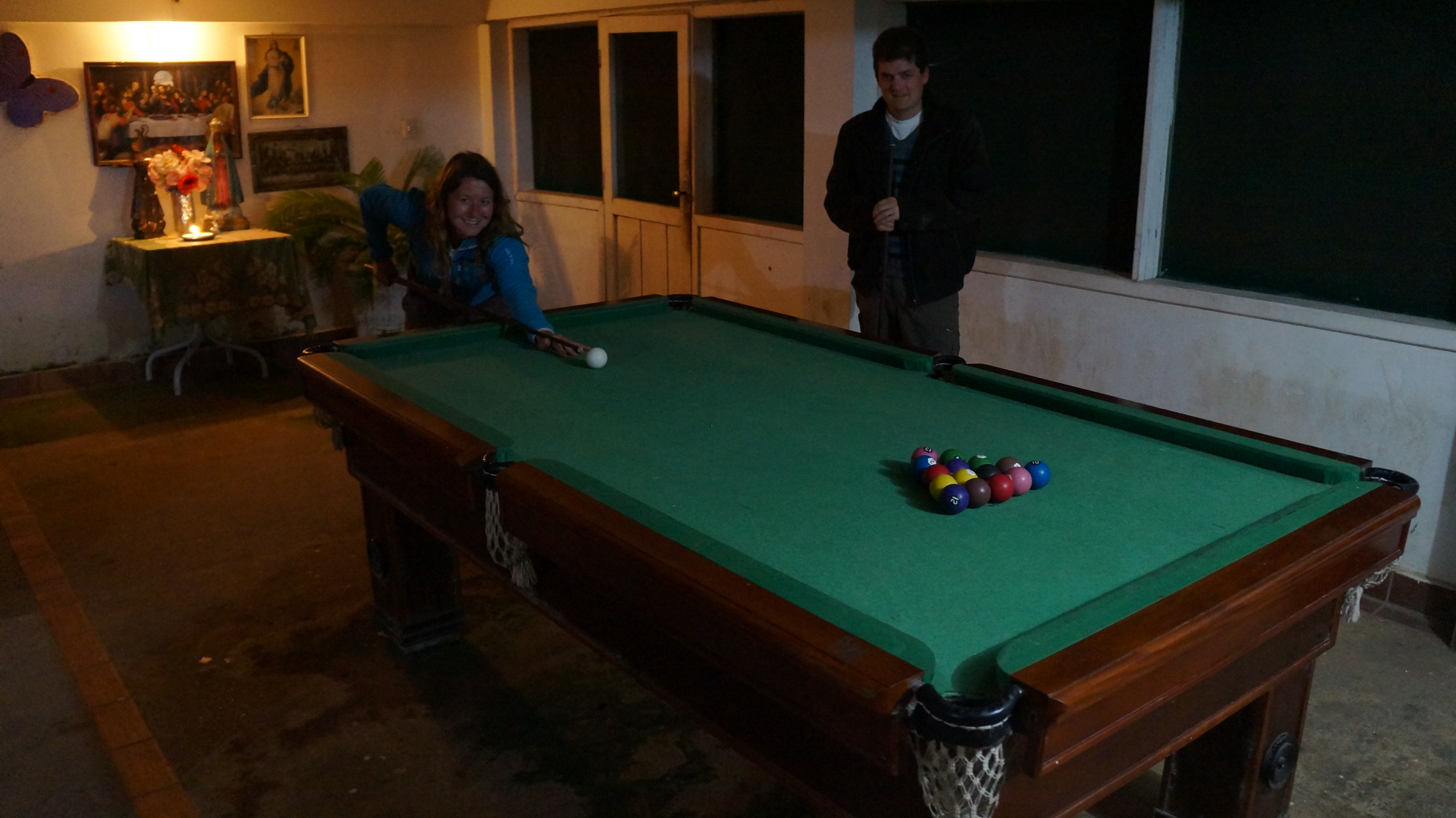 When we arrived back at the house, the pool table was crying out to be played so we initiated a winner stays on game. The table felt like something the Flintstones would use with dents and slopes all over the table, cues that had no tips and a white ball which had been formed by hand with plaster of paris and baked in the oven giving us a very large golf ball.