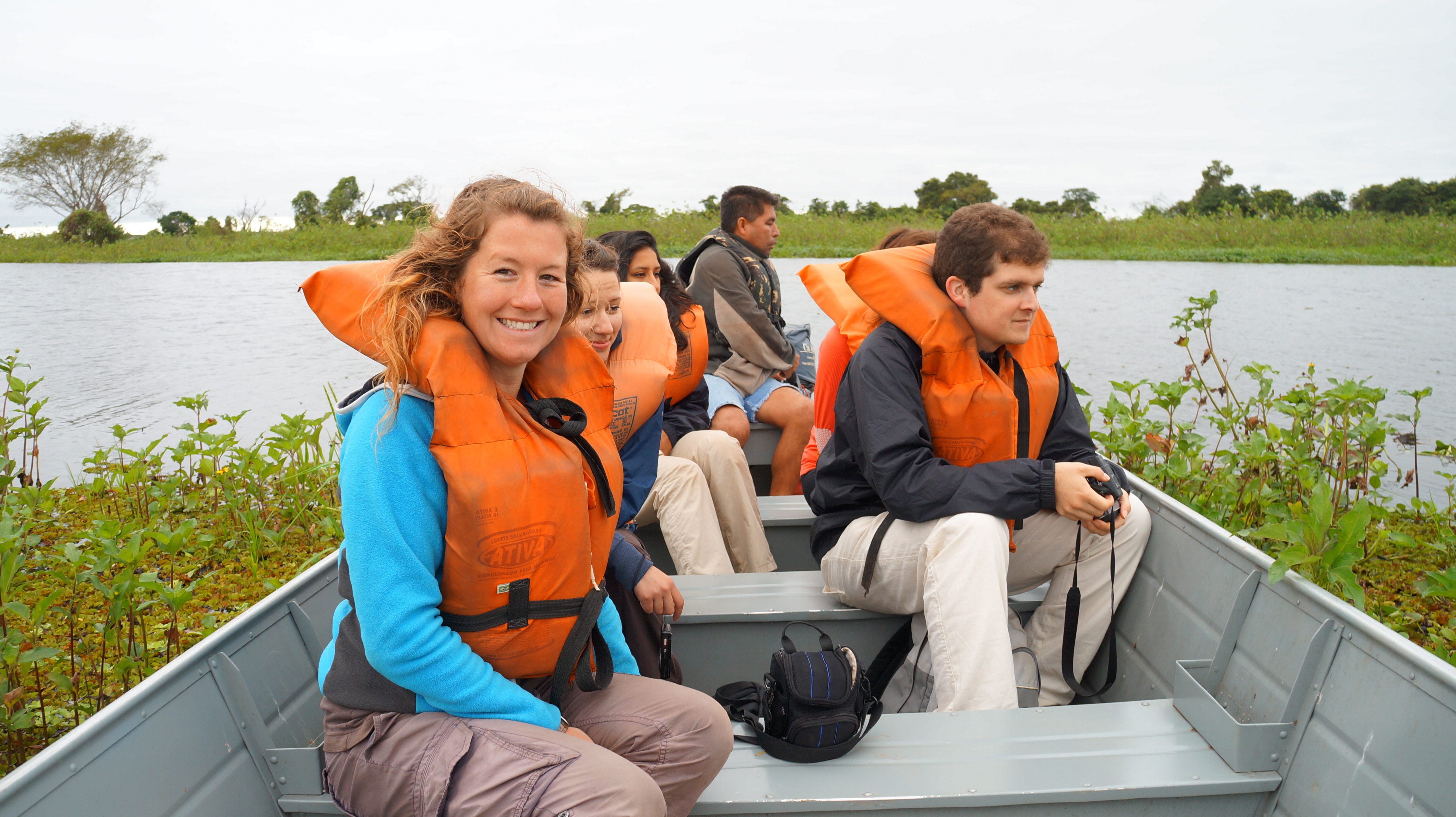 Our afternoon activity was another river boat trip but this time we were heading in the opposite direction in search of giant otters. We wrapped up in layers and took up our usual seats in the boat. The guide’s eyes skimmed the river from side to side looking for signs of life and in a split second he was heading for the riverbank where he’d spotted a group of chattering monkeys. They used their long tails like an extra limb and moved effortlessly through the trees whilst still holding nuts and fruit in their hands. The sound of our approaching engine scared the monkeys back into the trees but our enthusiastic guide moored the boat, jumped out and beckoned us to follow on foot. Going deep into mosquito territory was like a death march for us. We stepped over fallen logs, ducked past vines and grappled with creepers. The thrill of the chase was undeniable – stopping in silence every few paces, listening for directions and then following the monkeys grunt. As we walked it was a constant battle to swat away mosquitos, some of which we remember being the size of small birds! We felt the hot itch of bites starting to appear on ankles and exposed arms and our enthusiasm for monkey chasing began to wane. After 5 minutes, we had been outsmarted by our close relations, and had lost the trail of the monkeys. We returned to the boat with our spirits dampened – each of us had bites into double figures and a couple of us even had red lumps appearing on our necks and faces. The guide, who smiled sweetly, of course had no bites, sensed our despondency and sped us off in the direction he was certain we’d be able to spot some giant otters.