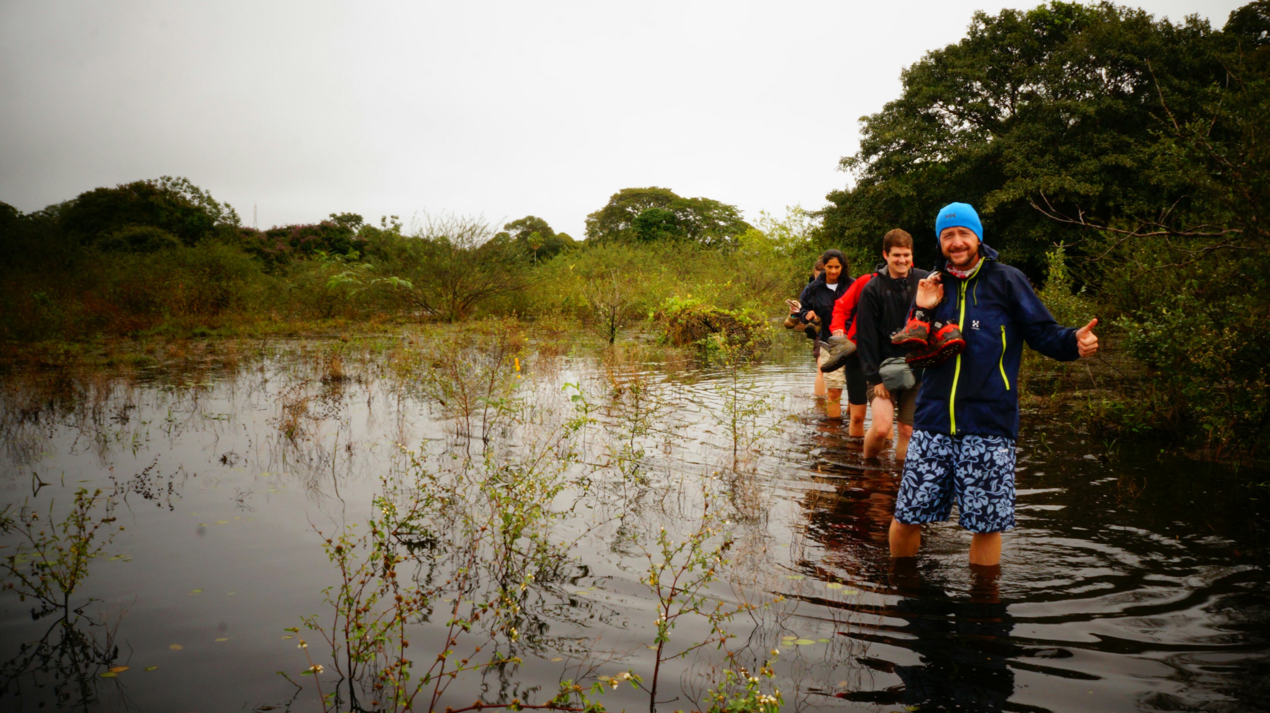 When we reached the first stretch of water covered marshland we suddenly knew why the guide was walking barefoot. We took off our shoes and socks and rolled up our trousers. We reluctantly followed the guide into the cold, murky water, feeling a little unnerved that we couldn’t see the bottom. After a few steps the guide said “Make sure you place your feet where I do so you don’t stand on a caiman”. We weren’t sure if it was his attempt at a joke but we weren’t taking any chances and didn’t put a toe nail out-of-place.
