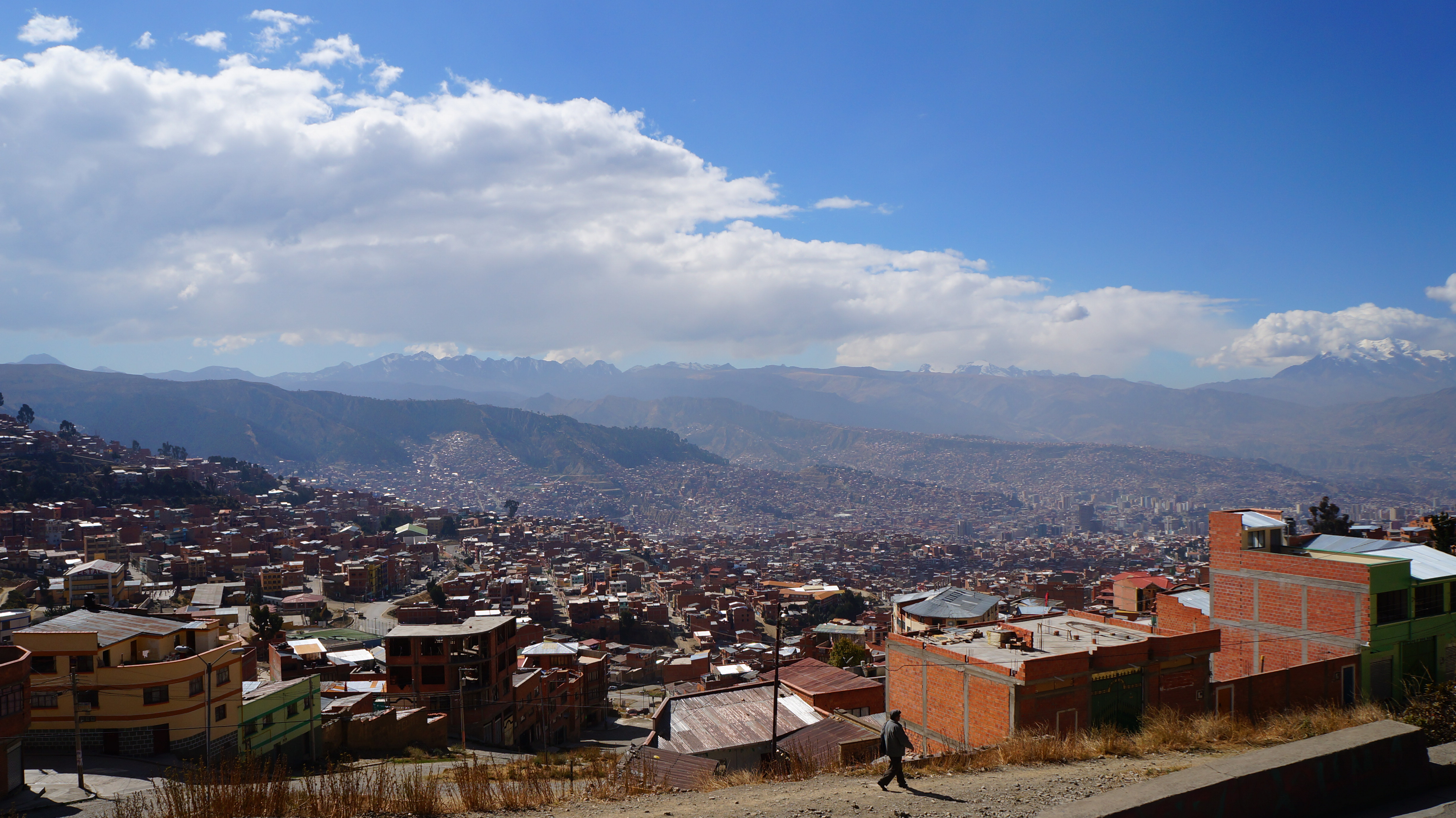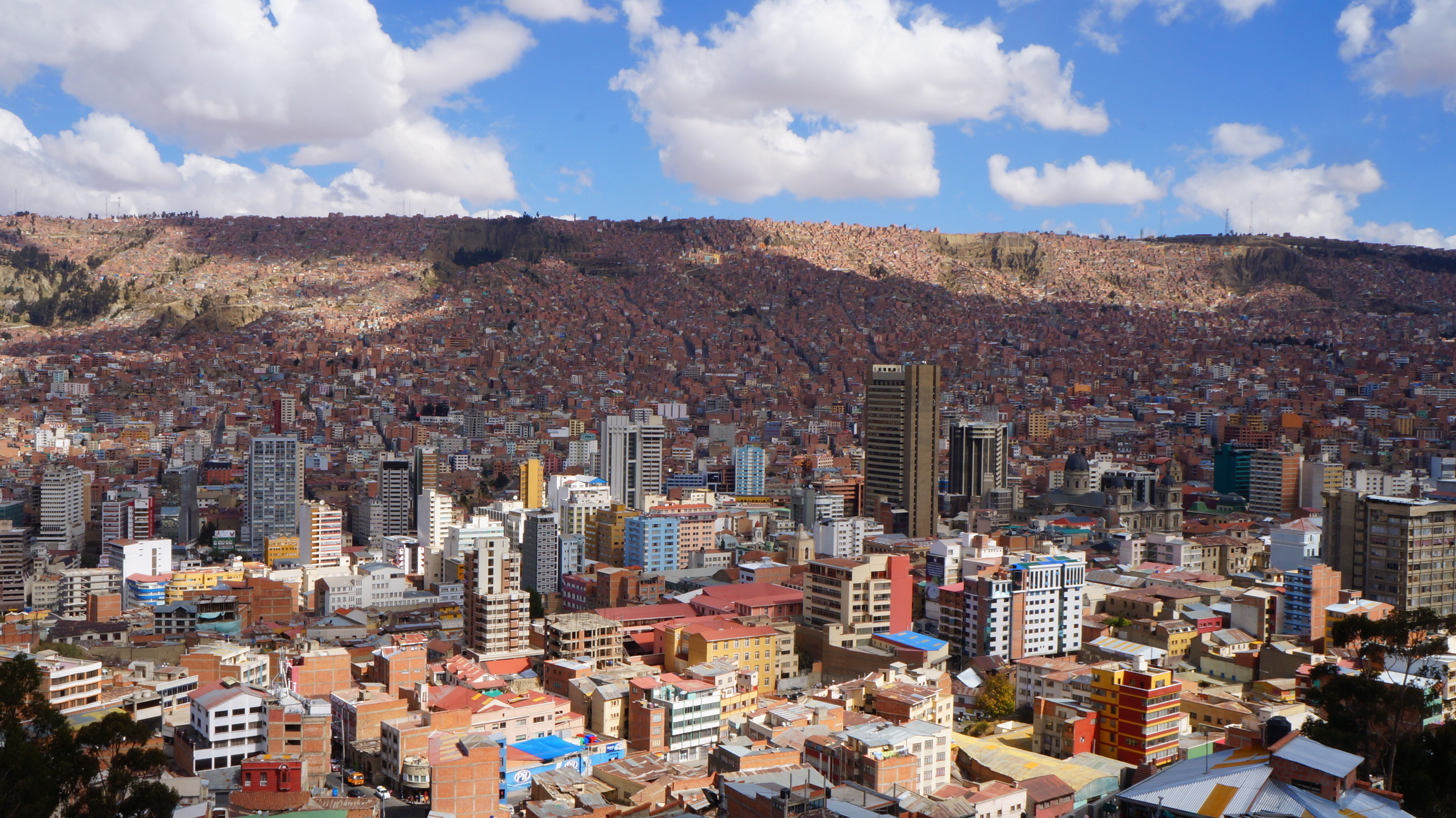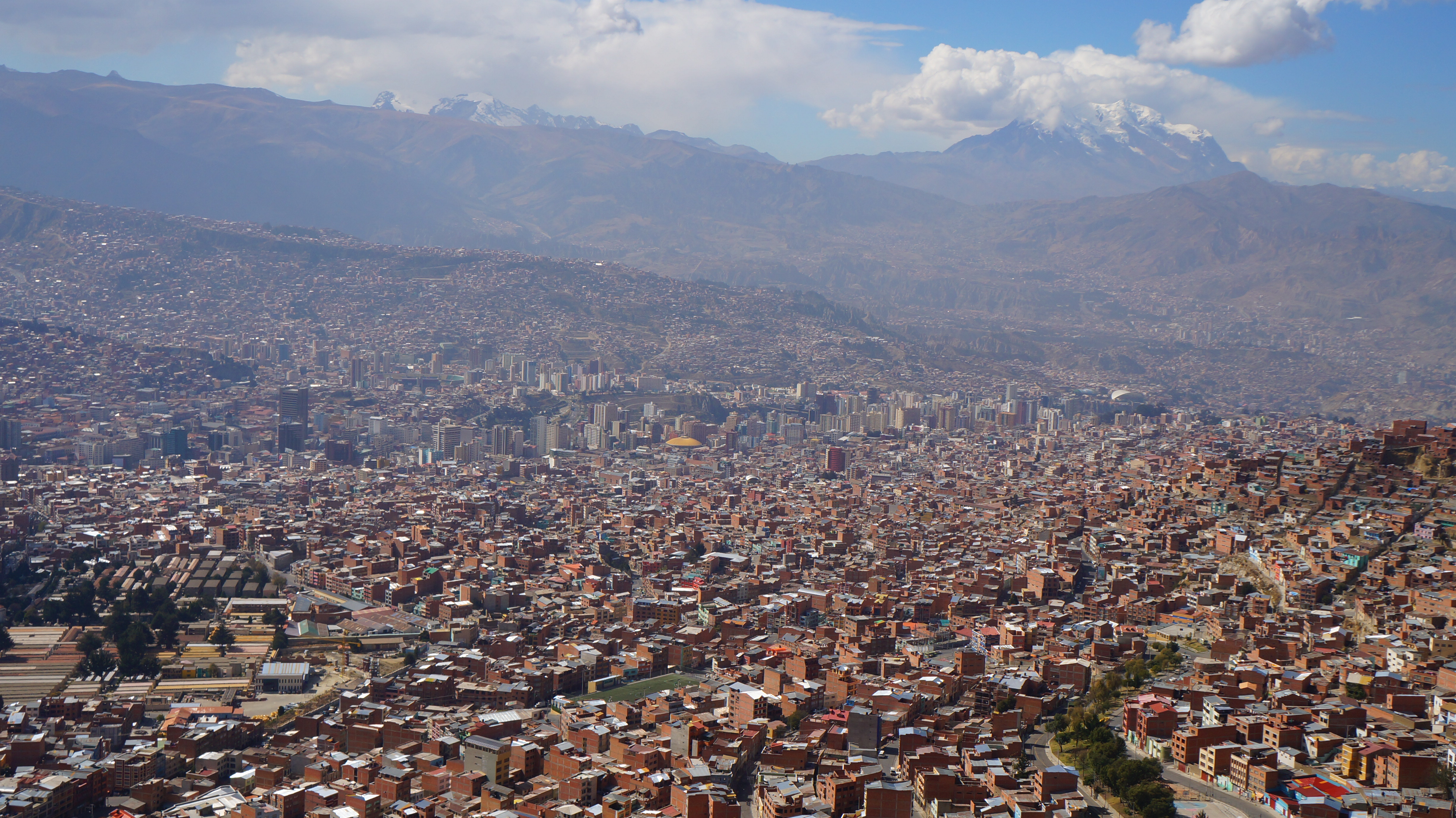 The rule of thumb in La Paz is the wealthier you are the lower down the valley you live because the climate is better, and the poorer you are the higher you live, so there’s an unusual mixture of shiny new apartment buildings downtown and half-finished red brick, tin roofed huts clinging to the upper canyon walls.