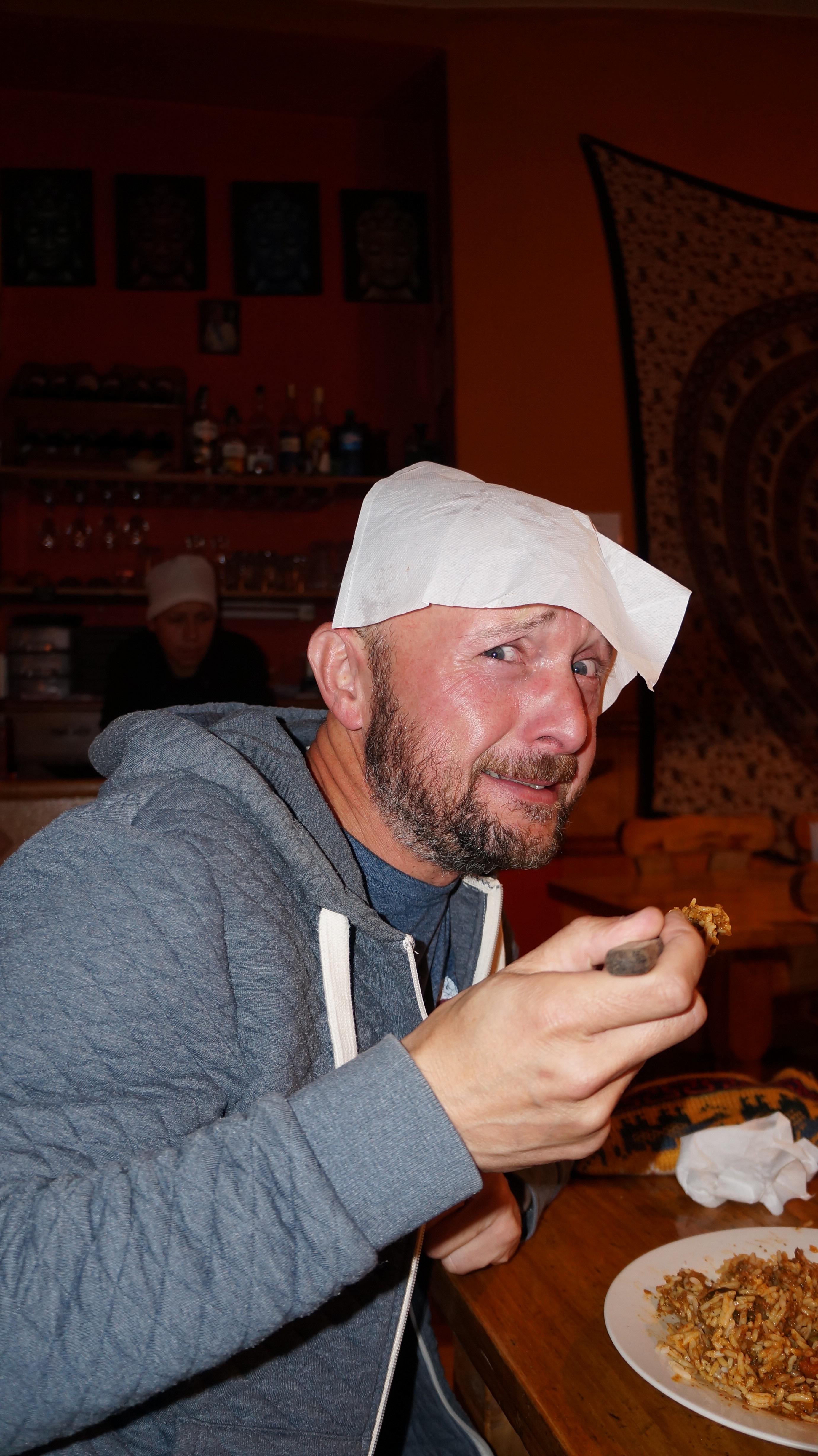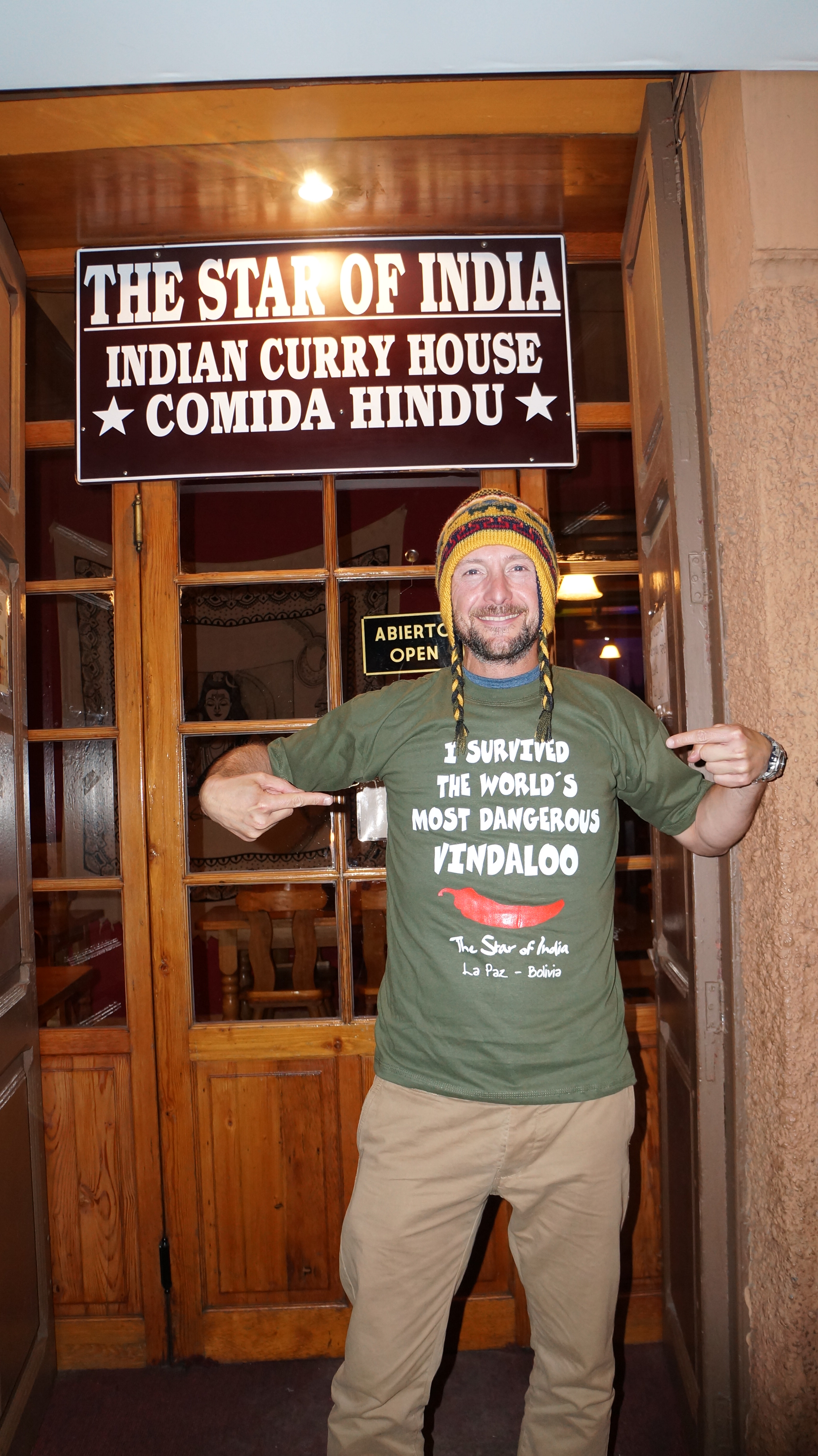 La Paz is an excellent place to indulge in all manner of activities for a very cheap price – mountain biking down the world’s most dangerous road, abseiling off one of the city’s highest skyscrapers, paragliding, summitting 6,000 metre plus peaks – the list is endless – and will certainly give adrenalin junkies their fix. One of the most dangerous activities we indulged in whilst staying in La Paz was taking on the vindaloo challenge at the world’s highest Indian restaurant – the Star of India. La Paz boasts a huge array of inexpensive eateries from street stalls to westernised restaurants with some of the country’s best chefs. We’d been satisfied most days eating the cheap set lunches, known as Almuerzos, where we’d be served a bowl of soup and the dish of the day – usually chicken, rice and potatoes – but we’d been hankering for a British-style curry for months and we’d been tipped off that the Star of India was possibly the best curry house South of the equator. Neither of us had ever eaten a vindaloo before but we were feeling particularly daring (or stupid) having just booked our bike ride on the ‘Death Road’ for the following morning and the thing which sealed the deal was the guarantee of a free t-shirt if we managed to finish the fiery dish containing no less that 40 naga chillies. To wash it down we ordered another creamy curry dish, rice and naan bread.