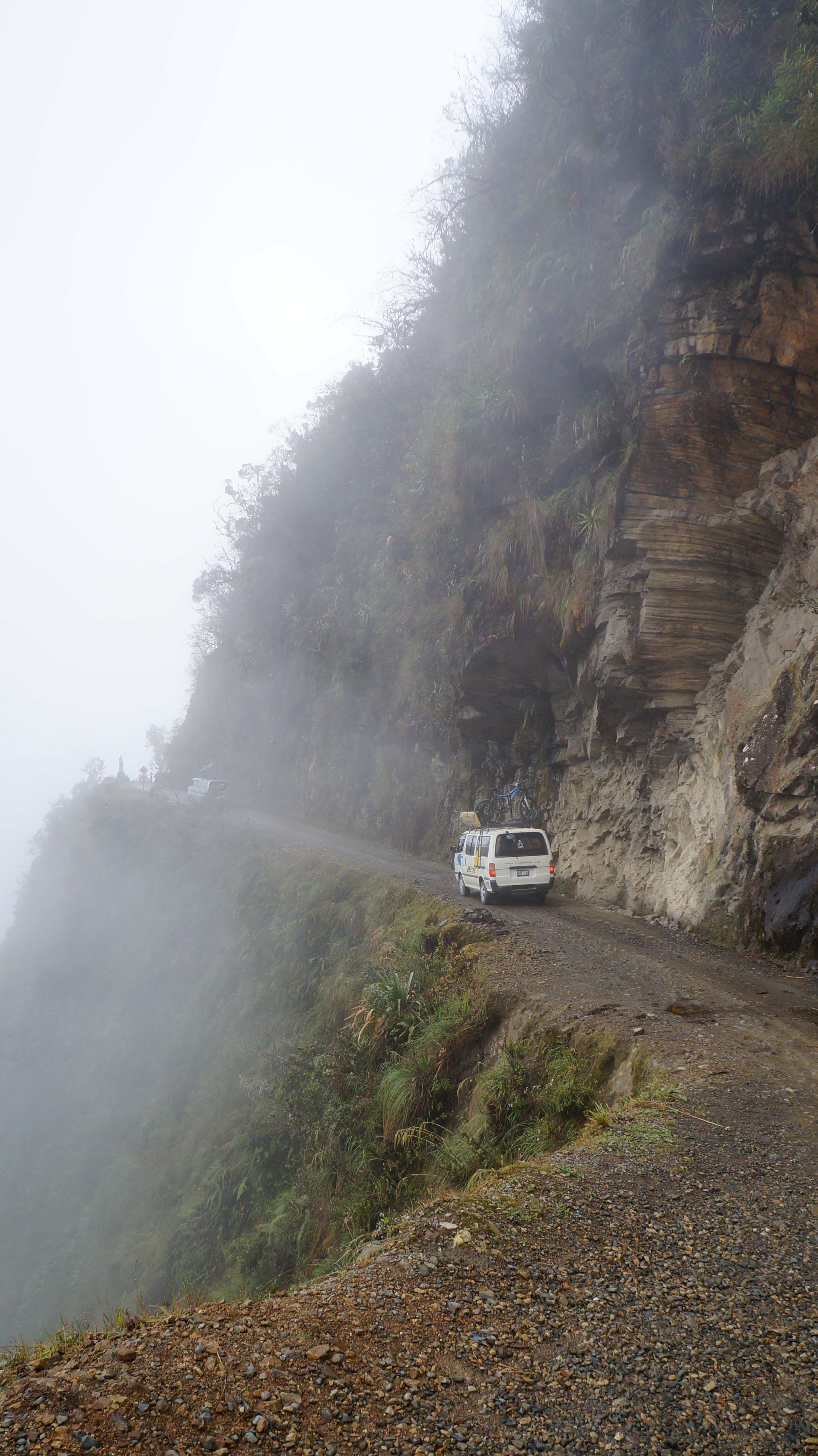The guides pointed to the next section of the road, which for many is the most terrifying! Here it’s necessary to cope not only with the rough, potholed road, the birdseye view of the stomach churning drop and the bulging and the unstable looking cliff face – here we also had to deal with waterfalls cascading directly onto the road from high above.