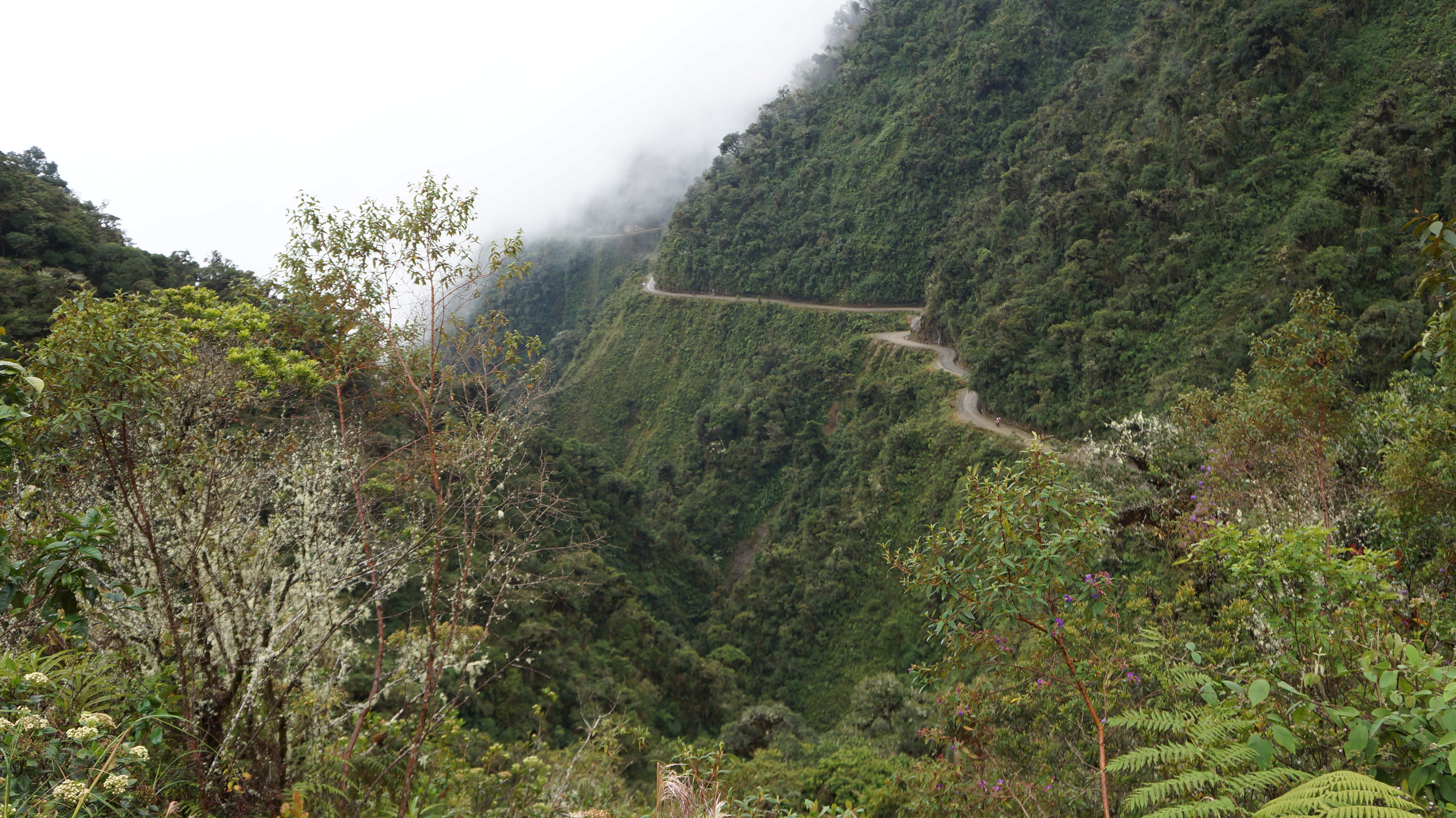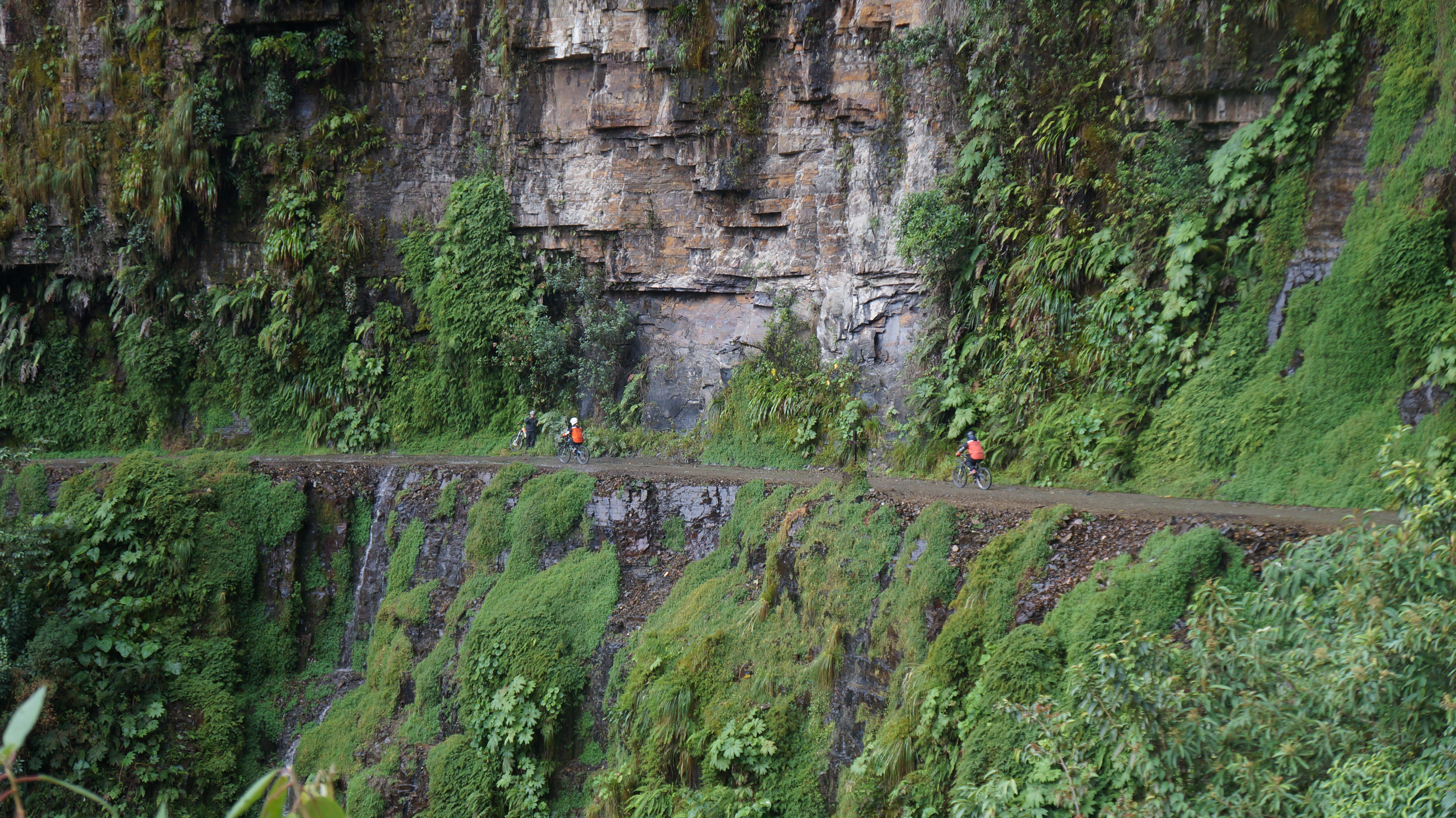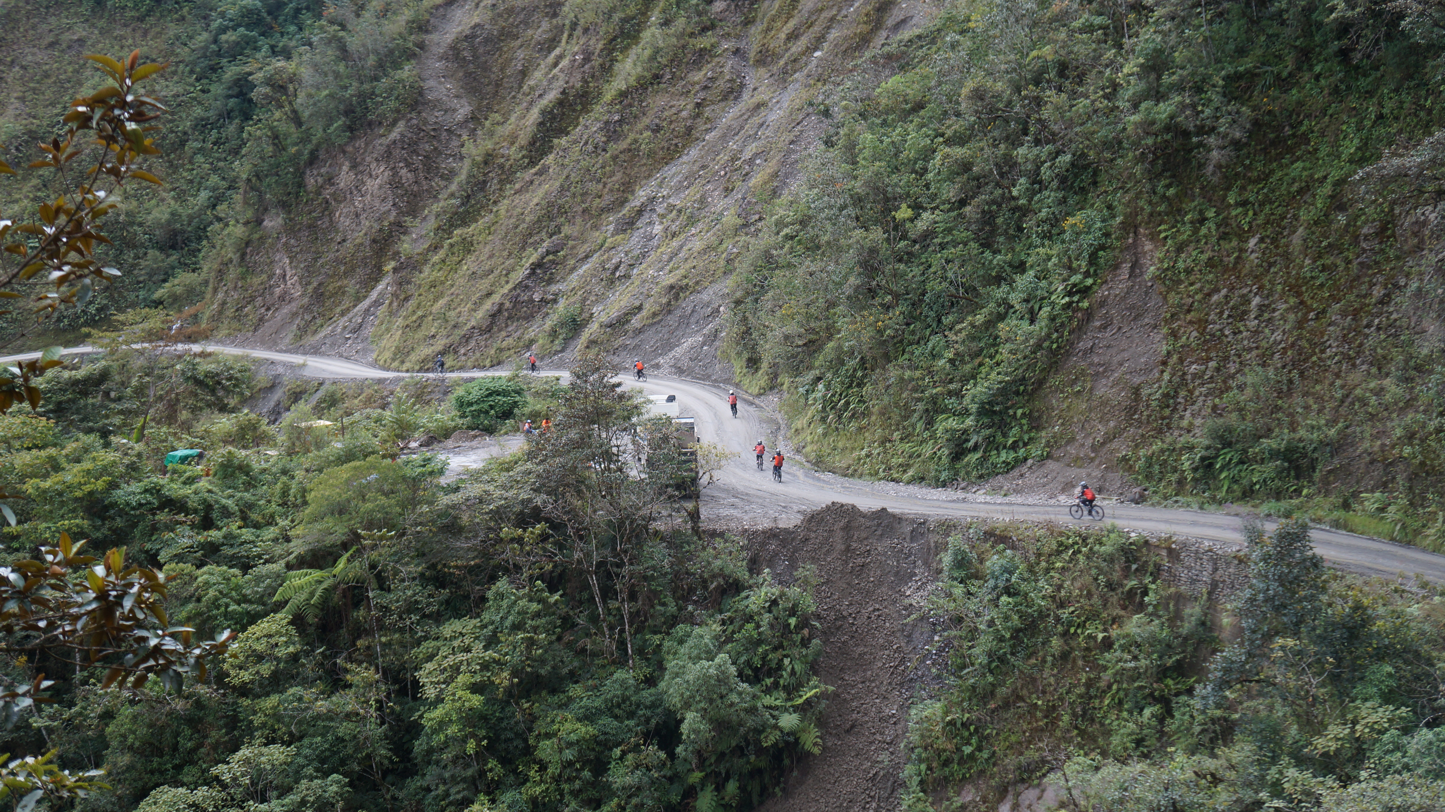 The guides, who were excellent and brought lots of high energy and confidence to the day, gave everyone high fives and congratulated us all for safely passing this difficult section. After this point the road widened slightly and the drops weren’t quite so vertical. A thick layer of bushes and shrubs now grew on the edge of the road and humorously our guide’s advice if we went over the edge now was to try to grab onto the plants or a vine and hang there until they could pull us back up! Oh, so simple!