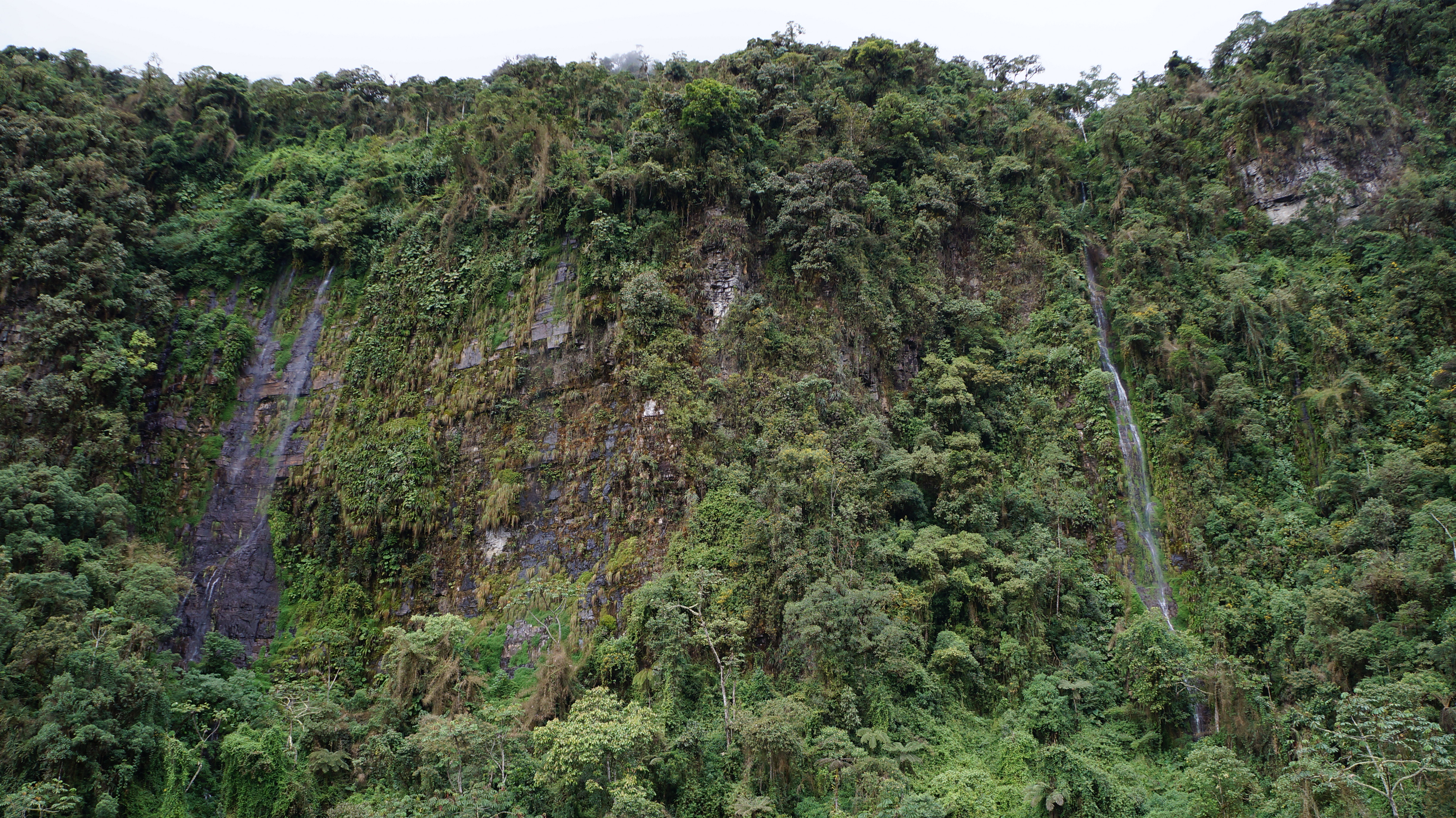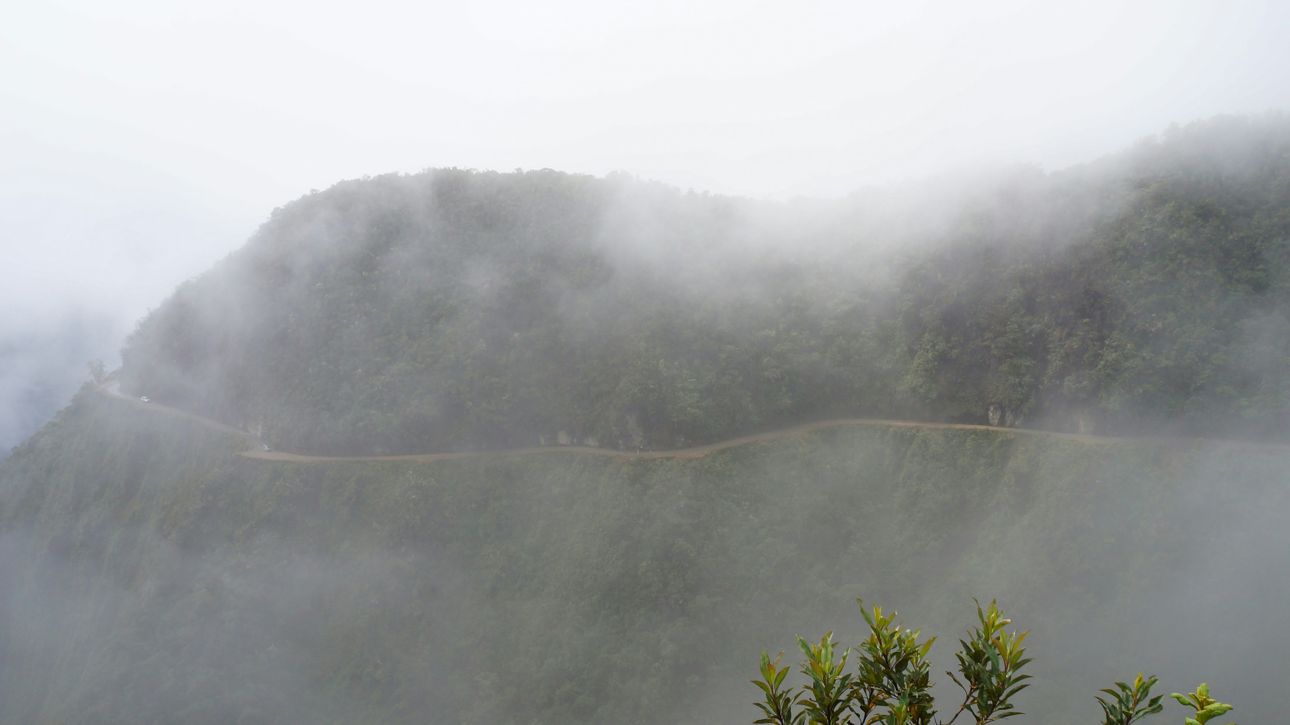 Then, quite suddenly, the clouds started to lift and we were given the first glimpse of what we’d let ourselves in for. To the untrained eye the road may not have been obvious at first as in places it was only 3 metres wide and it hugged the curves of the mountains shrouded in dense green vegetation. In many places the drops from the road looked vertical and we could see places where parts of the road had eroded and crumbled to the valley below.