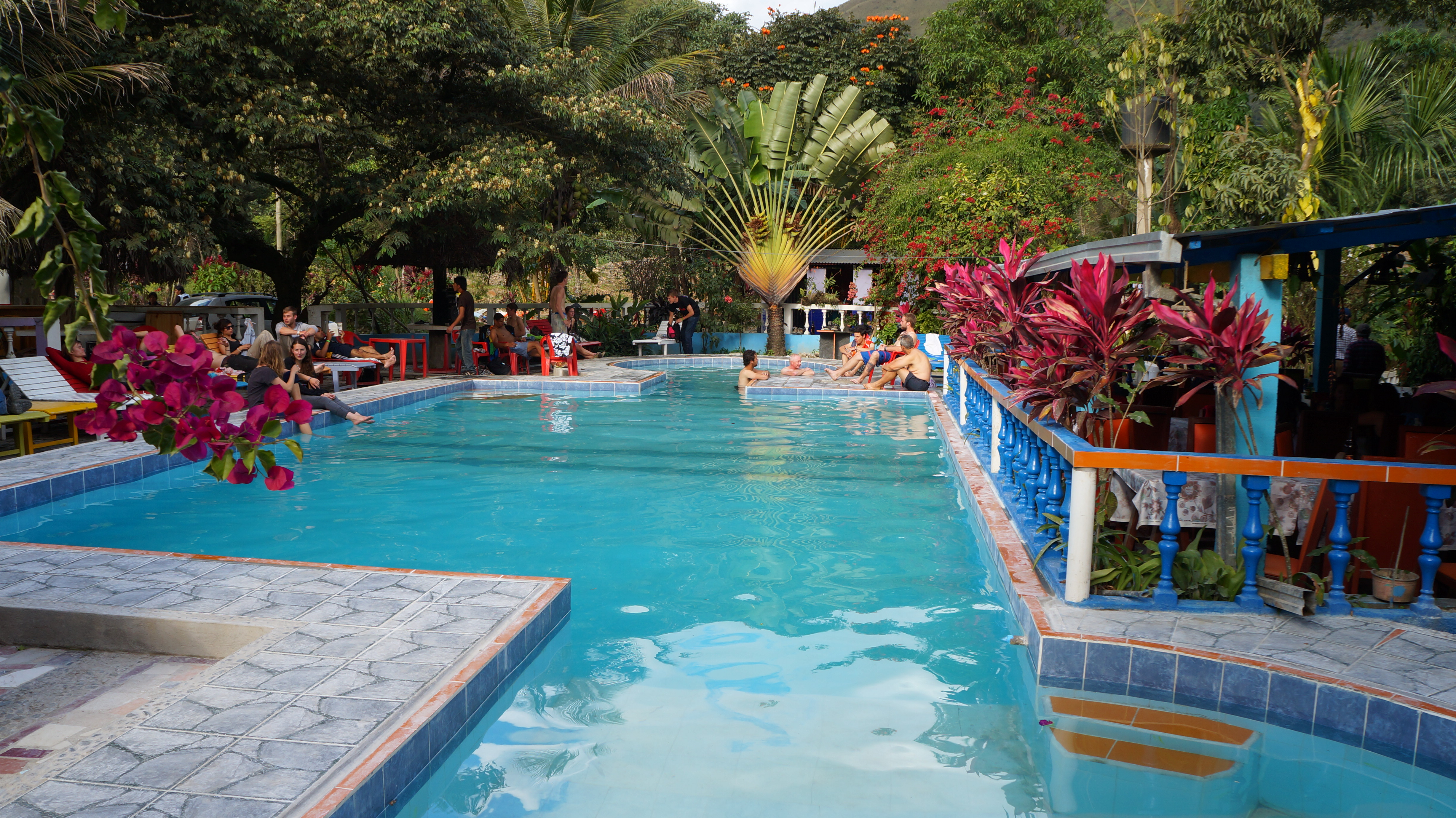 We took a side road from here and rode down a steep and occasionally challenging series of unpaved switchbacks. The foliage either side of the path was overgrown with verdant greenery and it was necessary to think ‘thin’ thoughts to squeeze through small gaps. The minivans were waiting for us at the bottom of the track and after we’d helped to load the bikes onto the roof we flopped into our seats with our bodies feeling as heavy as a sack of potatoes. It was only 10 minutes drive to a small rustic hotel where we stopped for nearly 2 hours to relax, swim in the pool and gorge ourselves on a tasty buffet lunch.