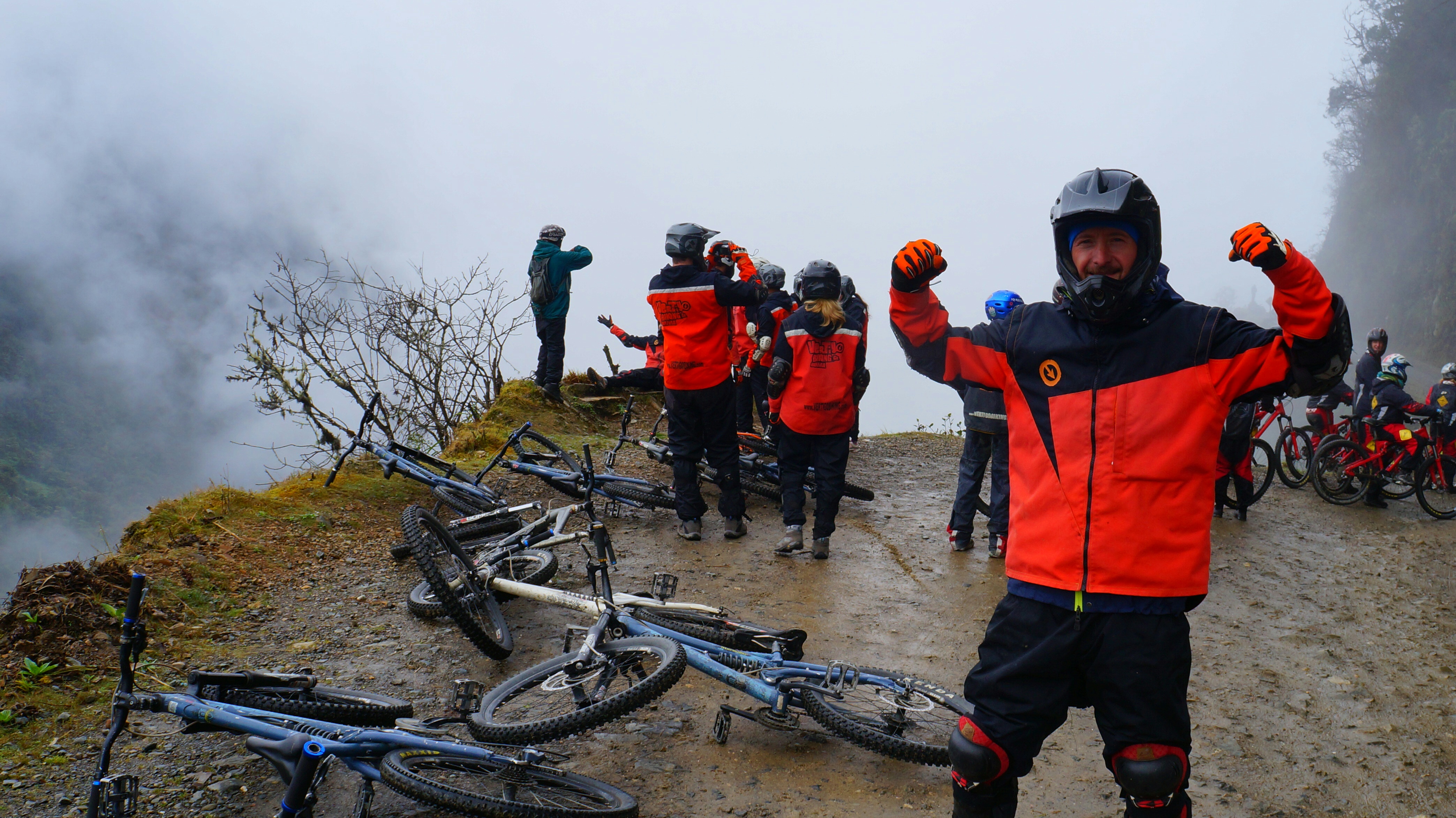 The clouds were still all around us so initially we couldn’t see what lay ahead but we all walked around with nervous energy as our gear was unloaded. More team pictures in various poses were taken along the edge of a sheer drop and our guide was especially fond of the Usain Bolt pose.