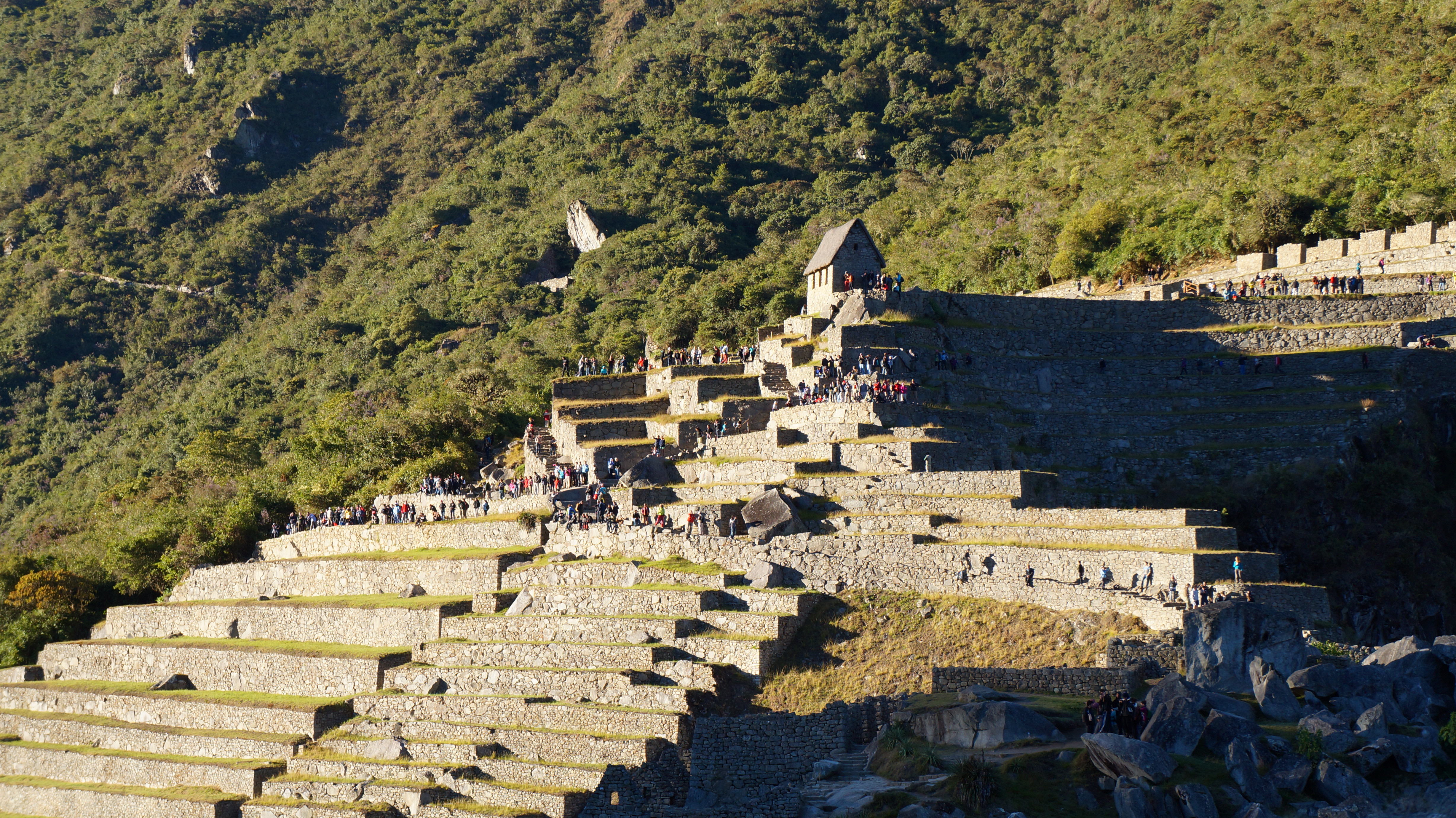 We watched the sunrise from the top of the Sacred Plaza. The first place the sunlight hit was The Hut of The Caretaker, which is the only ruin to be fully restored with a thatched roof. Many tourists had chosen the terraces next to the hut to watch the sunrise and their eager faces glowed in the sun’s golden rays.