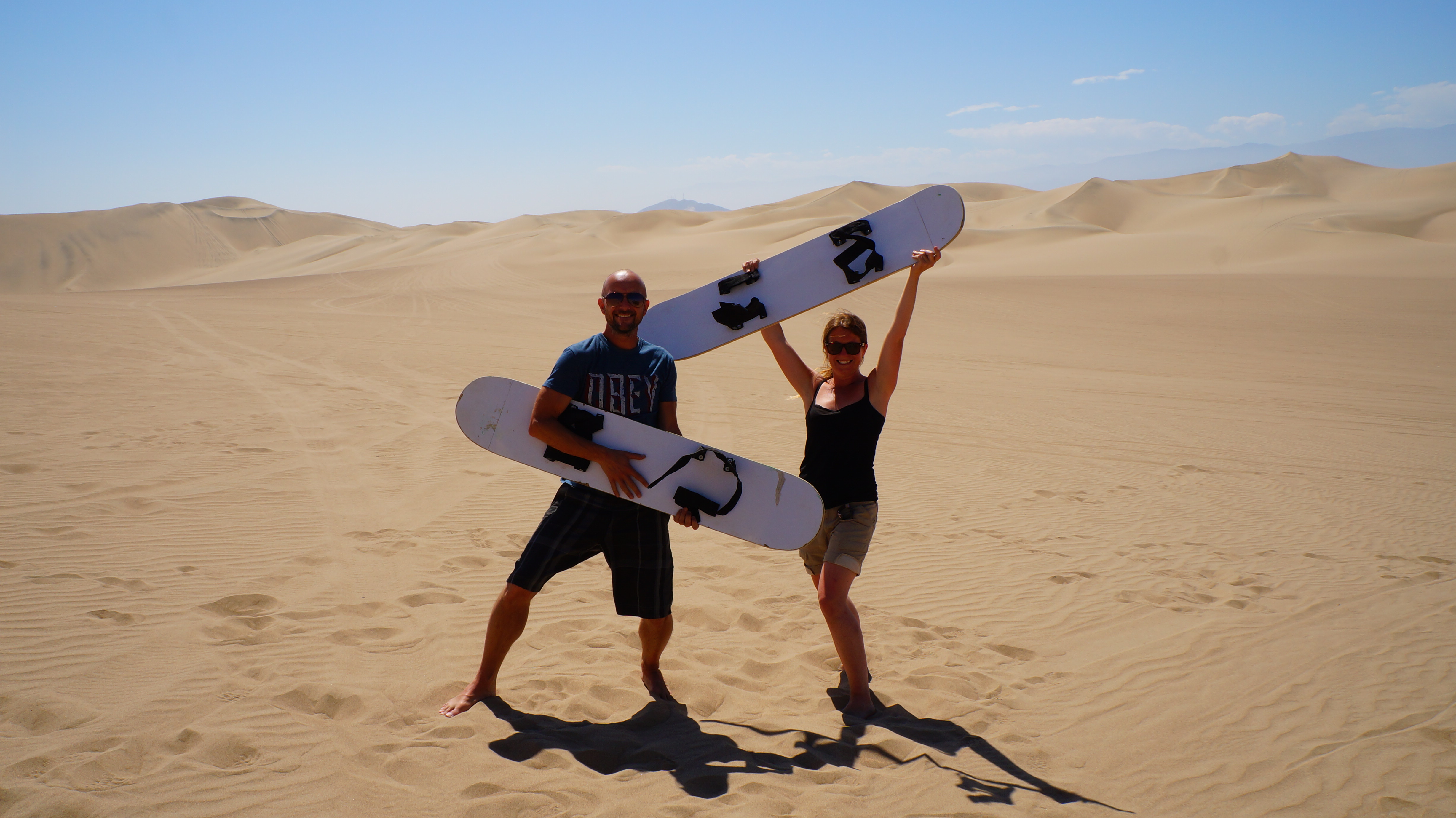 We’d tried sand-boarding once before whilst on holiday in Australia and although we were pretty bad at it and at times resembled ‘Eddie the Eagle Edwards’, a one time British ski jumper with the coordination of Bambi on ice, we absolutely loved it and couldn’t wait to try it again. Sand buggies lined the edge of the dunes and departed when full. Like on the roads in Peru, the drivers were certified maniacs and only knew one speed – fast! At least on the dunes there was no oncoming traffic and nothing to hit although our macho driver did seem to derive some kind of perverse pleasure by making the women (and even more so the men) on the buggy scream. The sensation was similar to that you might get on a Disney World rollercoaster – the excited anticipation as we climbed the side of an enormous dune, that moment when all you can see is the sky above, and then hurtling down the other side with your stomach still at the top – what a rush!