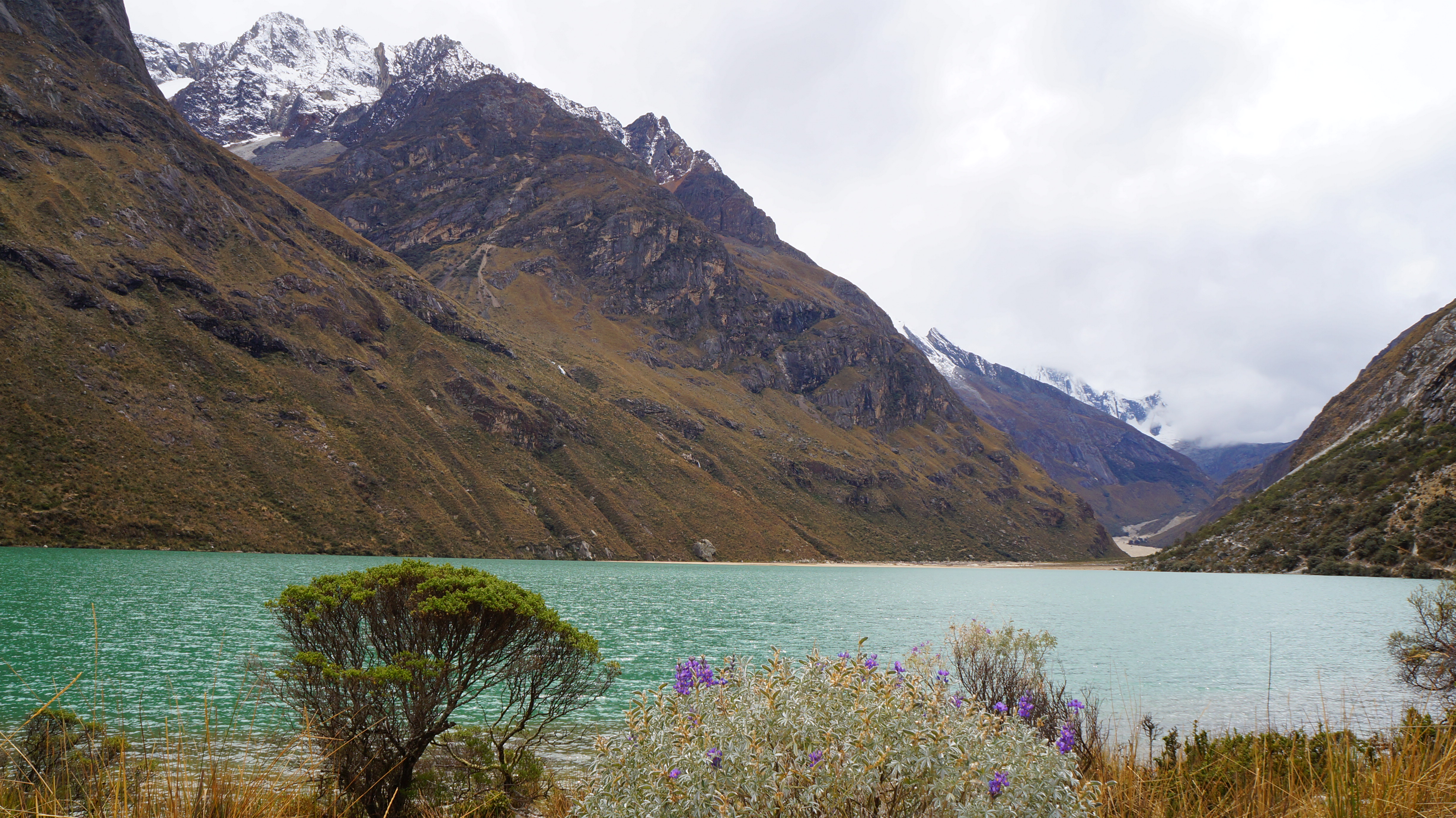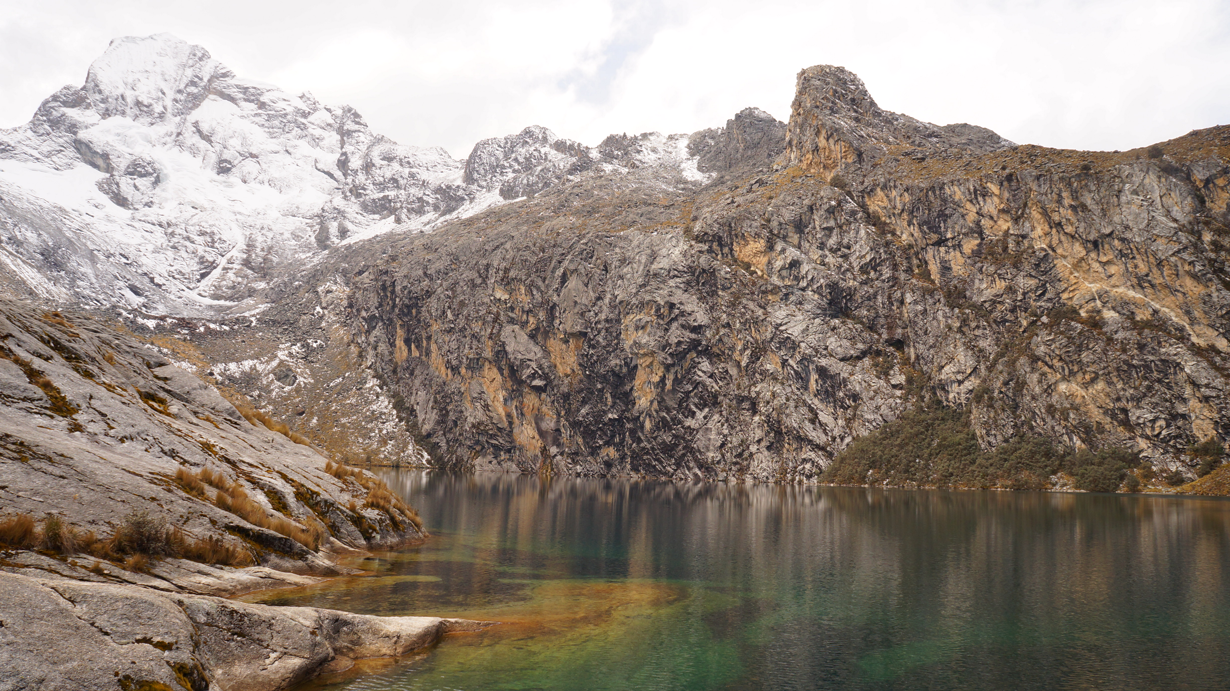 We awoke on the third day to low-lying clouds obscuring most of the views we’d enjoyed the afternoon before. The high-definition scenes were now a little grey and fuzzy around the edges but we enjoyed how the whole area felt like a different place. After breakfast we made a 30 minute climb to Arhuaycocha lagoon which is tucked under the towering summit of Jancarurish.