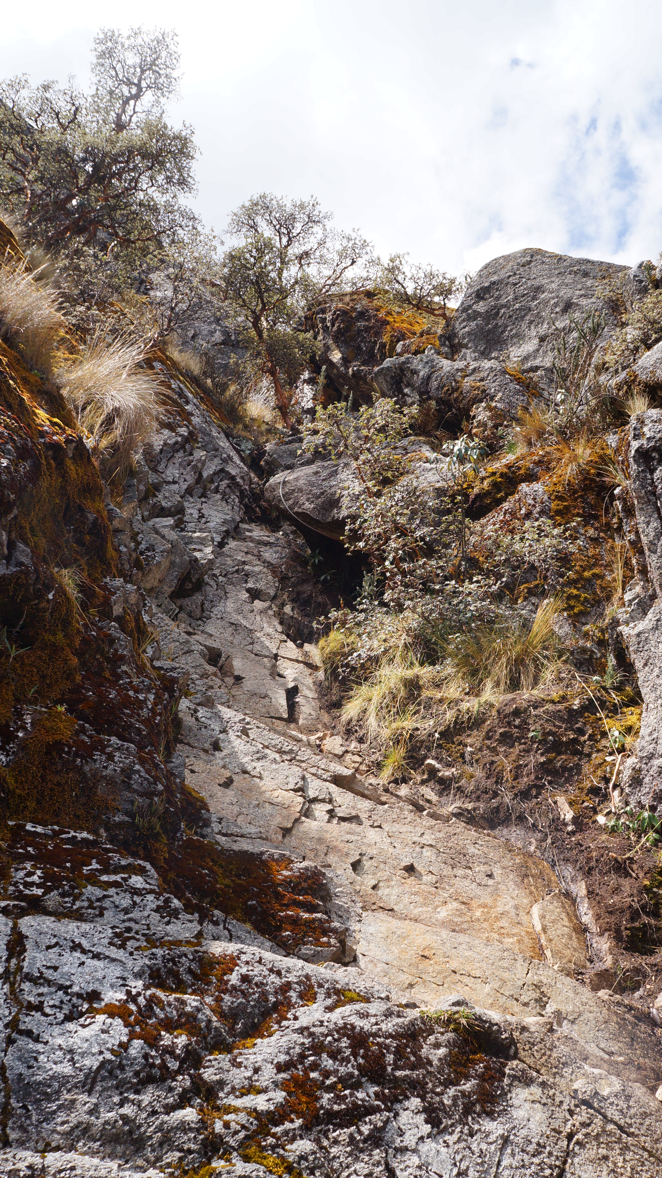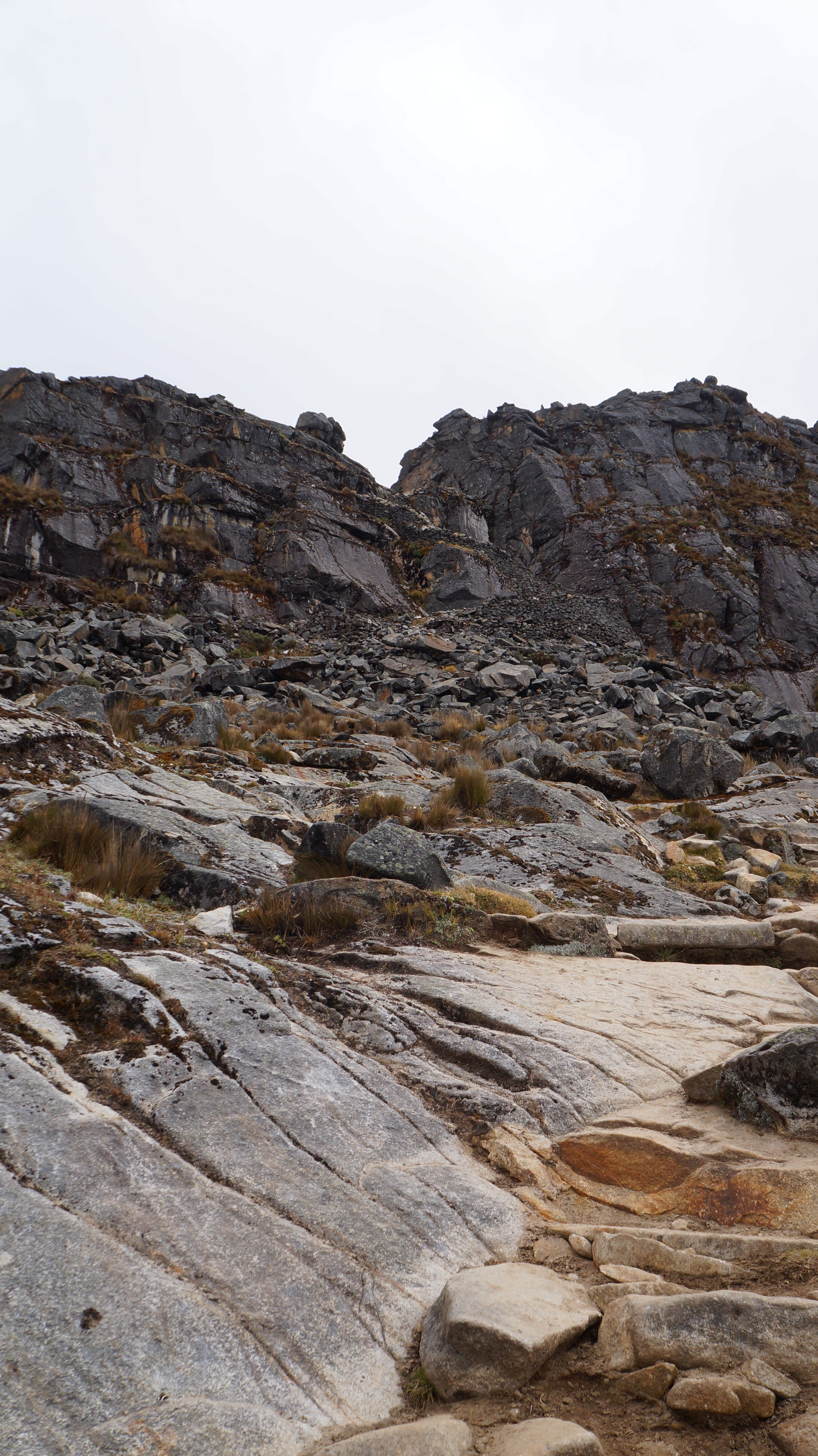 From our camp it took nearly three hours to reach the pass, the first two hours a steady uphill climb and the last hour a steep scramble up scree paths and flat sided chunks of granite rock. The views continued to amaze us. Brown and green coloured moss covered grey rocks, yellow Andean grass swayed in the breeze and white-tipped mountains were accentuated against blue skies. If an artist had painted this picture, they would have been accused of creating a fantasy world…but here we were walking through it.
