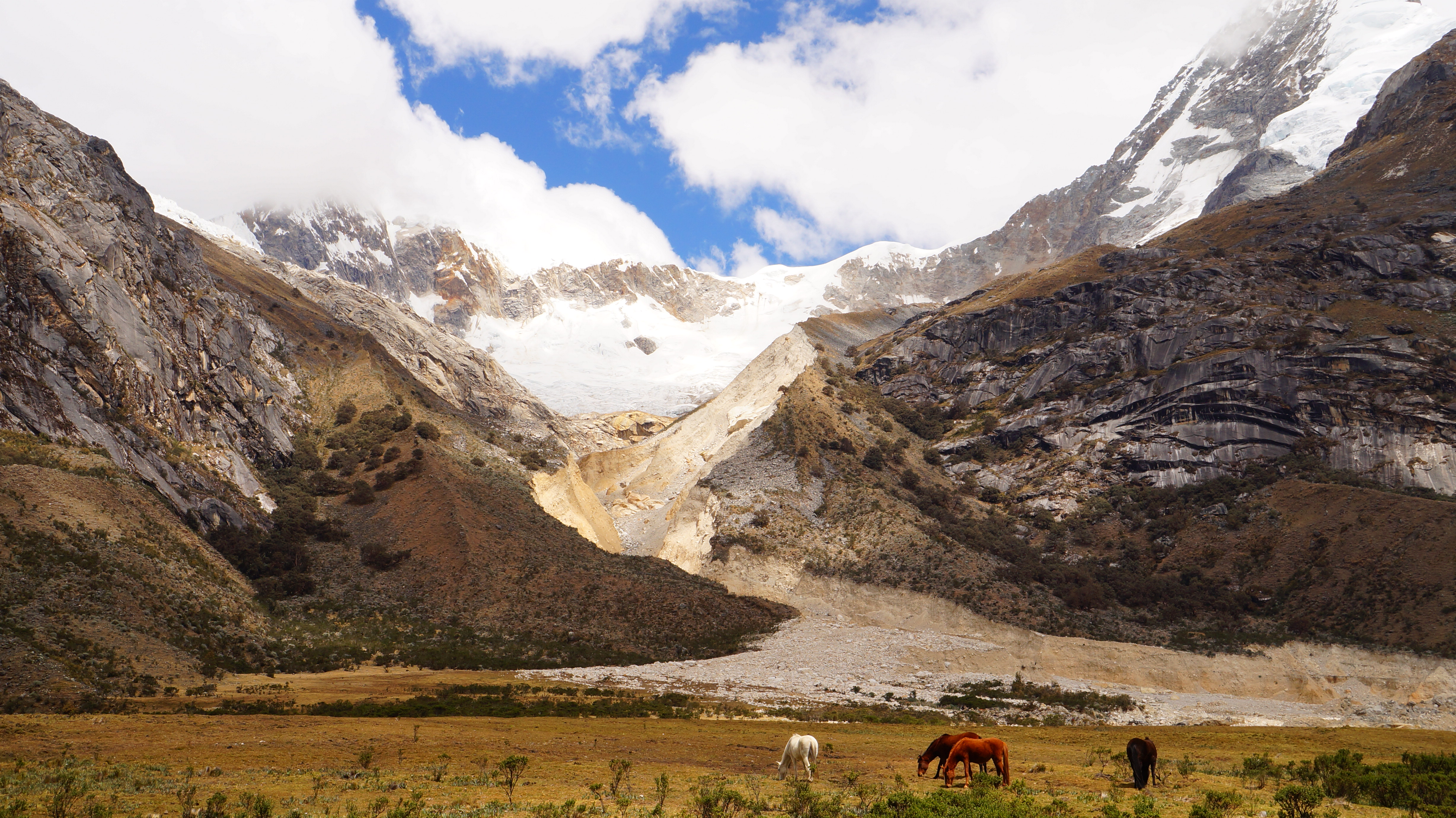 The path was easy to follow and the villagers were keen to point us in the right direction. In the valley below, Huaraz was nestled in-between the mountains and from where we were it looked like a toy town. We could see that the rolling grasslands and ice-cold emerald rivers which surrounded us, transformed at higher altitude into pale grey granite rocks and photogenic snow-capped peaks.