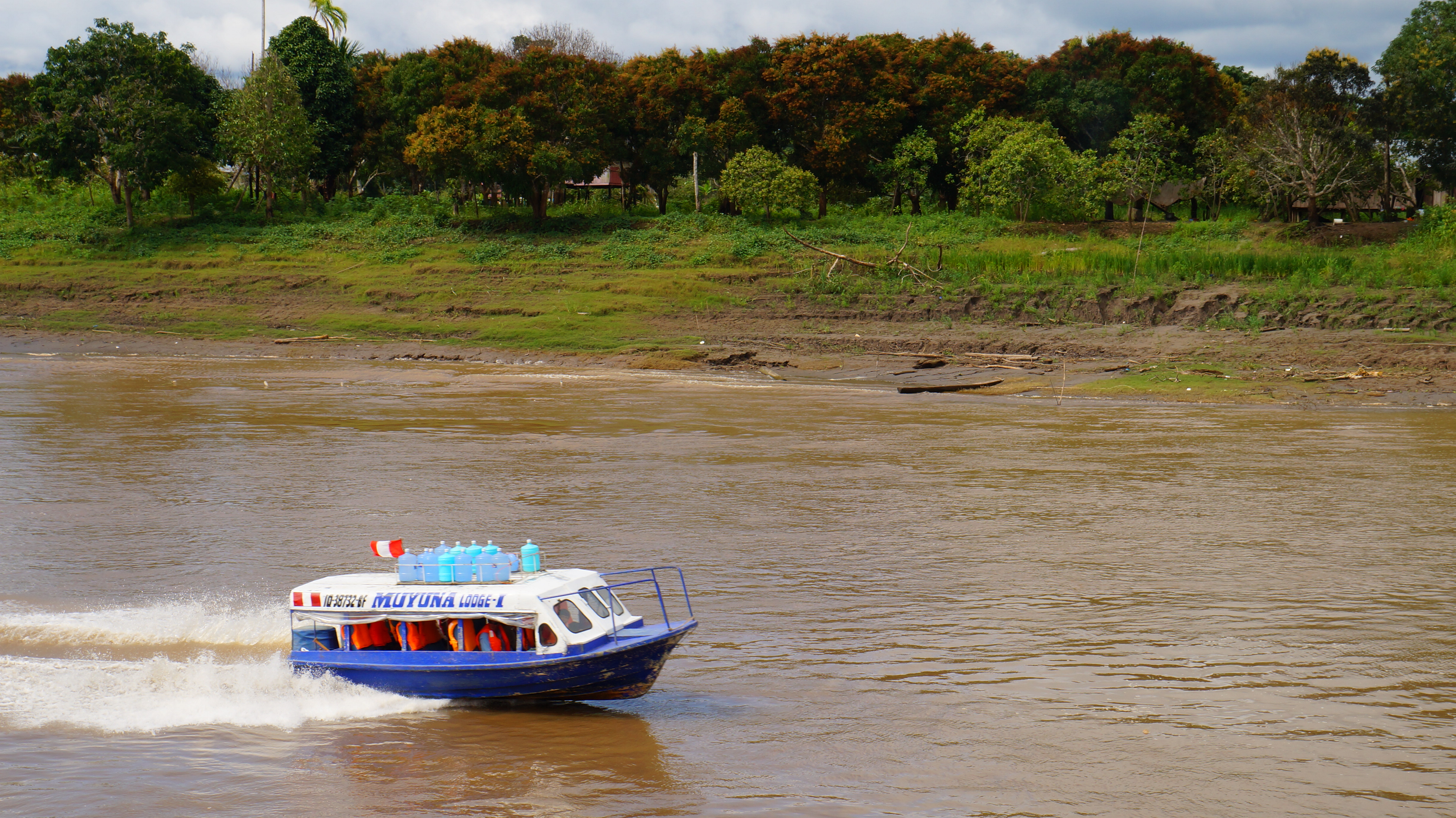 The distance between small settlements became shorter the closer we got to Iquitos. These people enjoyed a rural way of life but were close enough to the big city to be able to pick up anything they needed in the space of a day. We noticed that the river had become busier all of a sudden too, with long boats taxi-ing passengers around, slightly more commercial looking fishing enterprises, and we even saw a dug out canoe. We passed closely to the shore at times which enabled us to spot more wildlife. Giant butterflies fluttered on the breeze and a cunning bird flew back and forth hovering just above the river’s surface with the bottom part of his beak constantly scooping in the water. Several of the houses in different villages had a large painted rooster on them which we later found out was a symbol of the area.