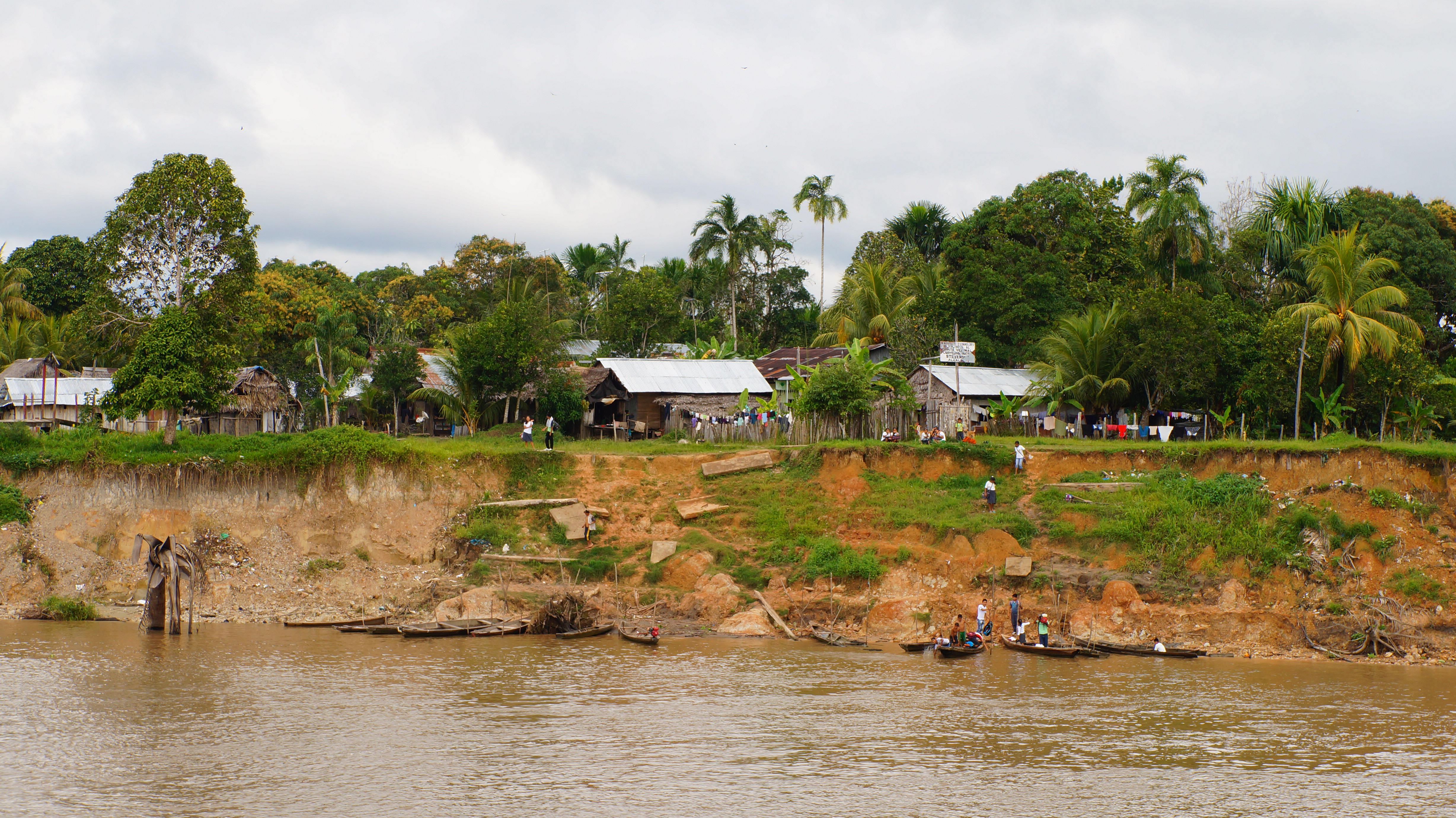 The houses here looked more substantial than those further upstream and a multitude of supplies were readily available, but somehow, even with more modern comforts, life seemed less idyllic. Rubbish lined the shore and flotsam bobbed on the water’s surface. Bony looking dogs roamed freely looking for their next meal and neon lights flashed advertising the local bar. We weren’t completely convinced that the price of progress would equal a happier life. We spent an hour at the dock unloading various goods and letting off nearly three-quarters of the passengers.