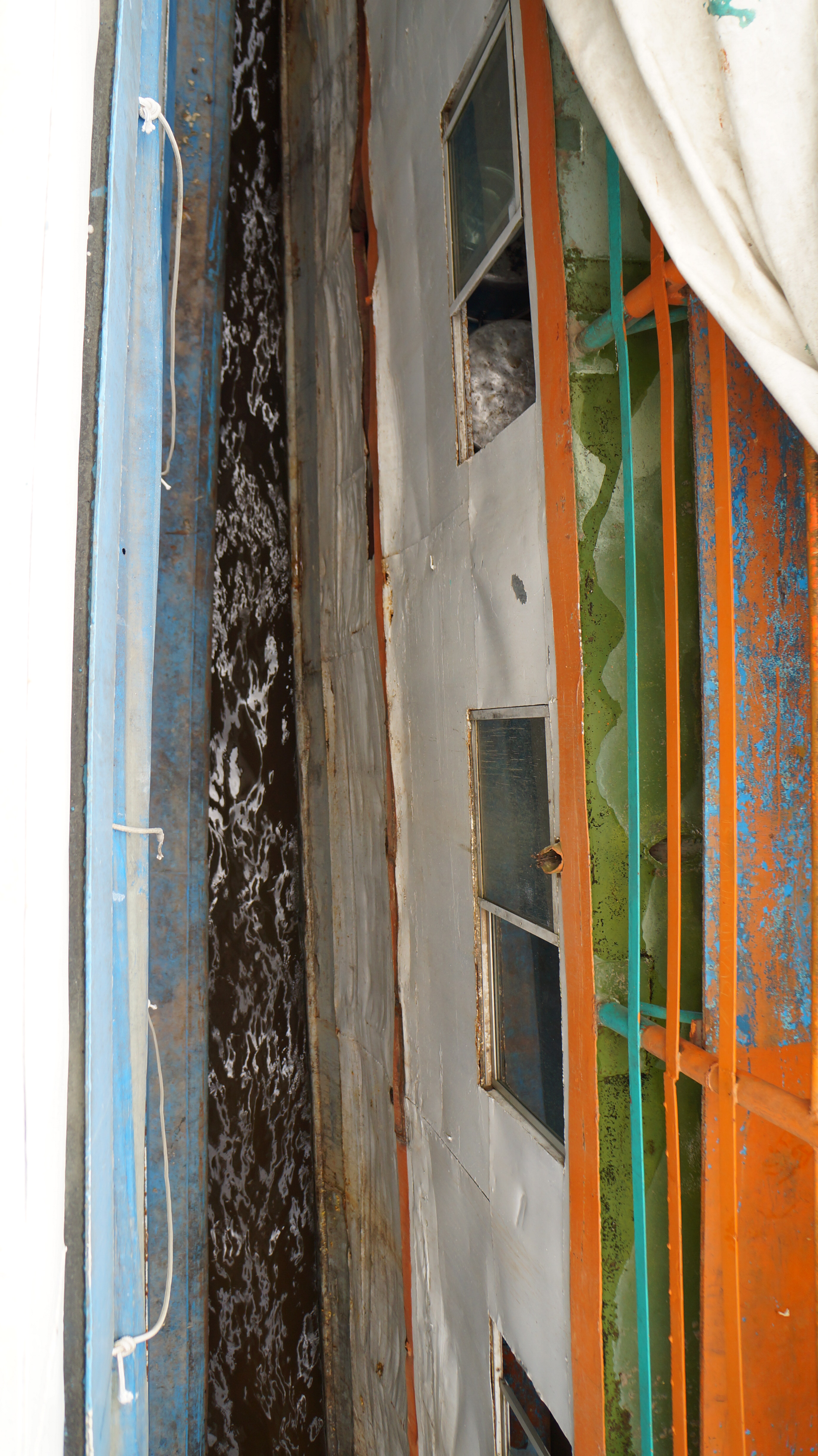 In places, we felt the floor bend as we stood on it and then pop back into place with a deep clunk. The lower levels of the boat were used for cargo and scores of men worked like trojans carrying all manner of good from lorries parked out front on to the boat. Three new motor bikes, furniture, hundreds of bags of cement and rice, giant water melons bigger than our heads, scrap metal, sacks of potatoes…you name it, it was being loaded on.
