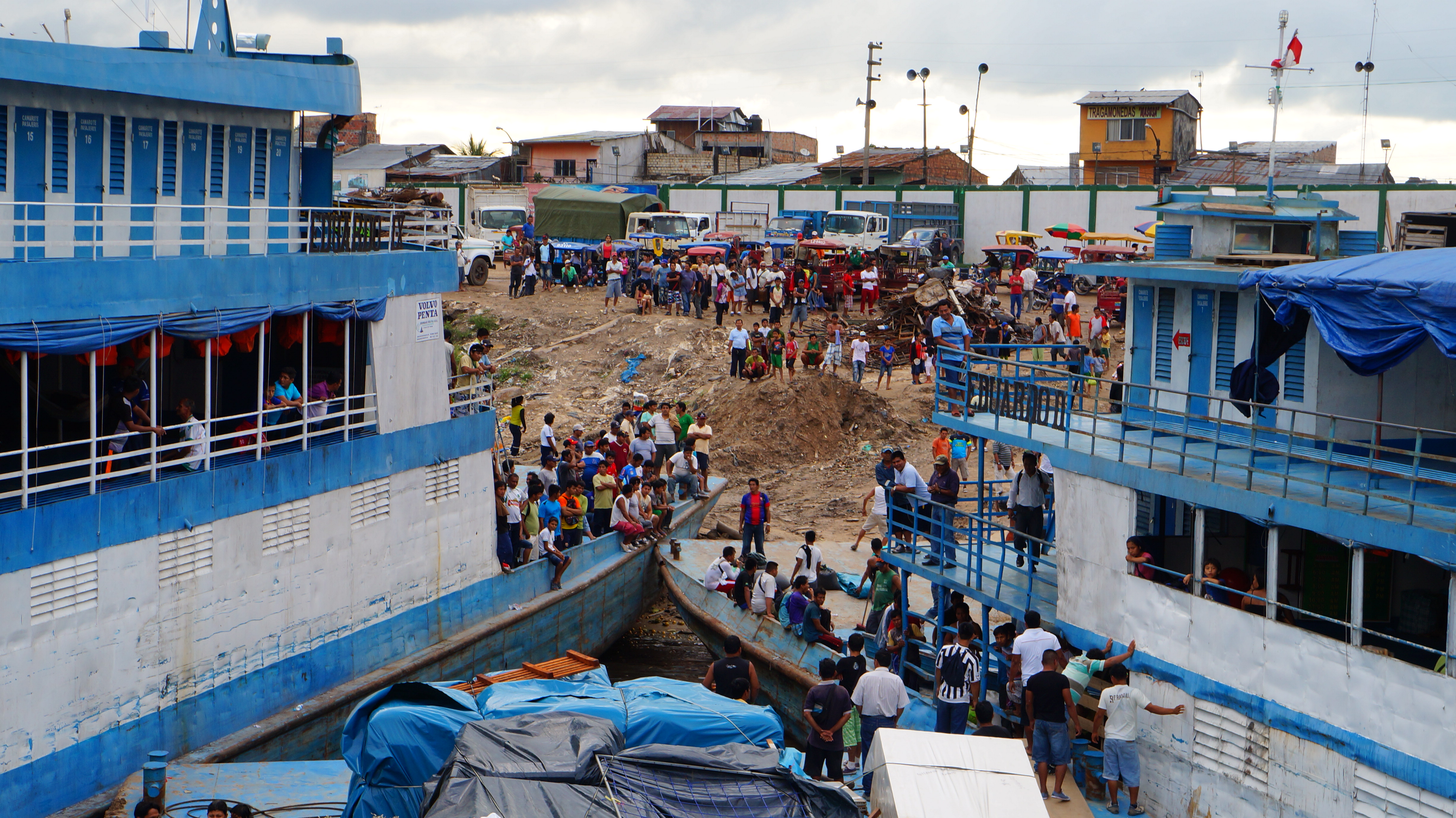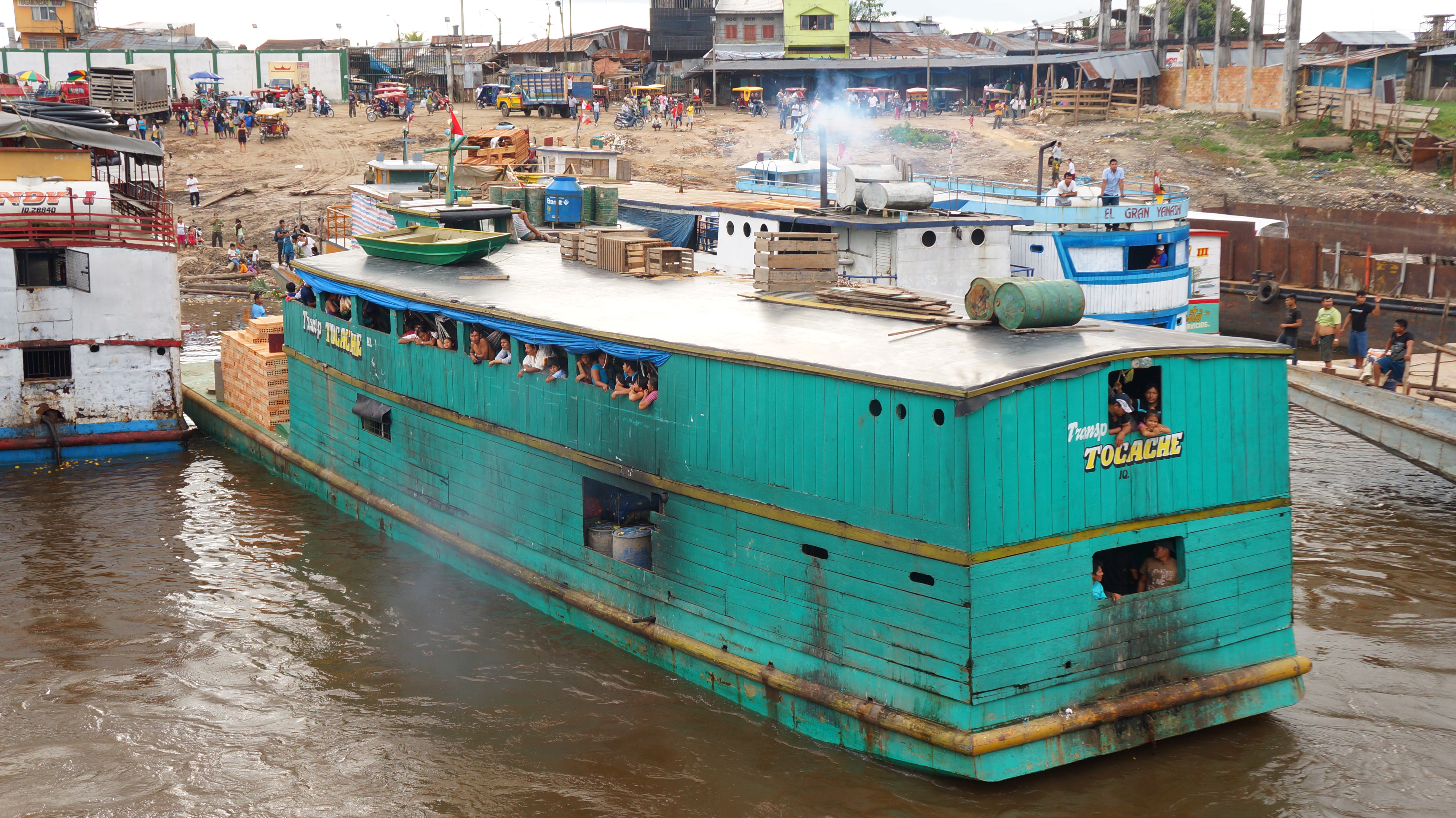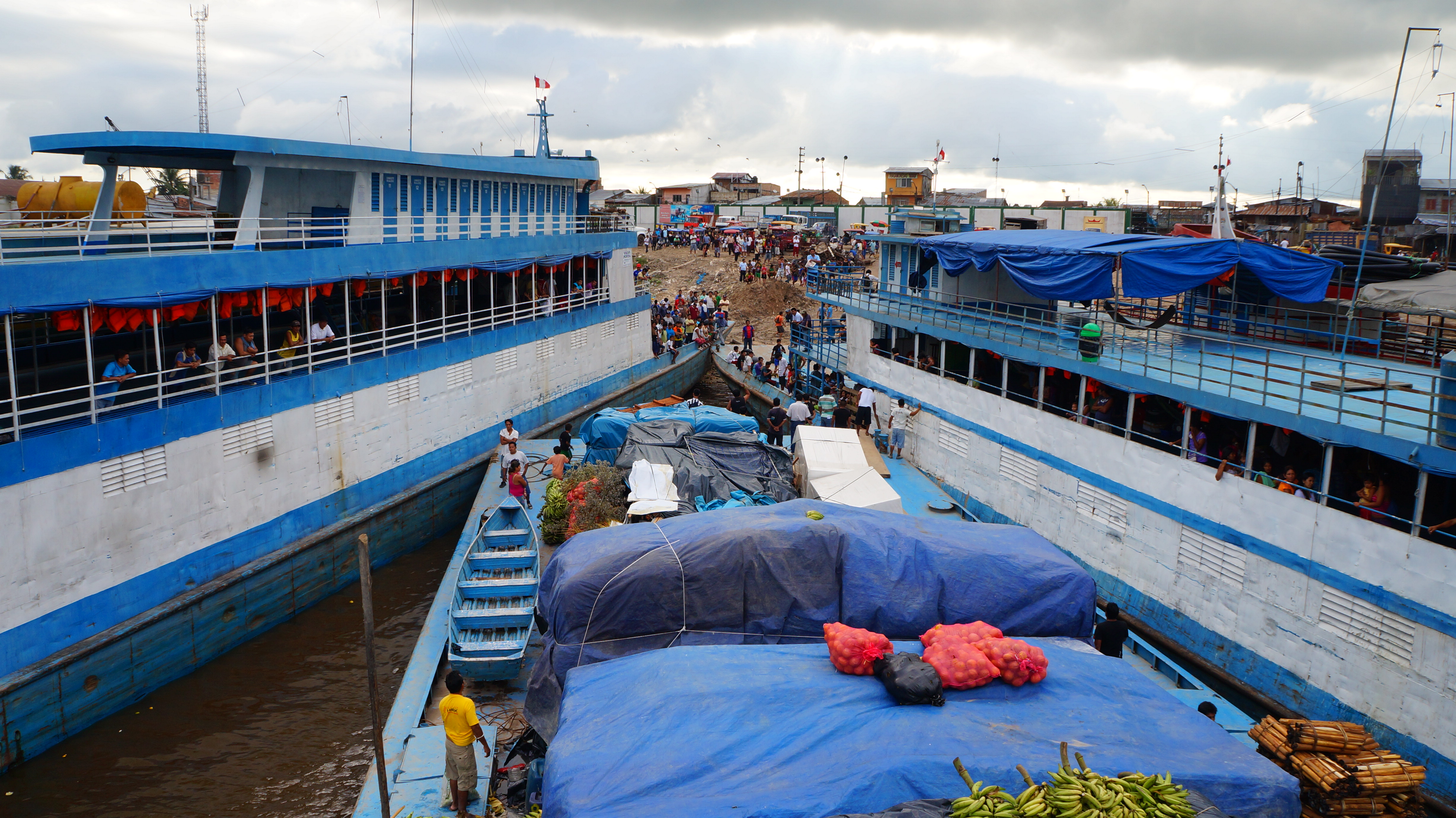 This was Peruvian driving at it’s best as the captain reversed for the sole purpose of having a good run up and then rammed the two boats either side full throttle. A lot of shouting and barging later, we’d managed to create just enough room to reach the shore and the engines were cut. Immediately the boat’s crew jumped into life and started lowering planks for secure walkways and unloading the precious cargo – because after all, time is money.