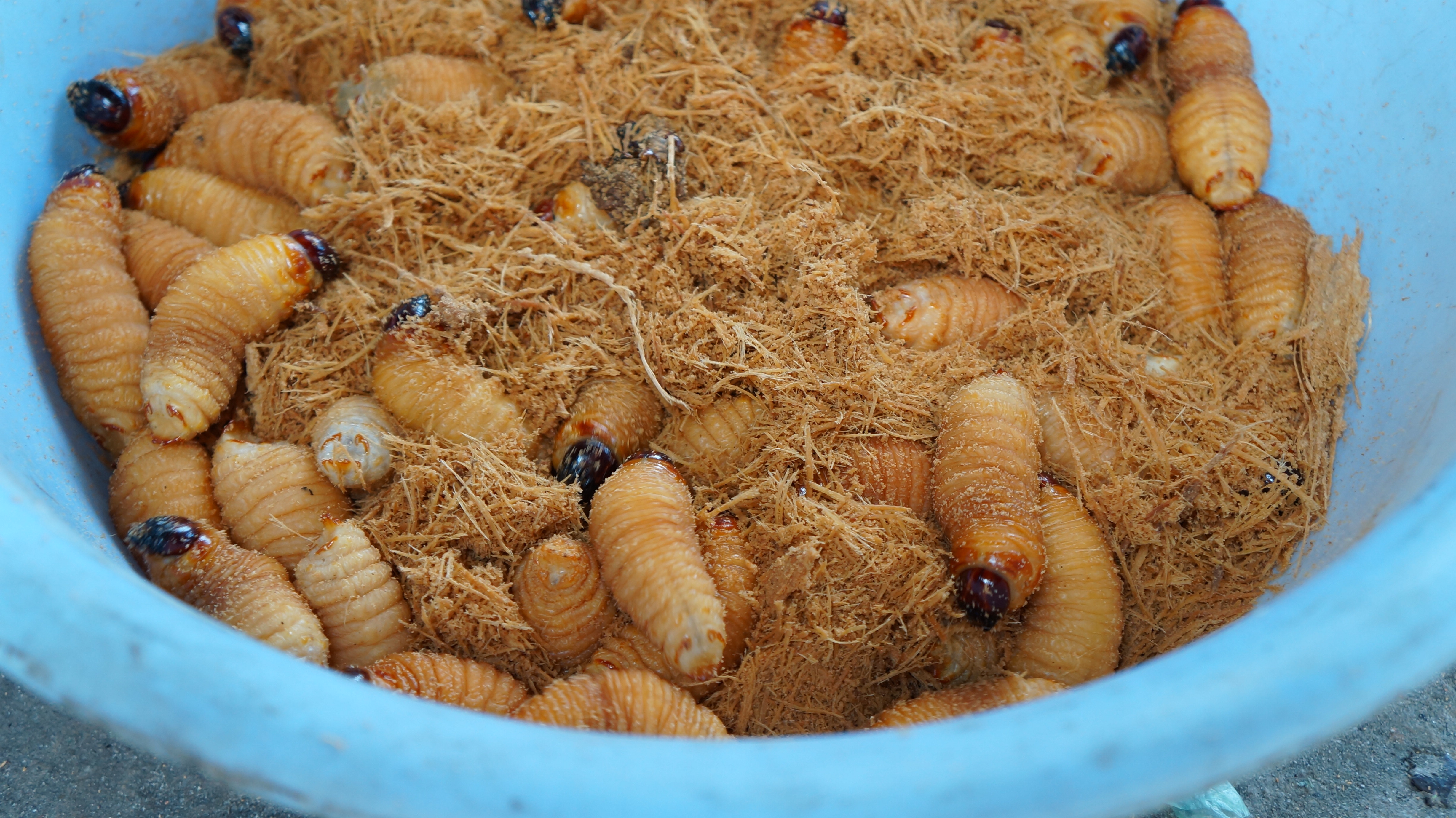 One lady called us over with a toothless smile and opened the lid of her bucket to reveal a writhing mass of yellow grubs each the size of a thumb. We both pulled a face that said “Yuk!” and politely declined her offer to fry a couple for us to sample.
