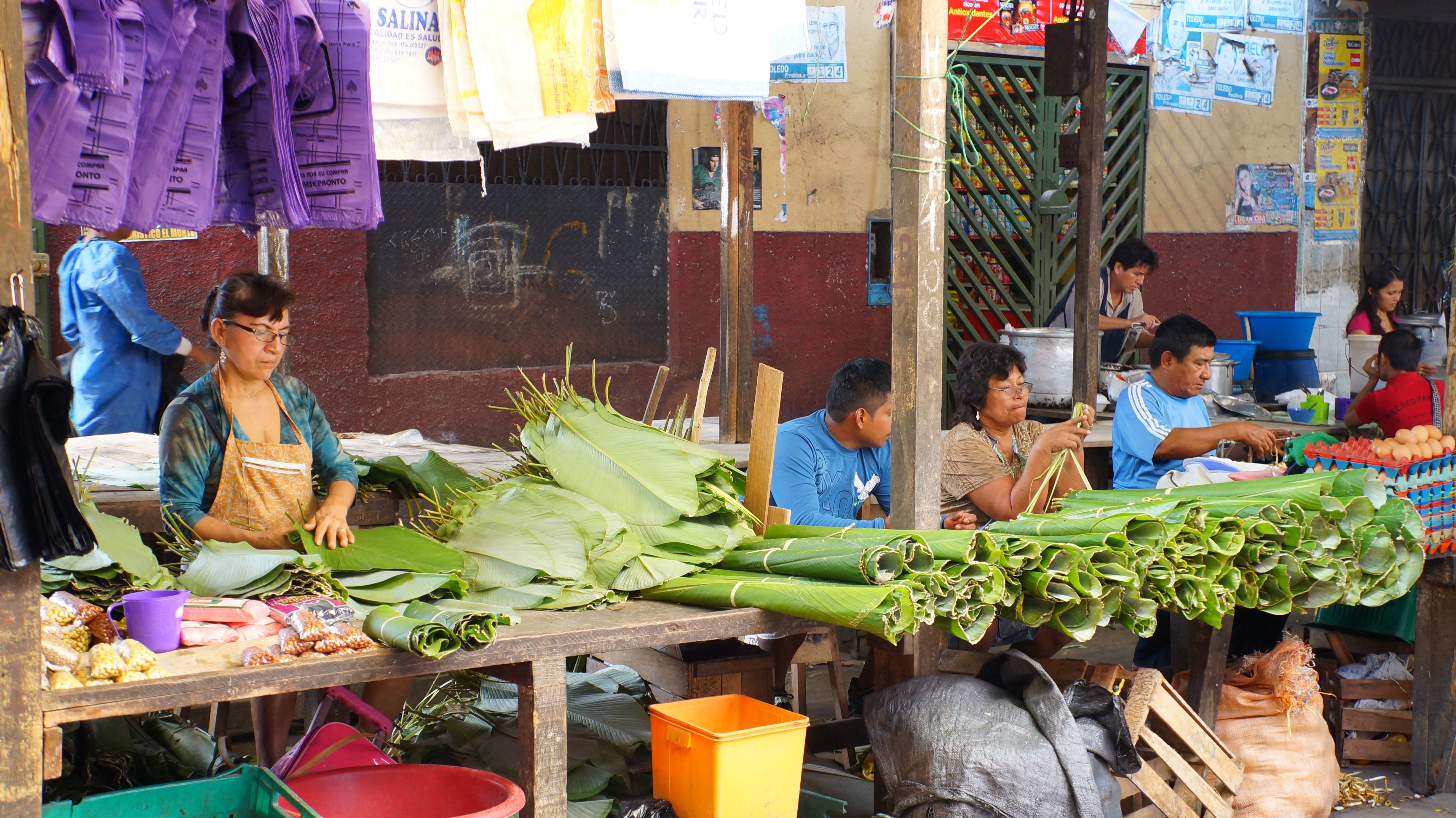 Several stalls sold rainforest specialities with leopard skins hanging from the walls, caiman teeth necklaces and potions and lotions made from ground plants for anything from hair restorer to Viagra. Young boys sat at tables piled high with strong tobacco and their nimble fingers worked it into rolled cigarettes. The music blared from stalls selling fake DVD’s and traders repeated their patter over and over.