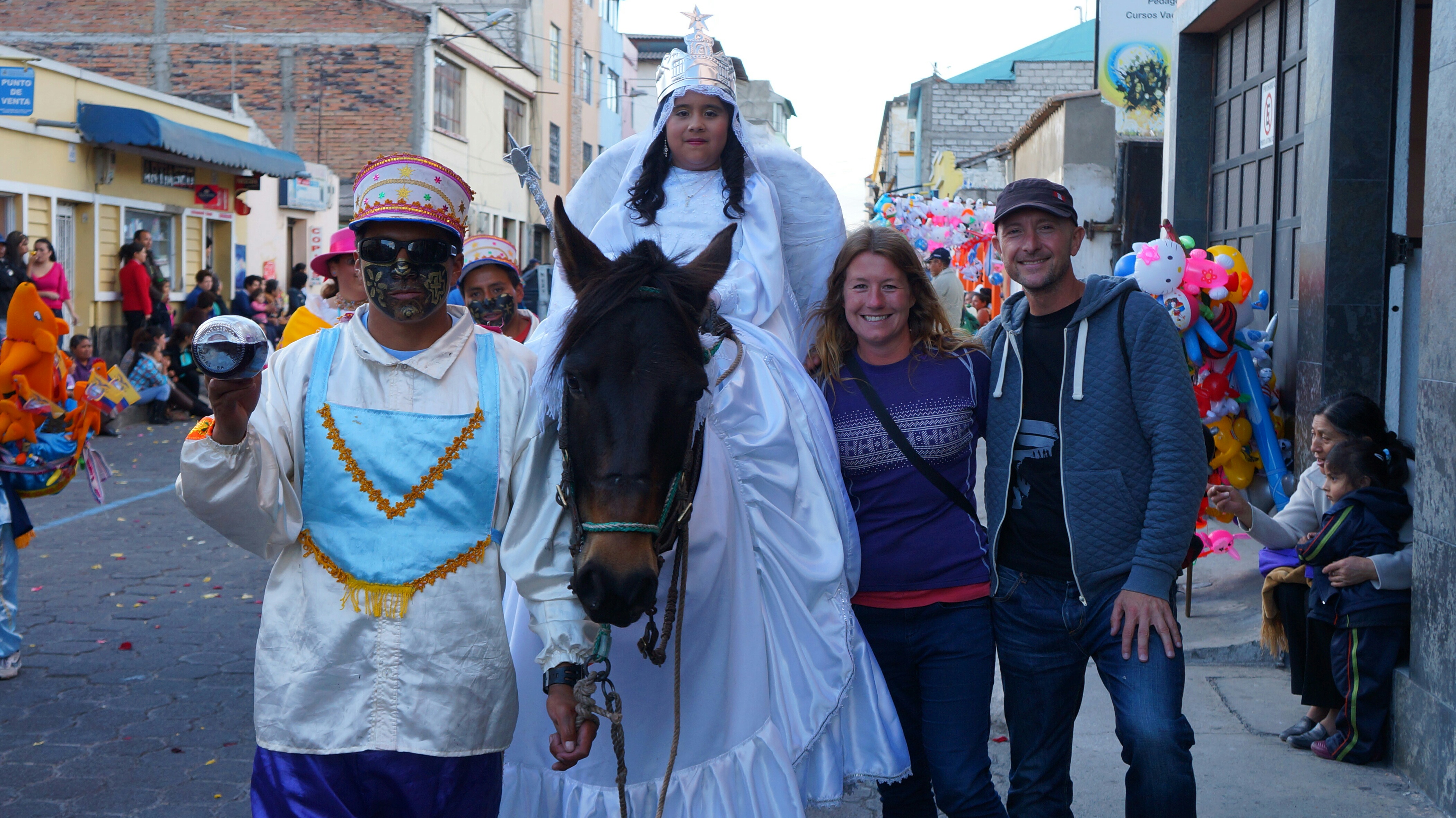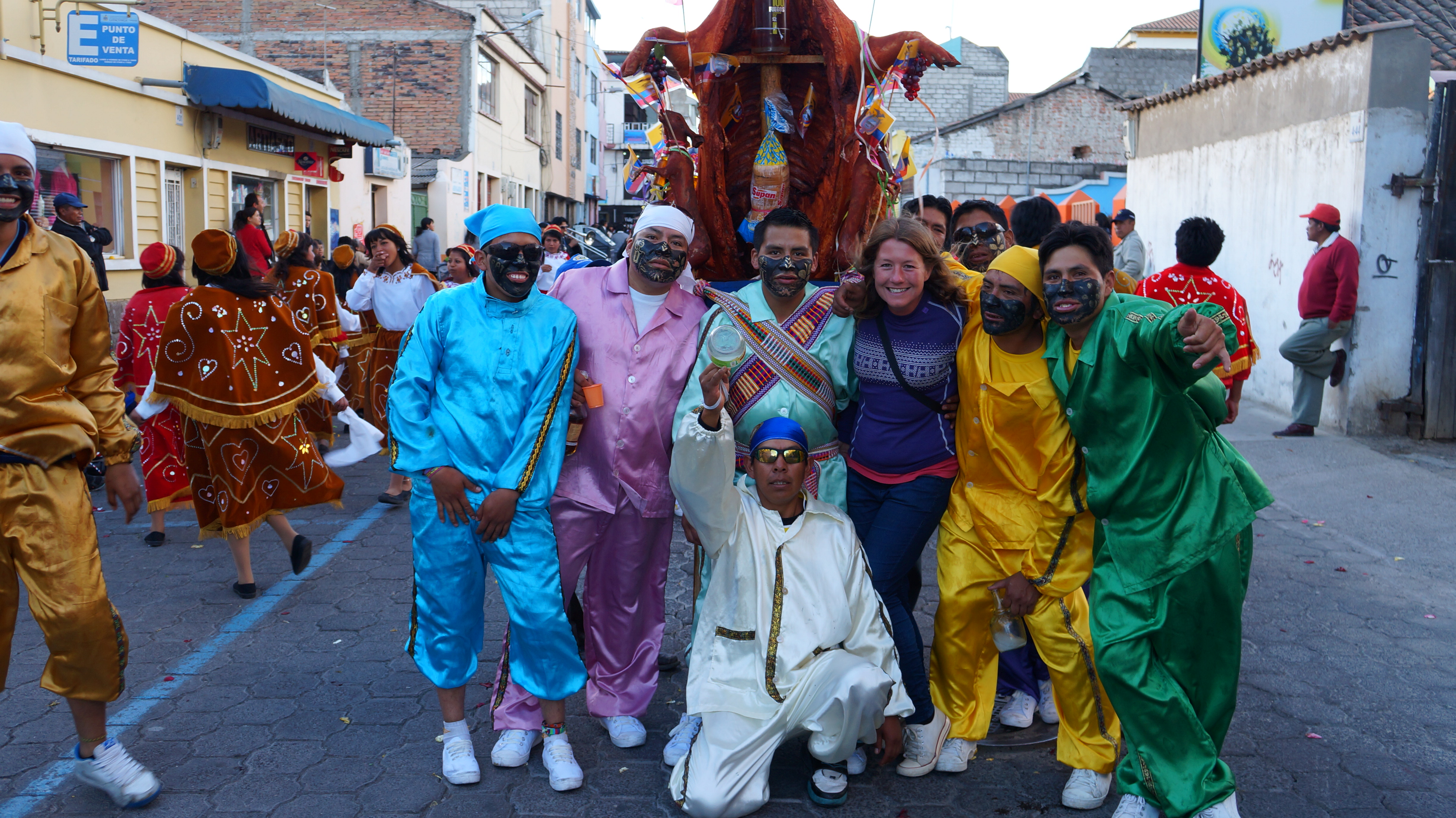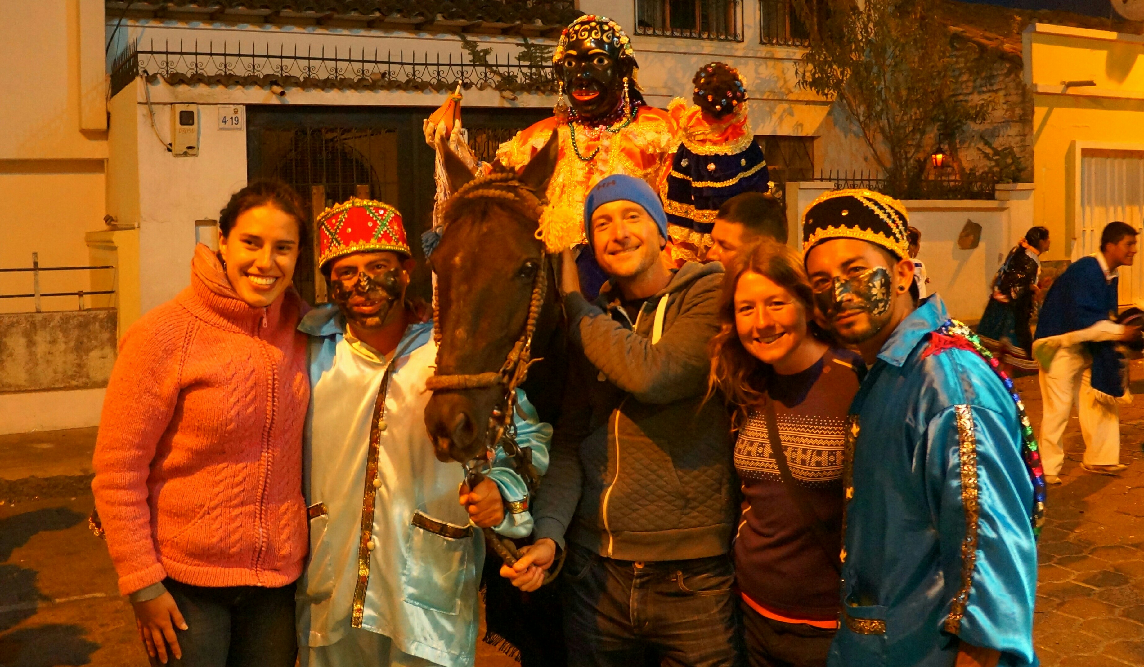 A man, dressed as a woman, with a blacked up face and riding a horse sauntered past us. A group of traditional Ecuadorian dancers span around with perfect rhythm and exuded seemingly endless energy. Staggering to make ten steps forward, a strong guy collapsed onto a stool to take a breather from carrying a whole roasted pig on his back which was decorated with cooked guinea pigs, large bottles of strong spirits and packets of cigarettes! We were stunned, enthralled and thoroughly entertained – this could only be the Mama Negra festival, one of Ecuador’s biggest and most loved festivals, which combines traditional culture and folklore in a two-day long fiesta.