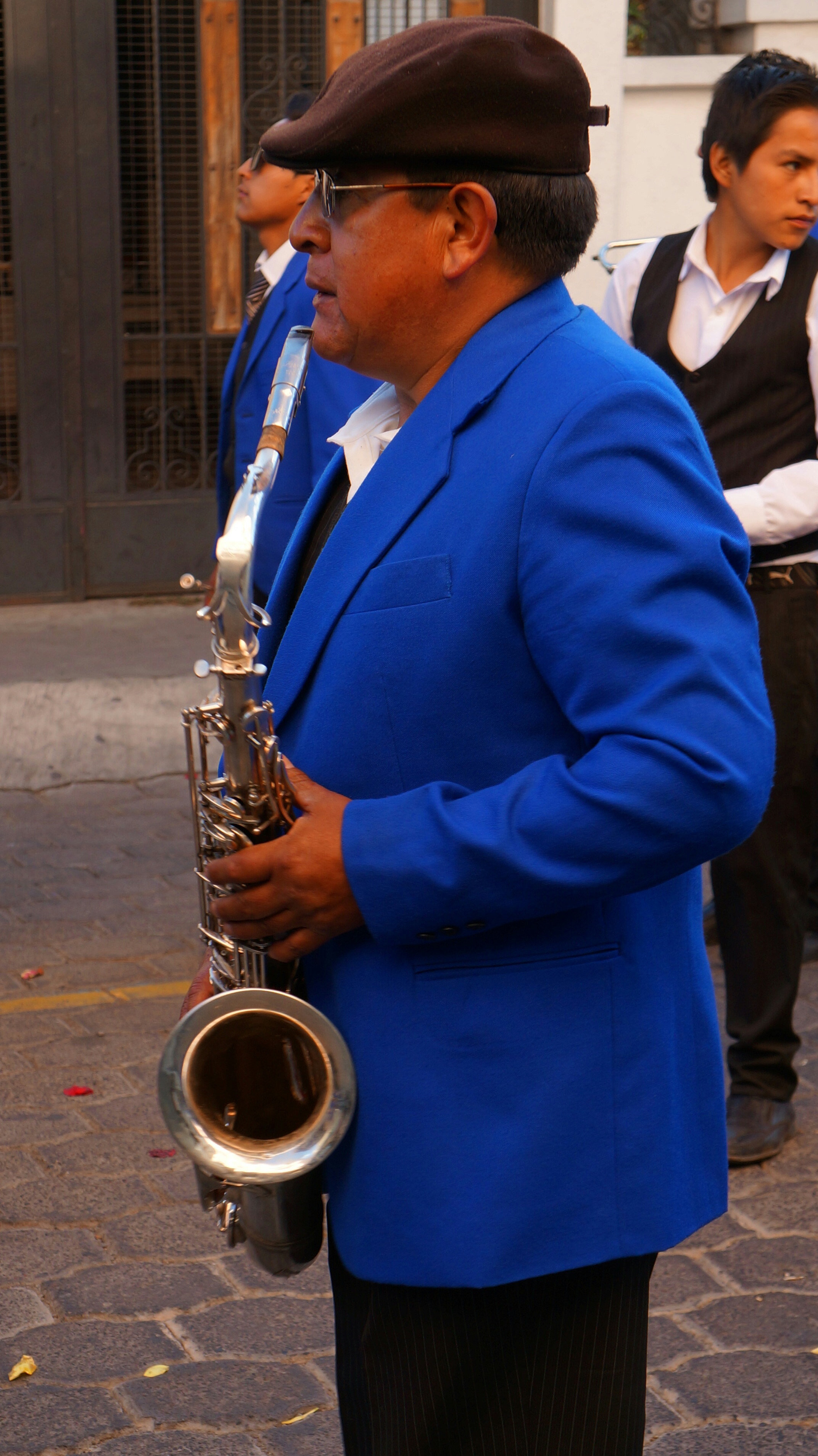 The ´Flag Bearer´carrying a multi-coloured flag preceded the ‘Captain’ wearing a smart military uniform with a feathered hat. The Captain is in charge of making sure the party is a big success and with a shotgun like that, we weren’t going to disagree with him! He shouted an order at me in Spanish and before I knew what was happening I was brandishing his gun. I´d like to say I looked fearsome but it was more like I was playing air guitar for the crowds!