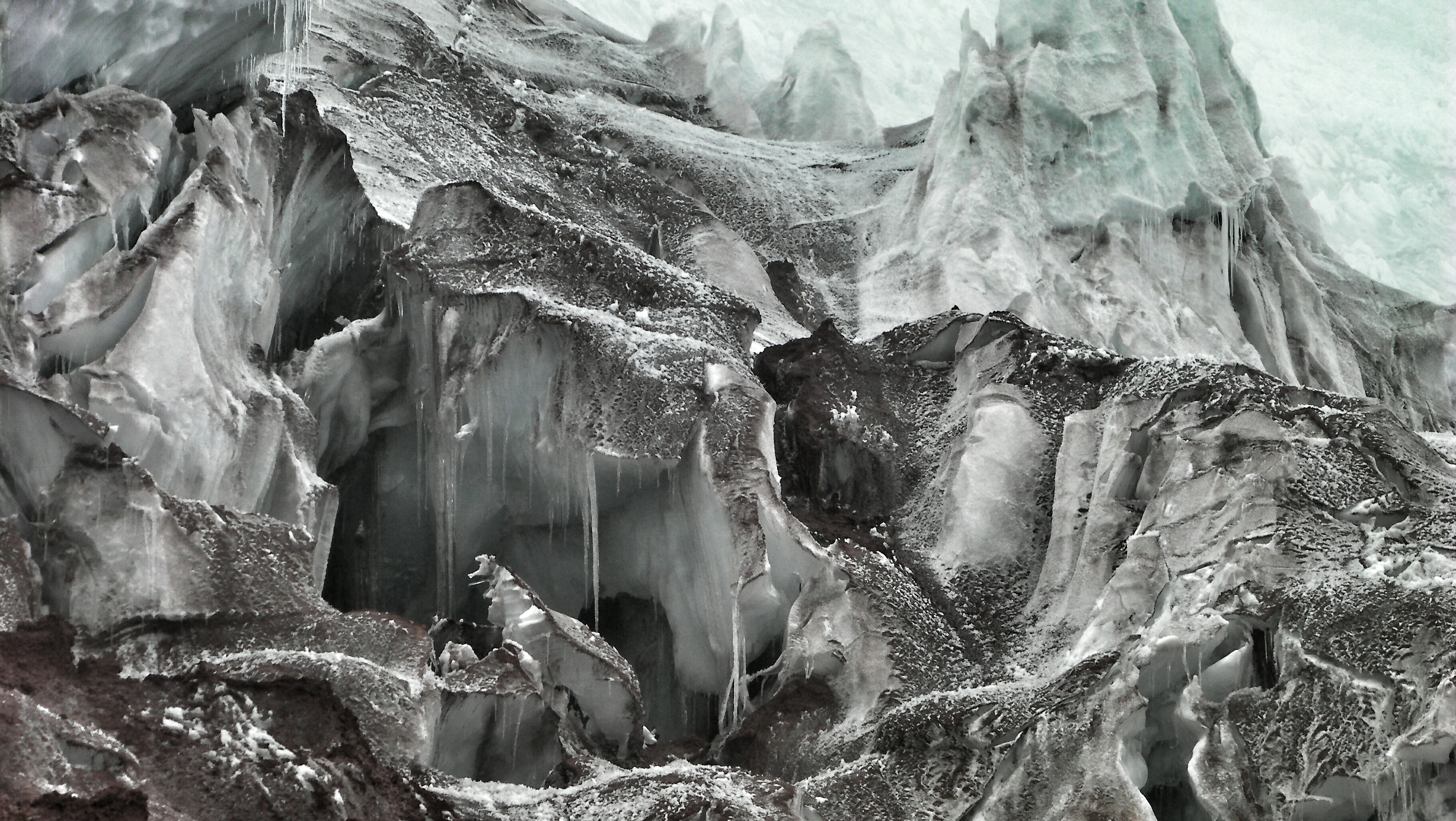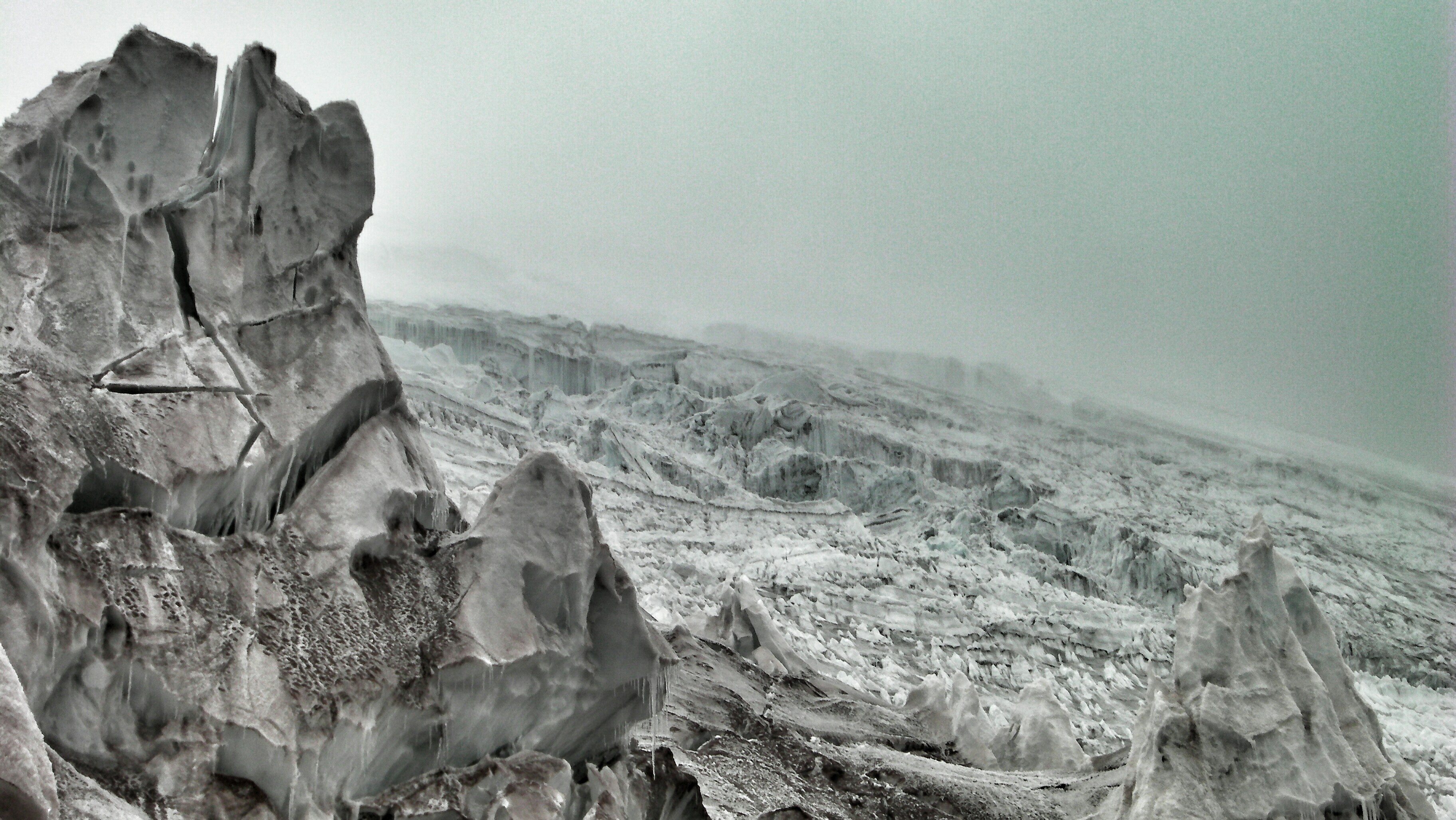 The outline of a single grey-blue stalagmite of ice came into view and then another, and then ten more – until finally they stretched all the way from where we stood to the summit of the volcano – nearly another 1000 metres.