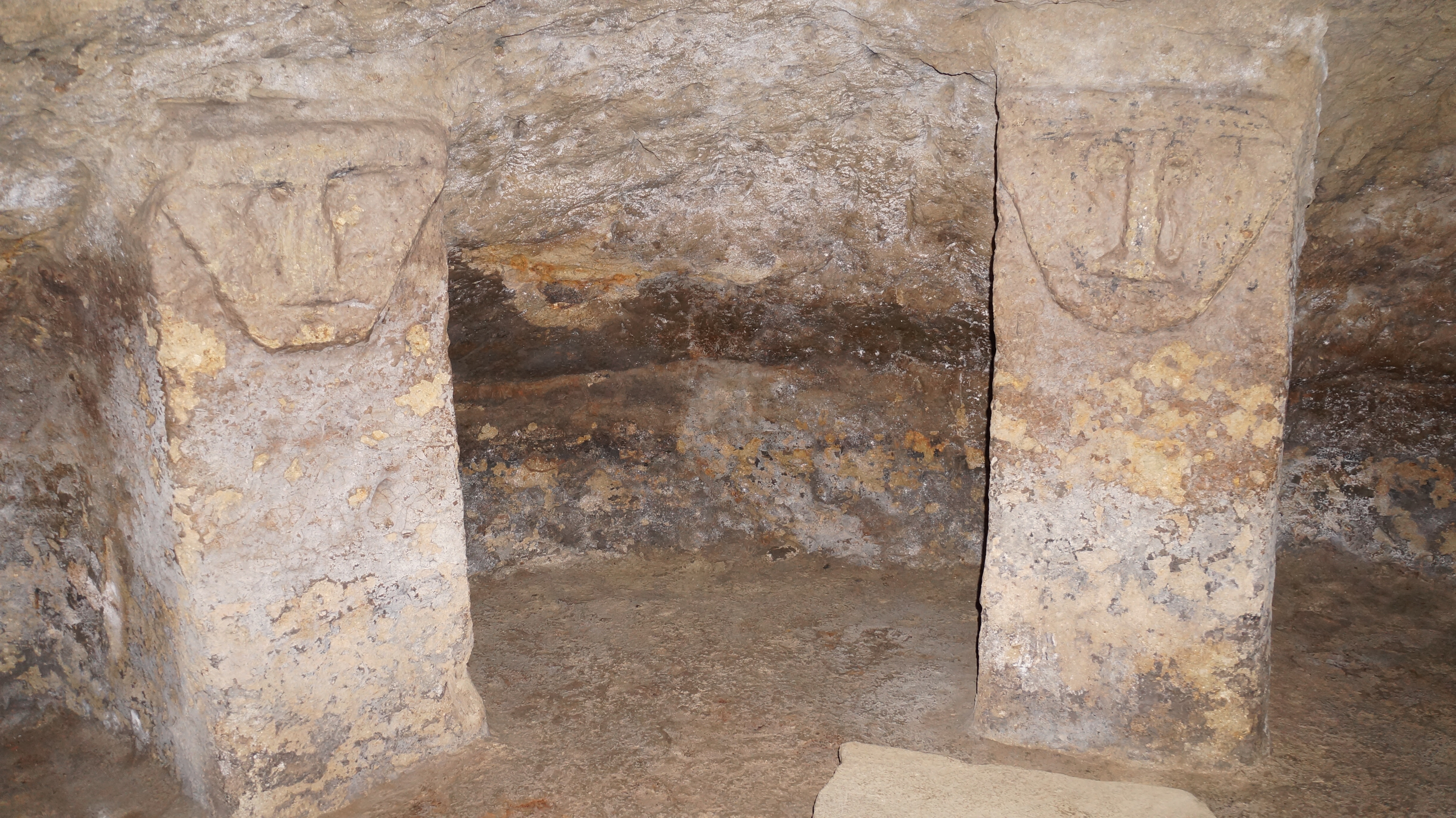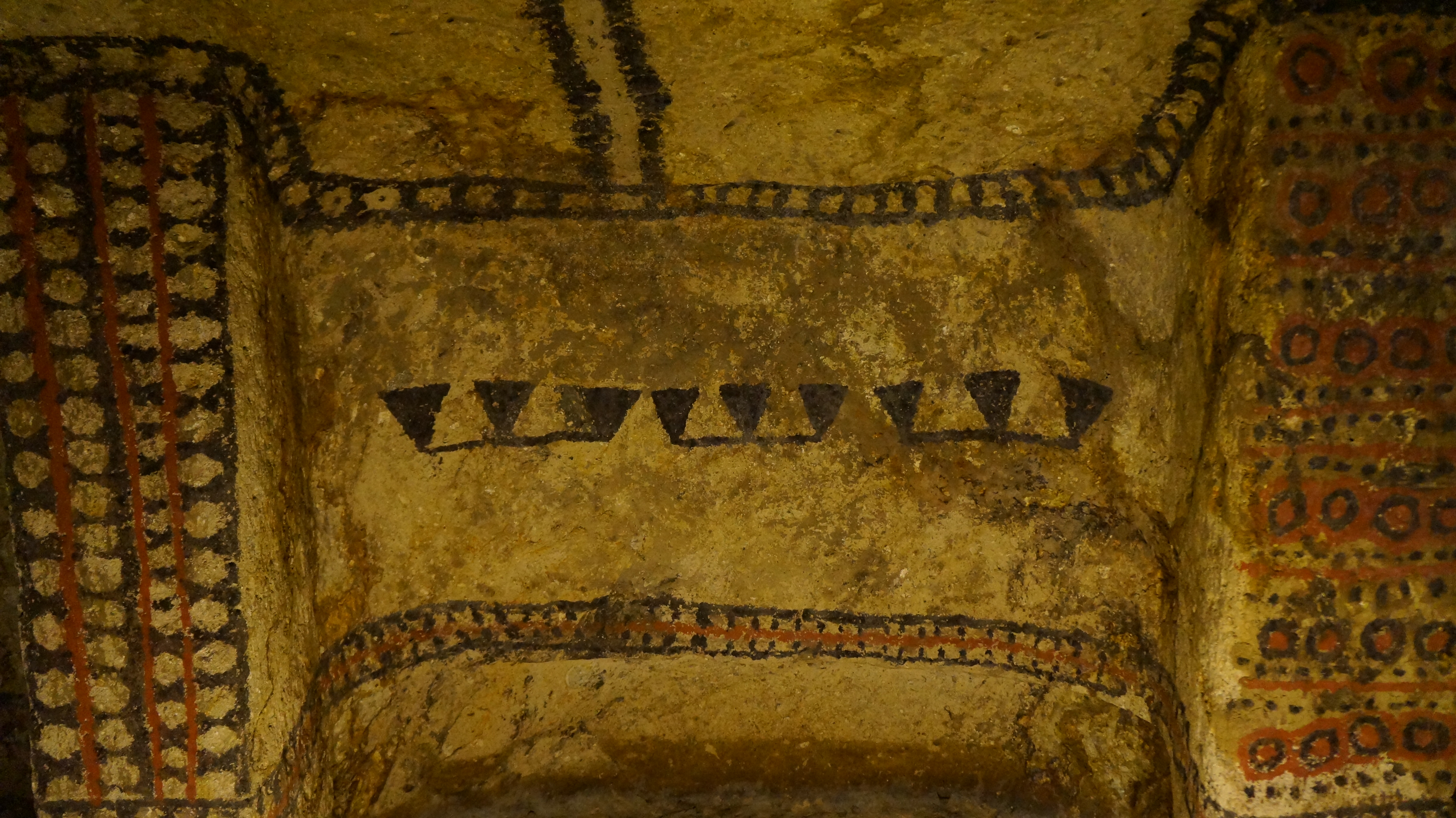 Some of the larger ones had domed ceilings and were supported by pillars. Some of the pillars had faces carved into them. These guardians would have looked after the bodies which once lay there. Many of the walls and pillars had been painted with striking red and black lines and patterns of white backgrounds and despite their age they were remarkably well-preserved.