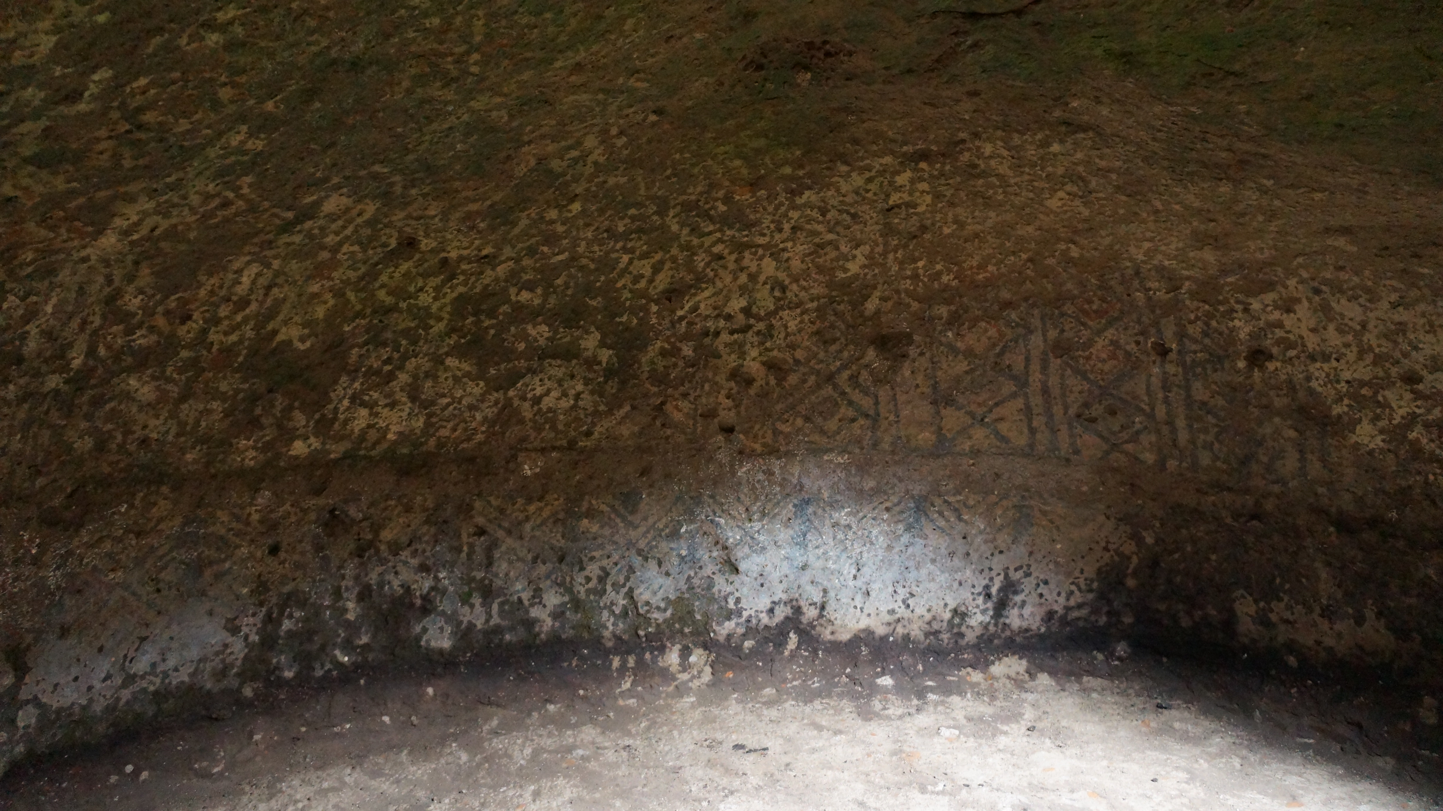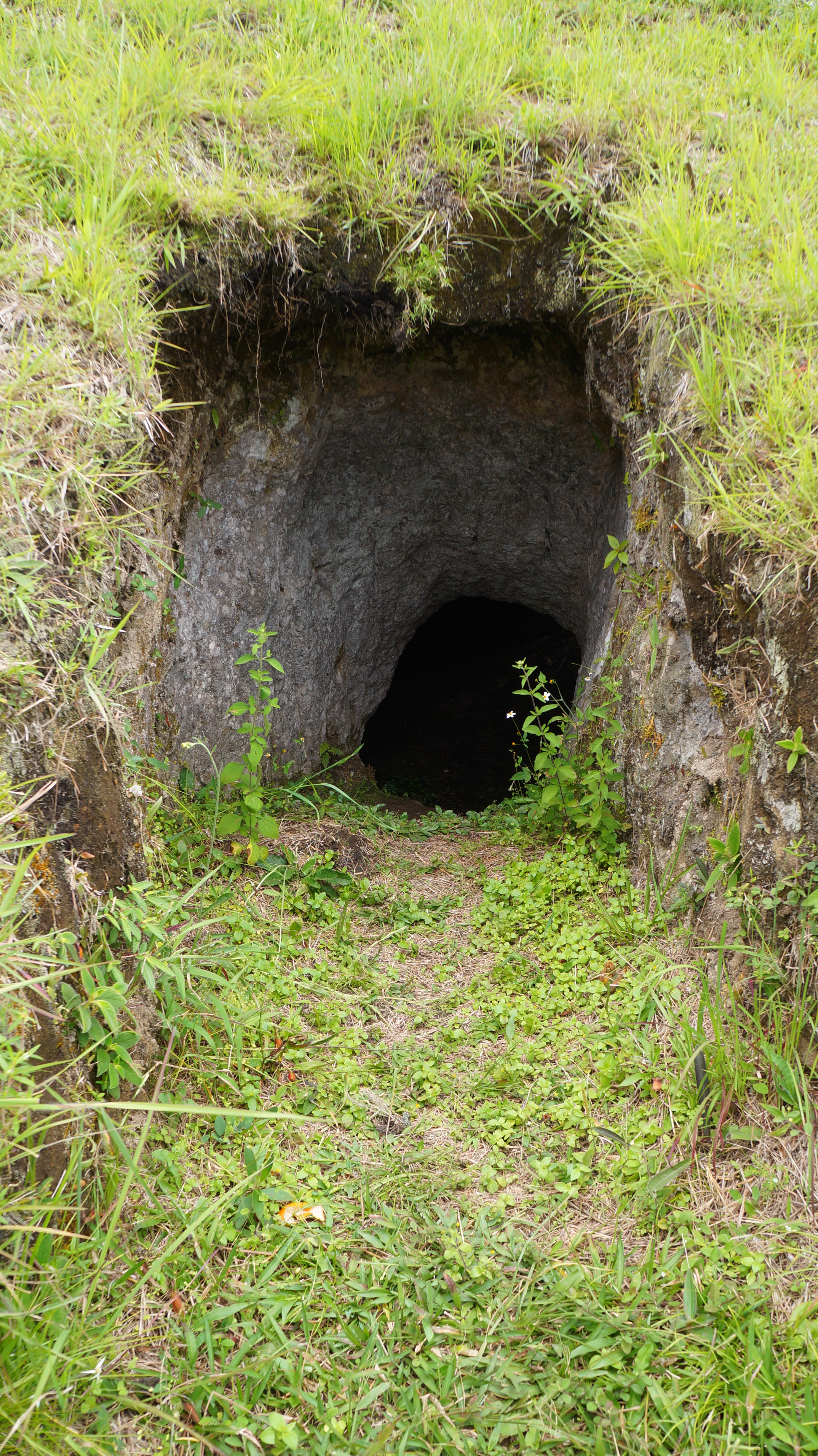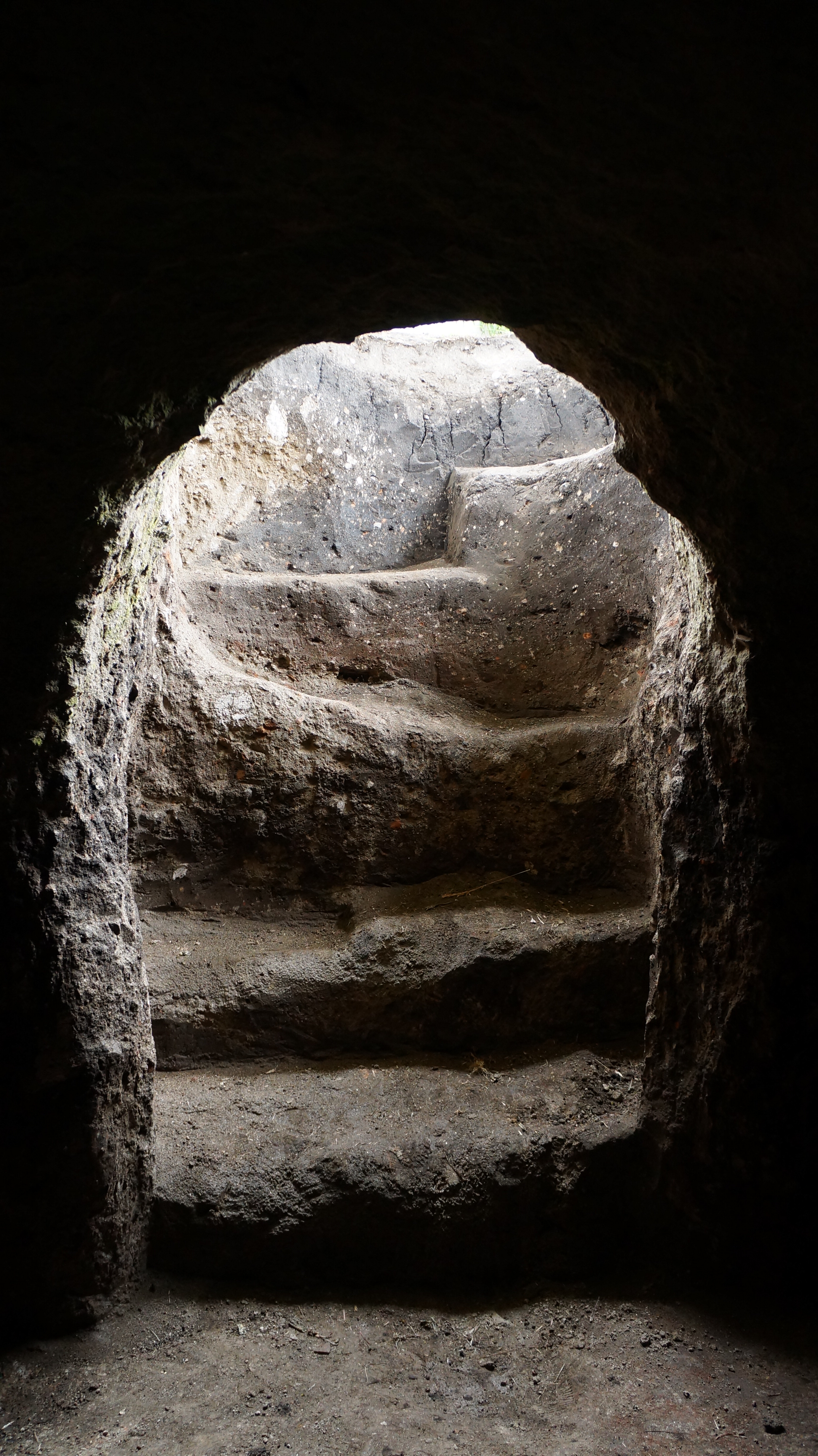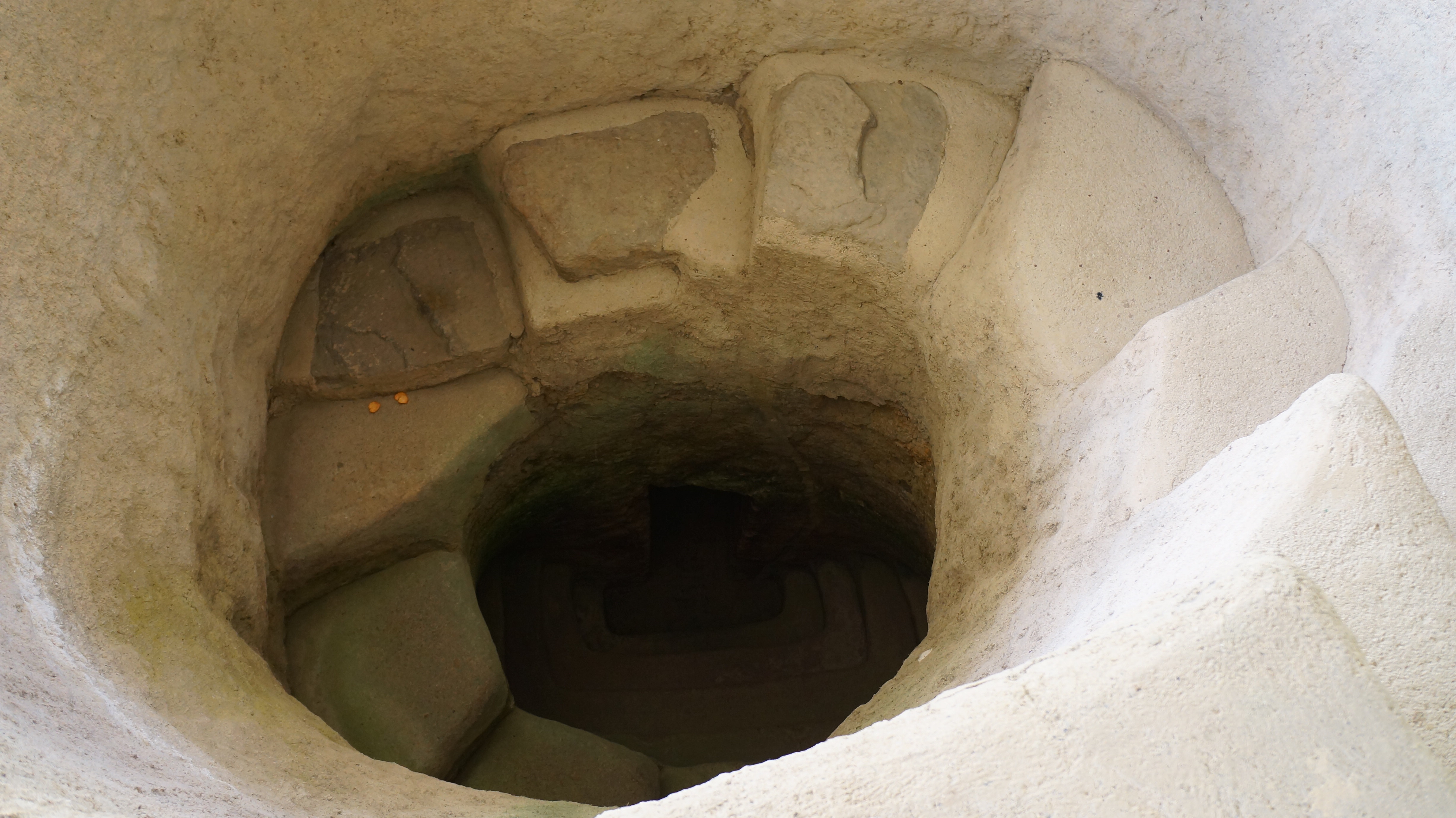 Dan was first to head down into the darkness. The steps were uneven and circled around the edge of the entrance. The initial step took him thigh deep and with the second he had disappeared from sight. The tombs all vary in height, with some appearing just below the surface of the earth and others up to nine metres deep. Stone in the area is soft volcanic matter which would have been scooped out by hand with basic tools and subject to cave ins. The size of the chambers would have varied according to the number of people buried there and the prestige of the person to be buried. It is generally believed that the more important people such as community leaders or spiritual men would have been given the largest tombs in the best locations.