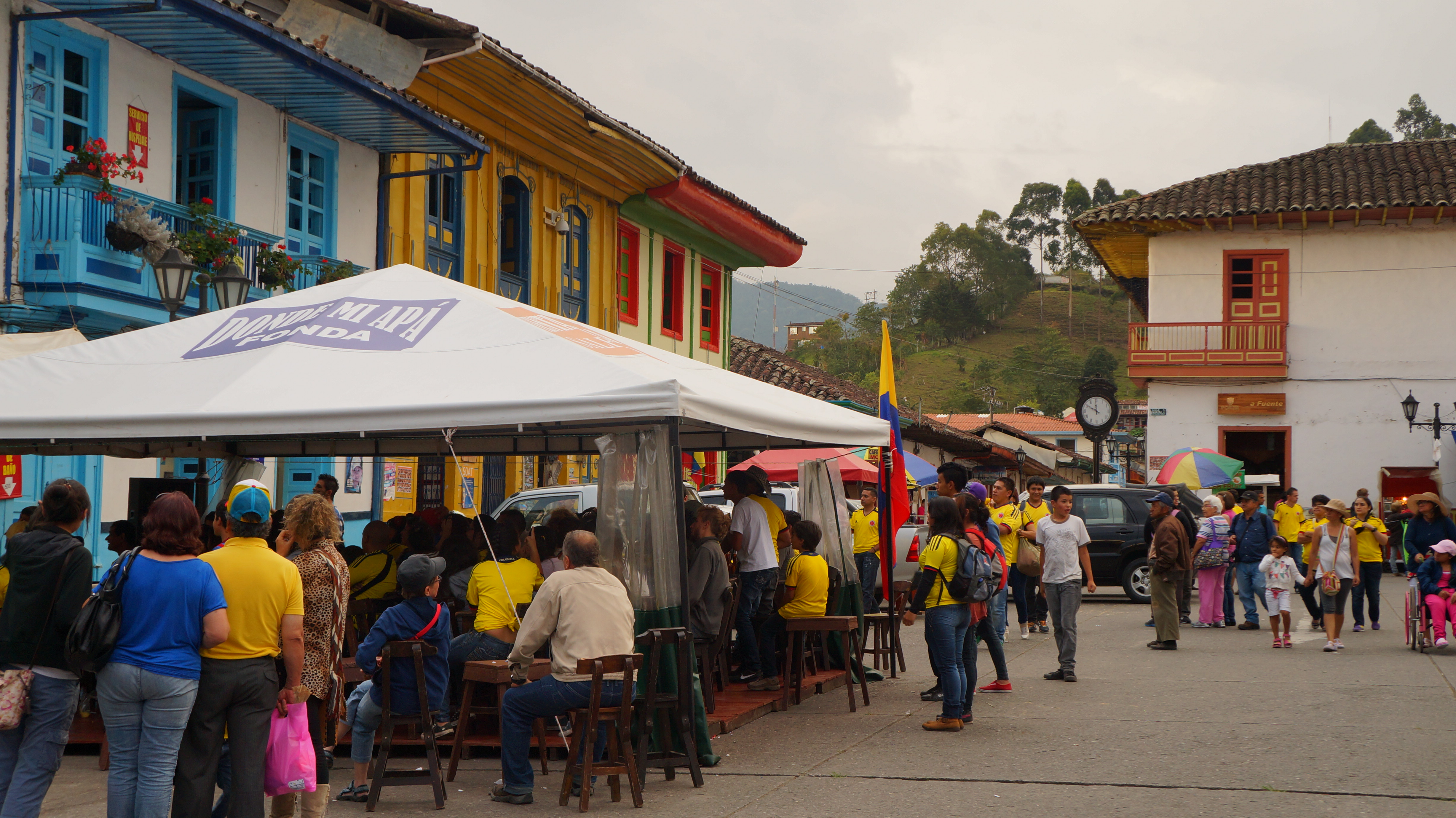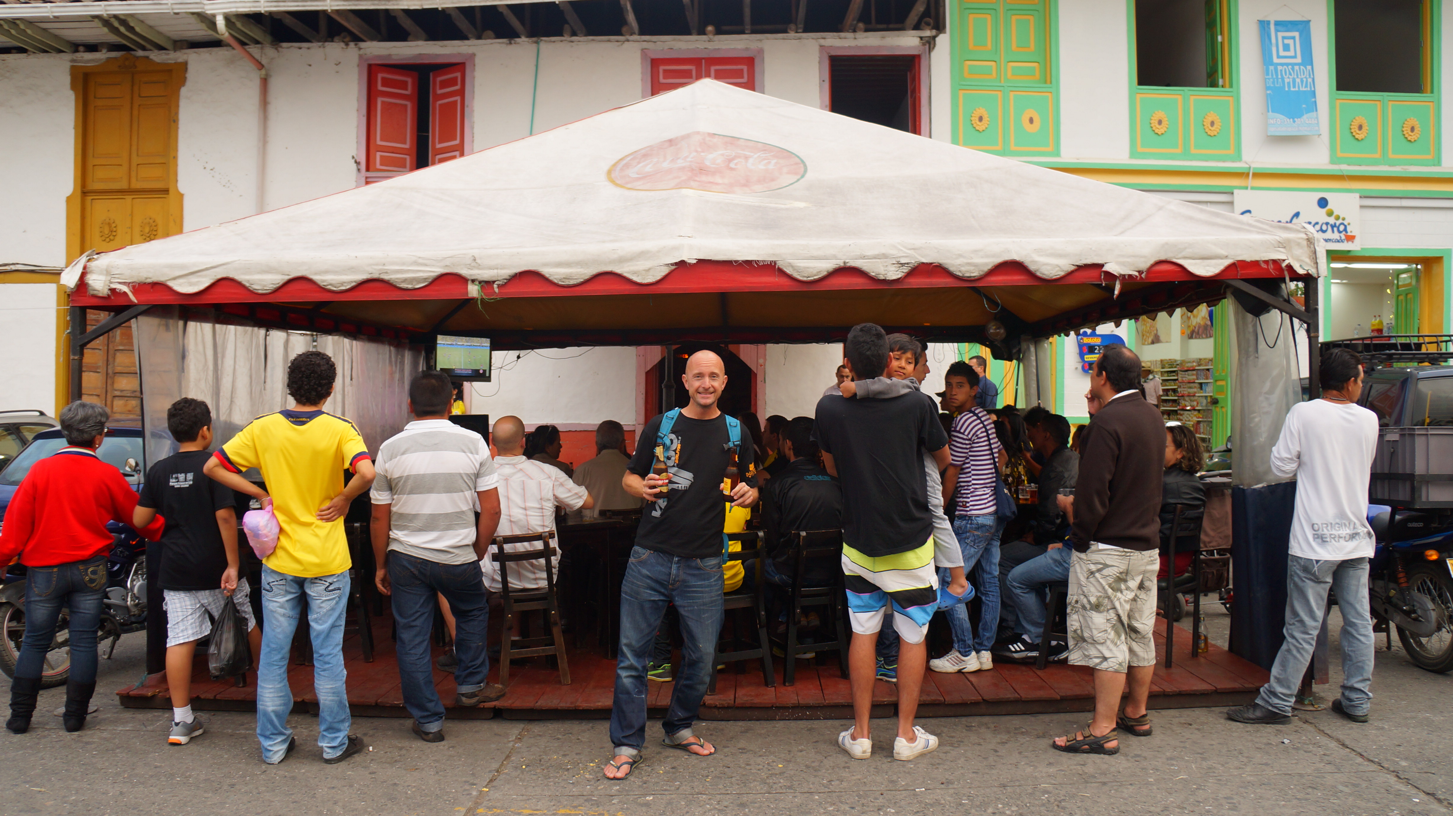 But it wasn’t coffee beans which caught our attention on our first day in town…it was beer! It happened to be a long weekend in Colombia and important football (soccer) World Cup qualifiers were being played. Many locals had the day off work, and, around the plaza, beer tents and food stalls had been set up. Big TV screens in the beer tents were showing a live game when we arrived and by coincidence it featured Colombia versus Chile.