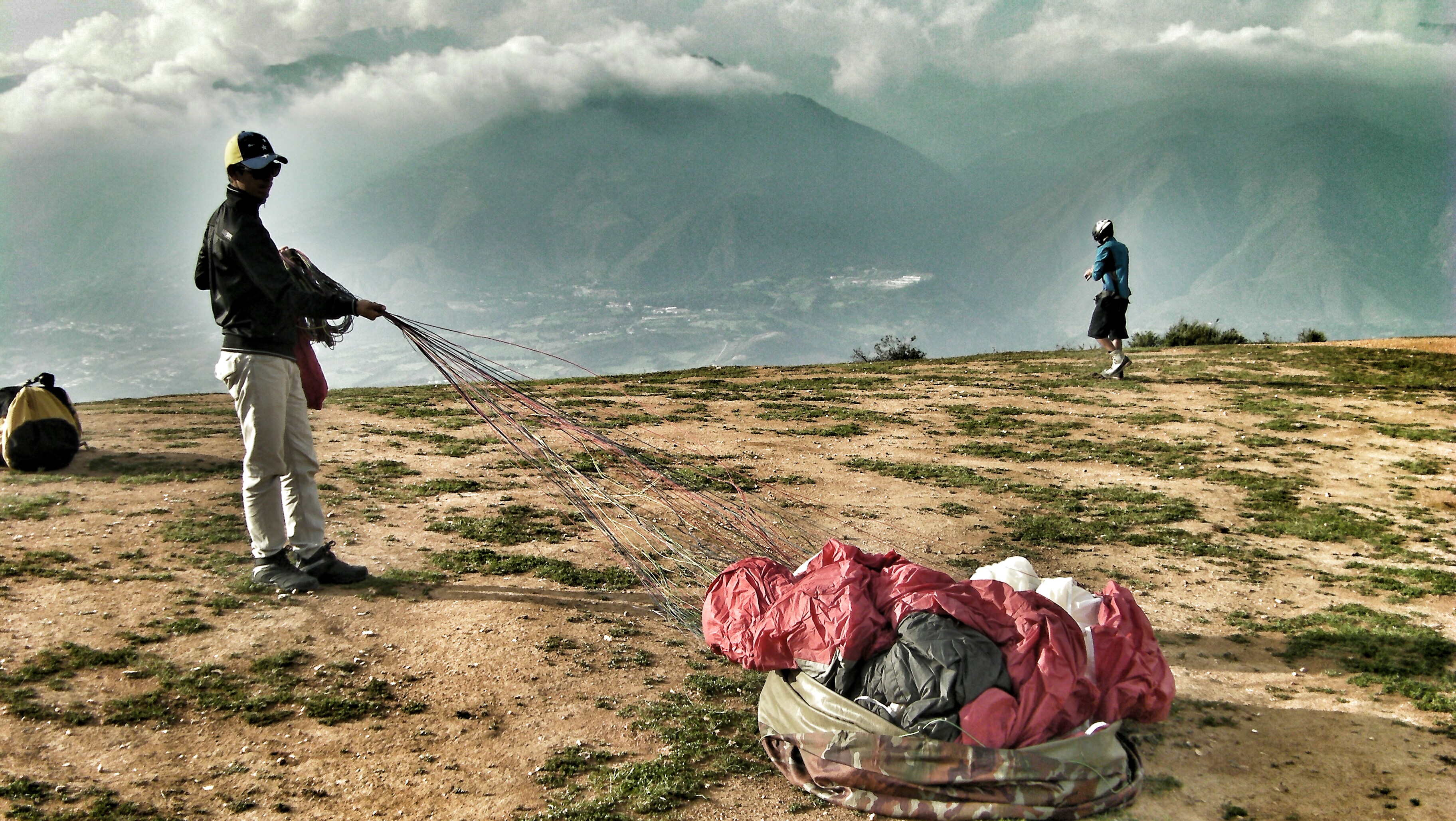We arrived at a high mountain ridge with beautiful 360 degree panoramas. The mountains were dry and dusty and the predominately brown range was scarred with landslides. It felt like we were eye level with the clouds that circled the mountain tops and we felt the gentle breeze that would hopefully help to propel us into the air.
