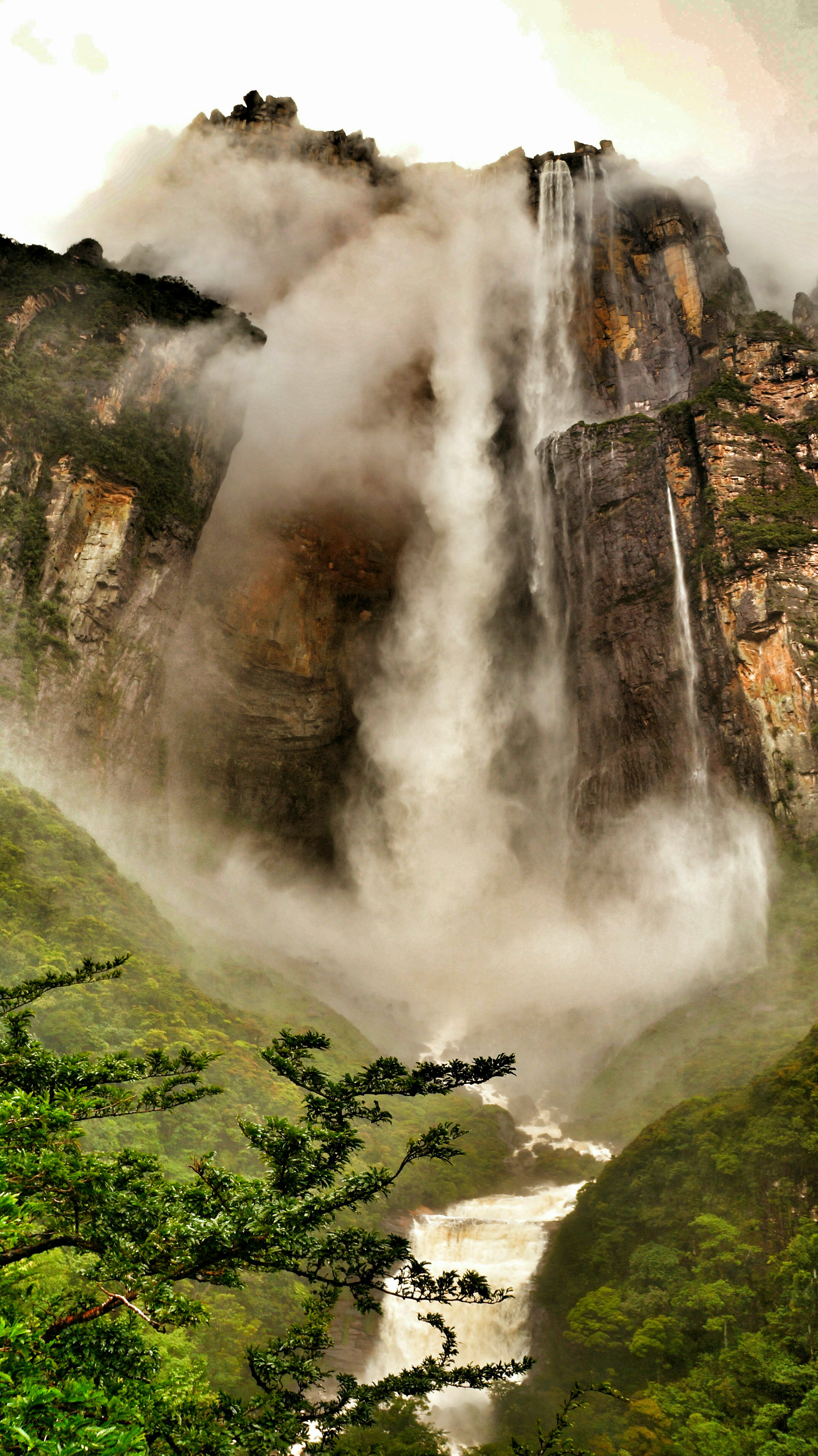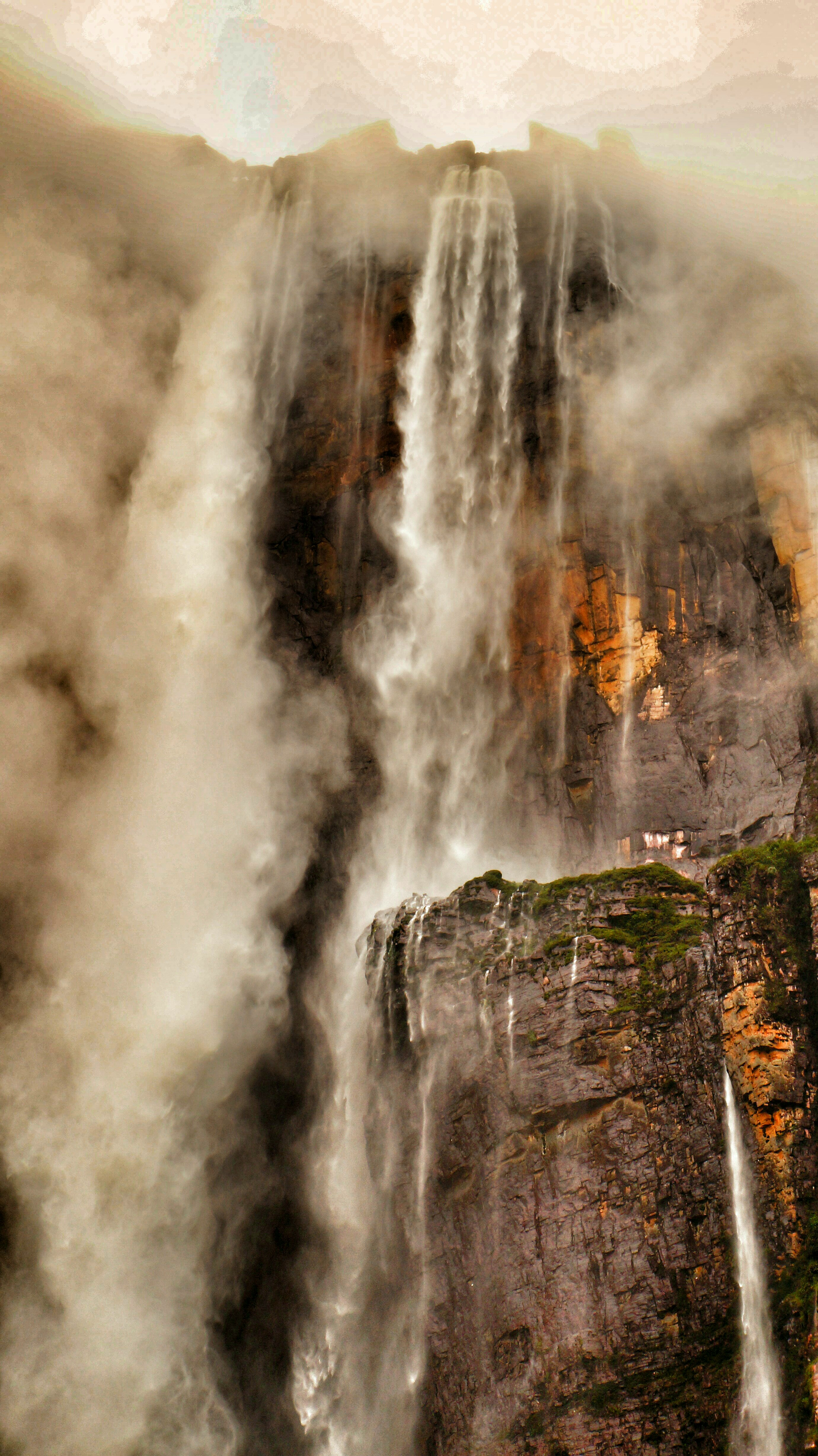 From a distance it appears that one single flow of water cascades over the edge of the Tepui, but closer inspection revels several outlets from where raging waters then collide and race to the ground. Down the face of the sheer rock, small platforms jutted out and broke the water’s fall for a split second before cascading over its edge again.