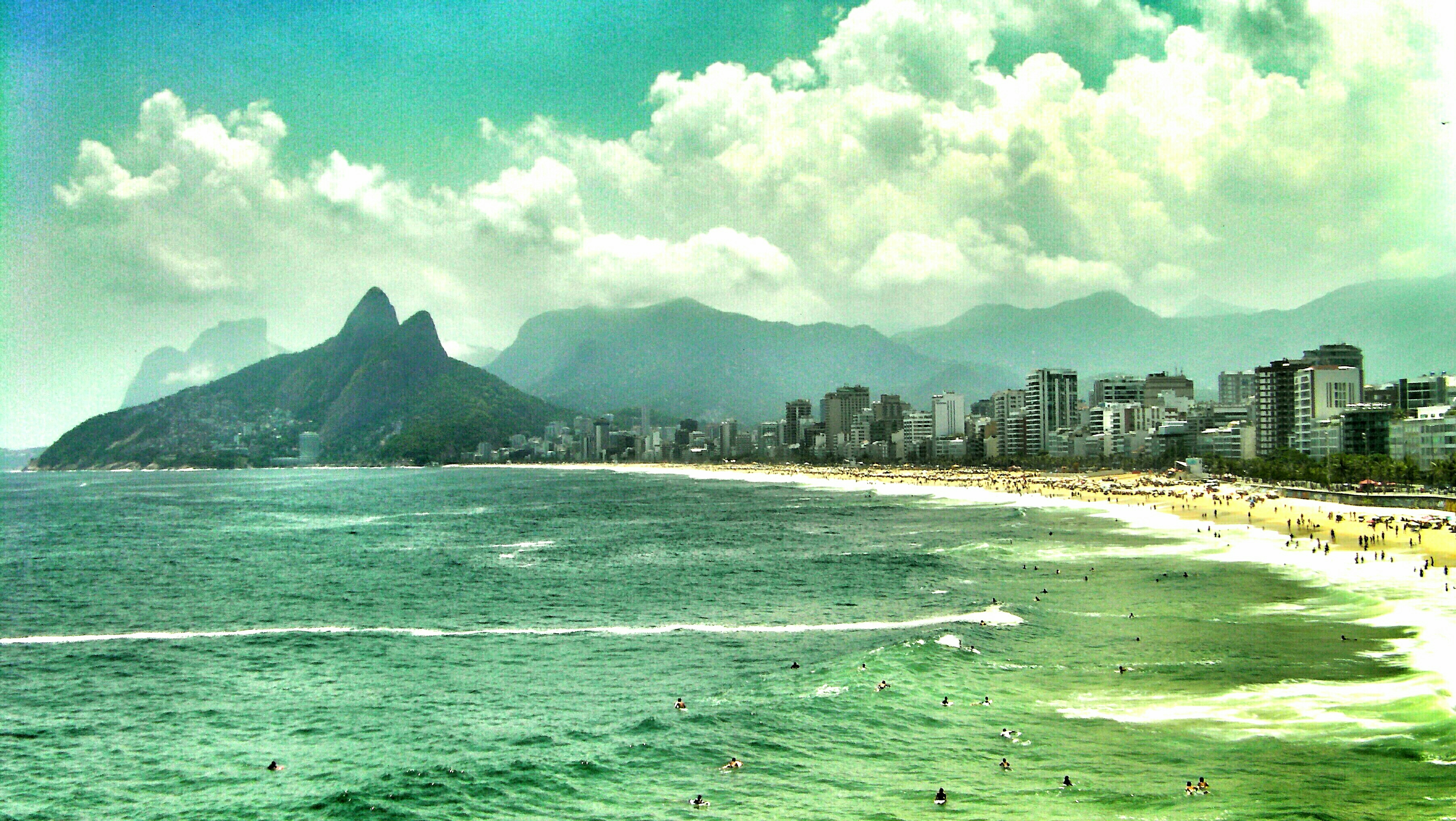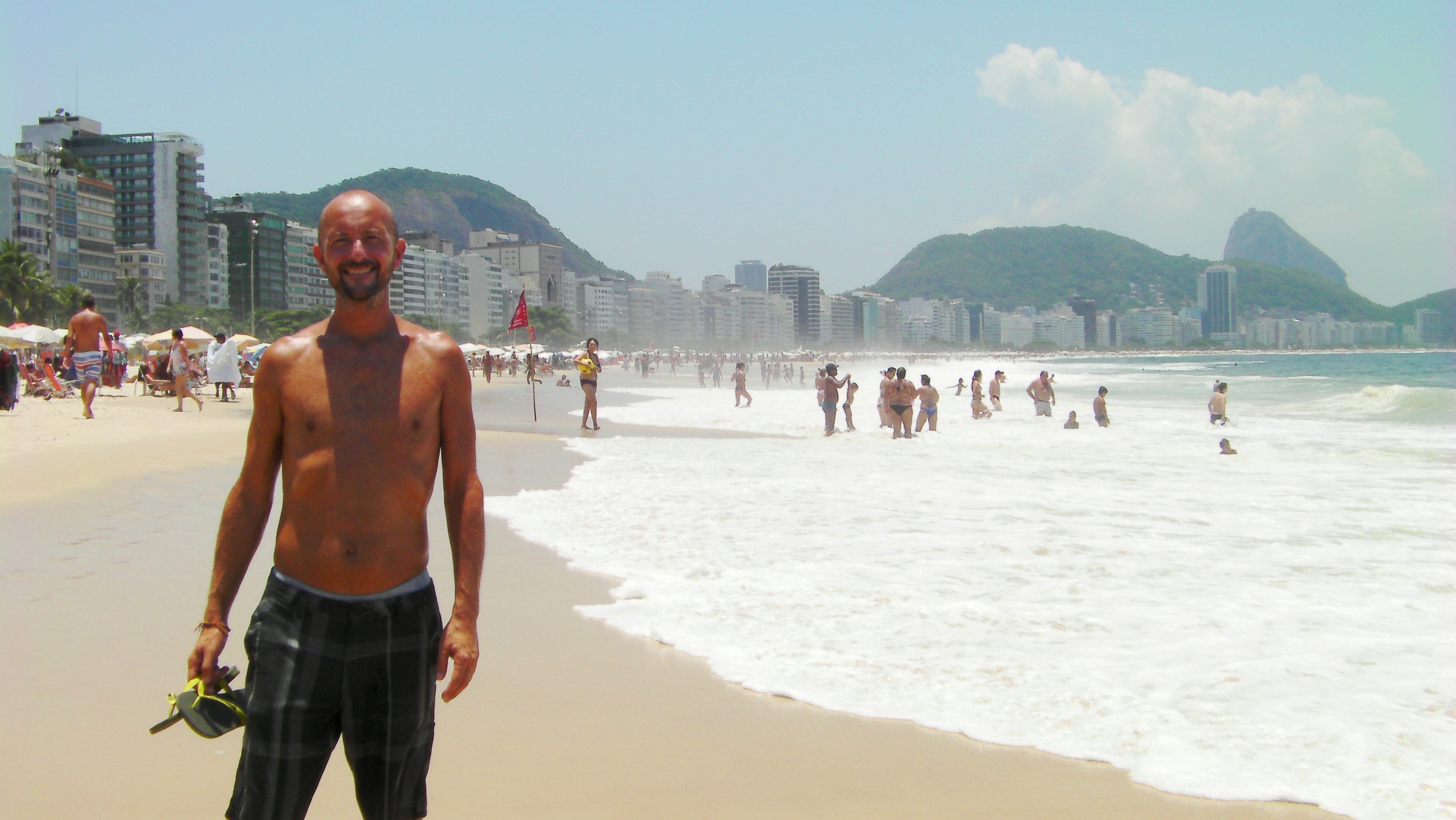 Locals and tourists bronze themselves as the mercury levels rocket skywards with figure hugging shorts and tiny bikinis resembling dental floss the norm! Behind the sunbathers energetic games of football and volleyball are played with skill and precision. Families cool off in the sea jumping into the waves. Kids from favelas flip and twist on boogie boards in the churning surf close to shore whilst toned surfers catch the bigger breaks further out.